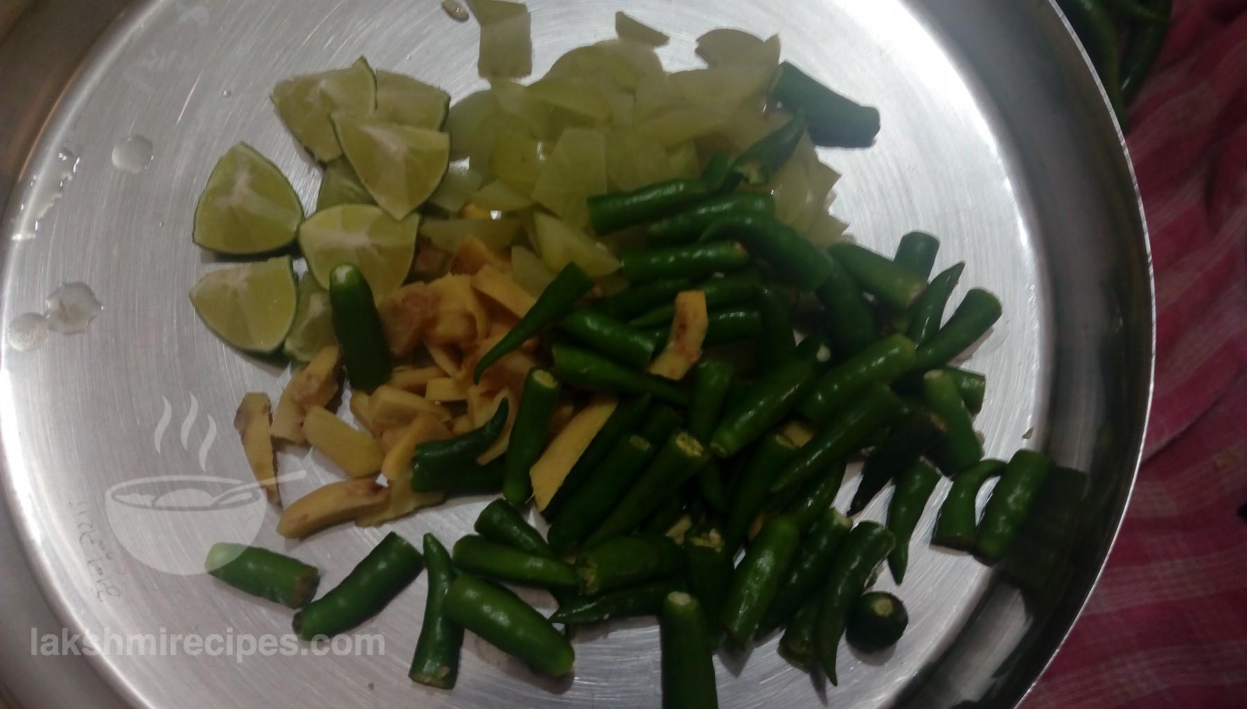 - After one hour, remove the stems of the green chillis (hari mirch) and cut the Indian gooseberries (amla) into small pieces after removing their seeds. Peel the ginger (adrak) and cut both the ginger (adrak) and lemon (nimbu) into small pieces.