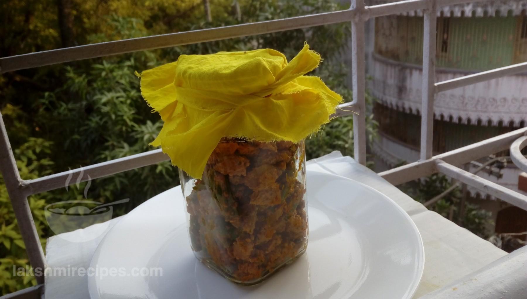 - Then remove the cloth and close the jar with its lid and leave the achaar at rest for preparation for 20 days. (you need not keep the achaar in the sunlight anymore)
