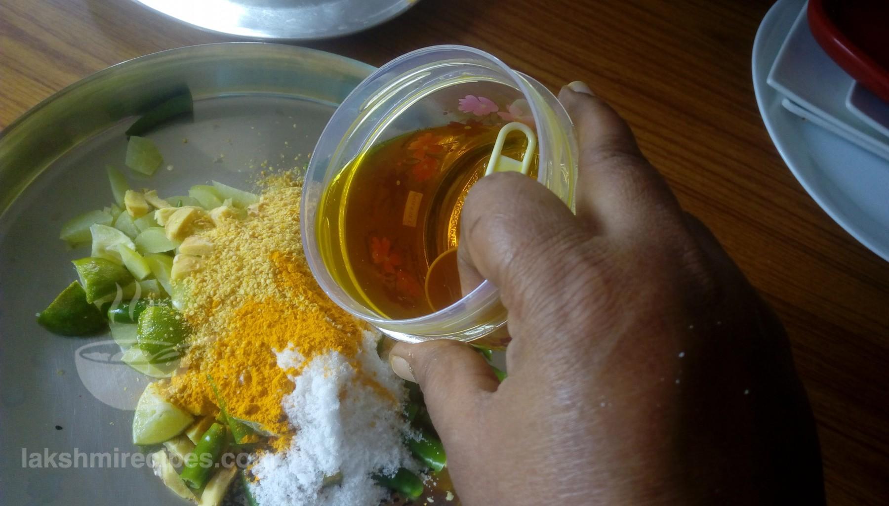 (Tips: 1. Pat the ingredients (hari mirch, adrak, amla and nimbu) dry well after washing, because if the moisture remains it may rotten the achaar; 2. Wash the glass jar well and pat it dry too. Also, keep the jar in the sunlight for 1 hour, before you transfer the raw achaar to it; 3. Increase the amount of oil in the achaar after 20-25 days, only if required.)