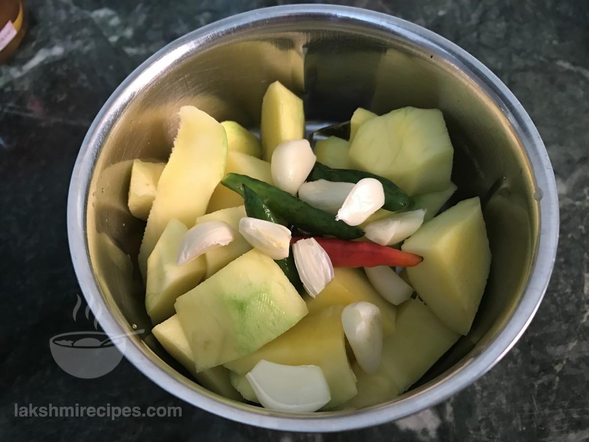 - अब आम के गूदे को छोटे-छोटे टुकड़ों में काट लें, लहसुन की पंखुड़ी छीलकर, हरी मिर्च का स्टेम काट लें और मिर्च को सादे पानी से धो लें।