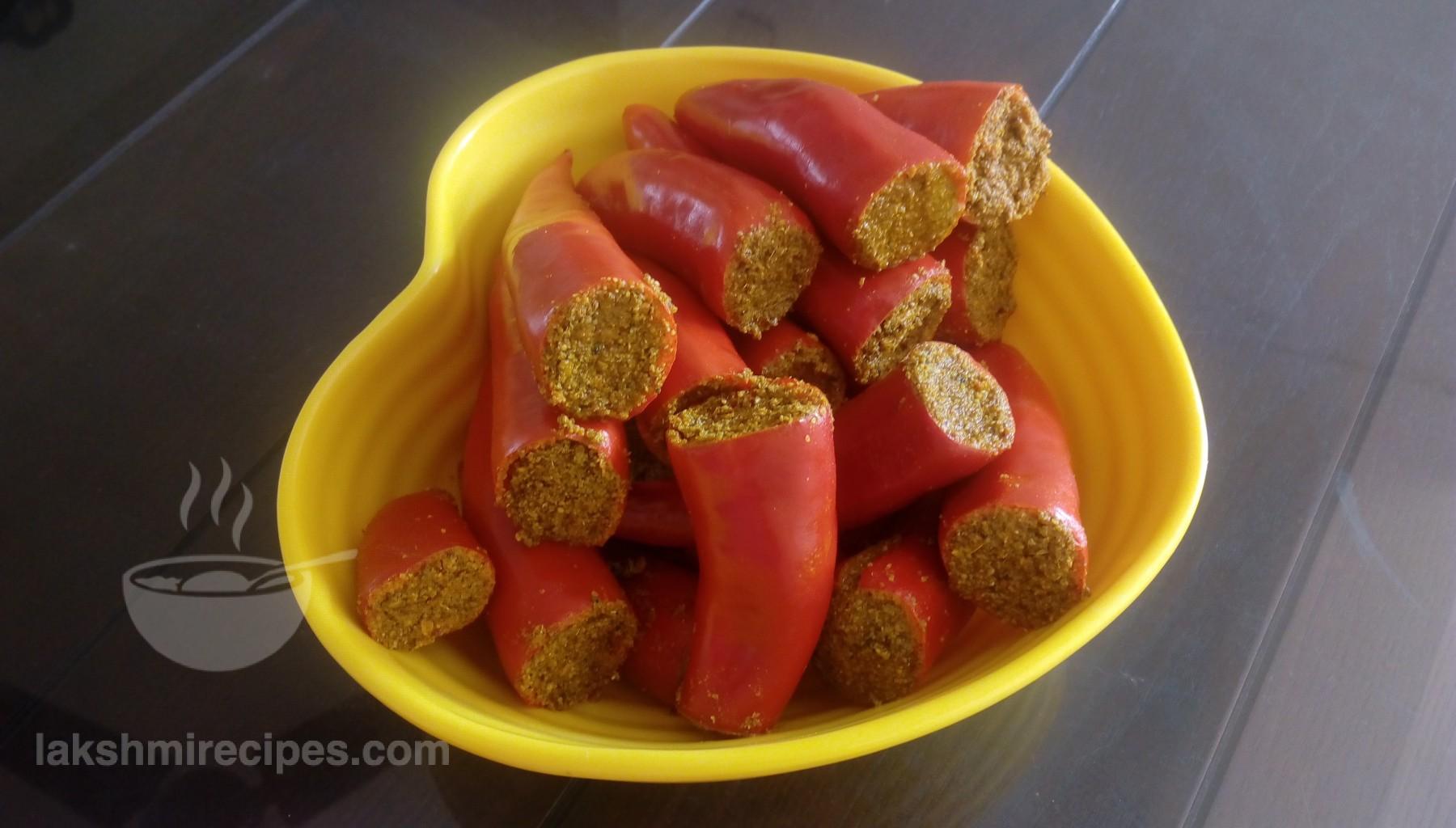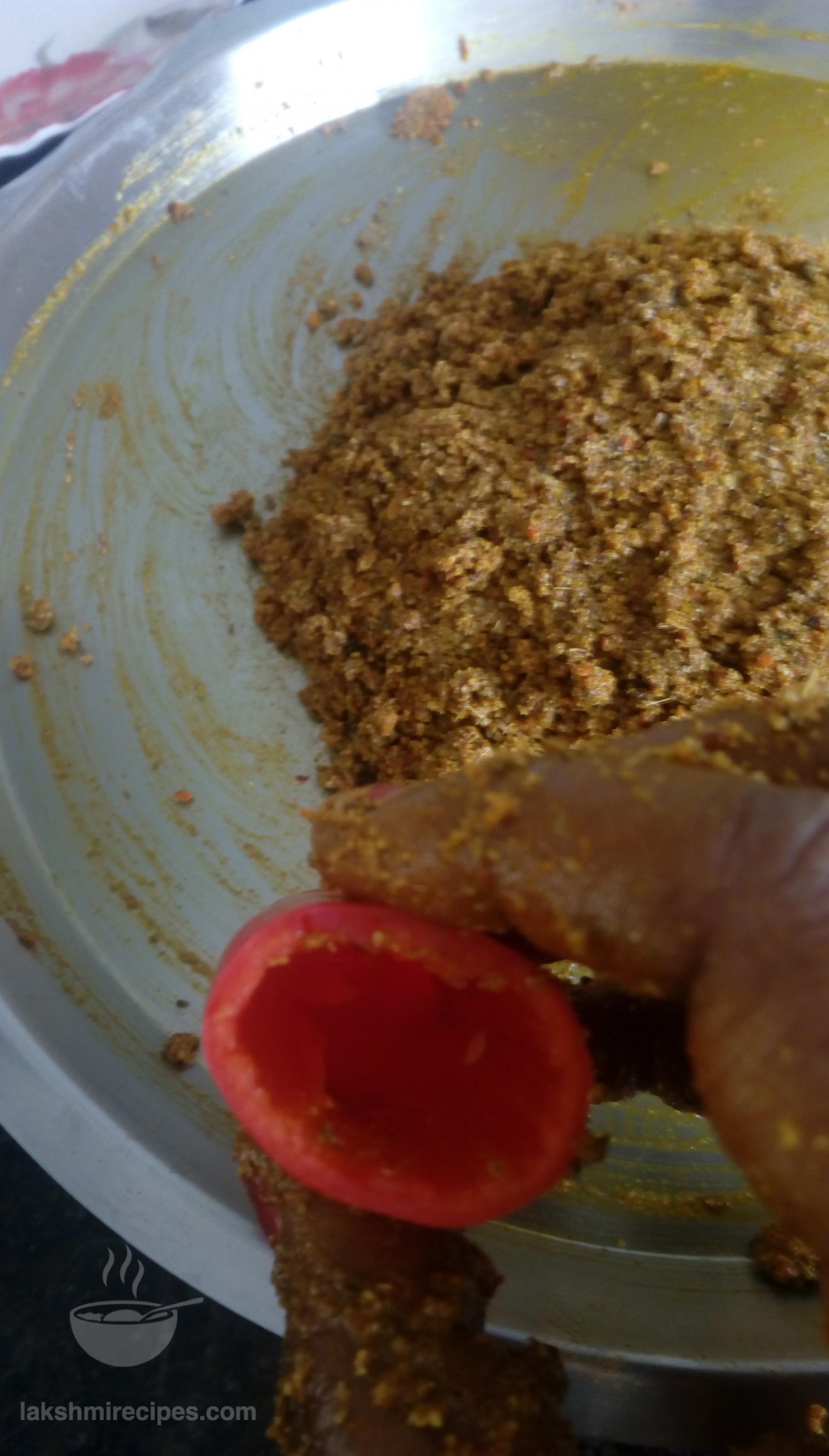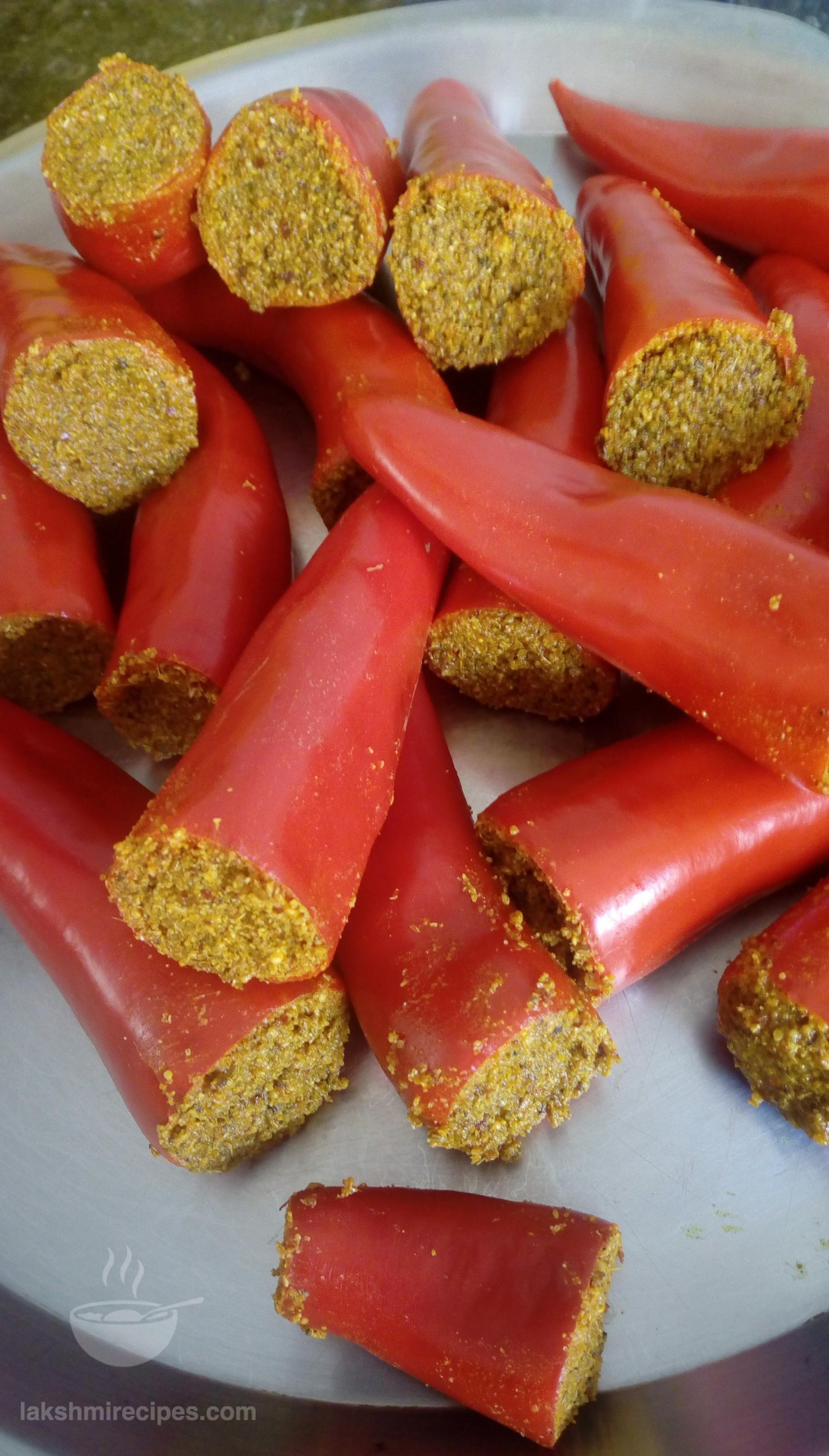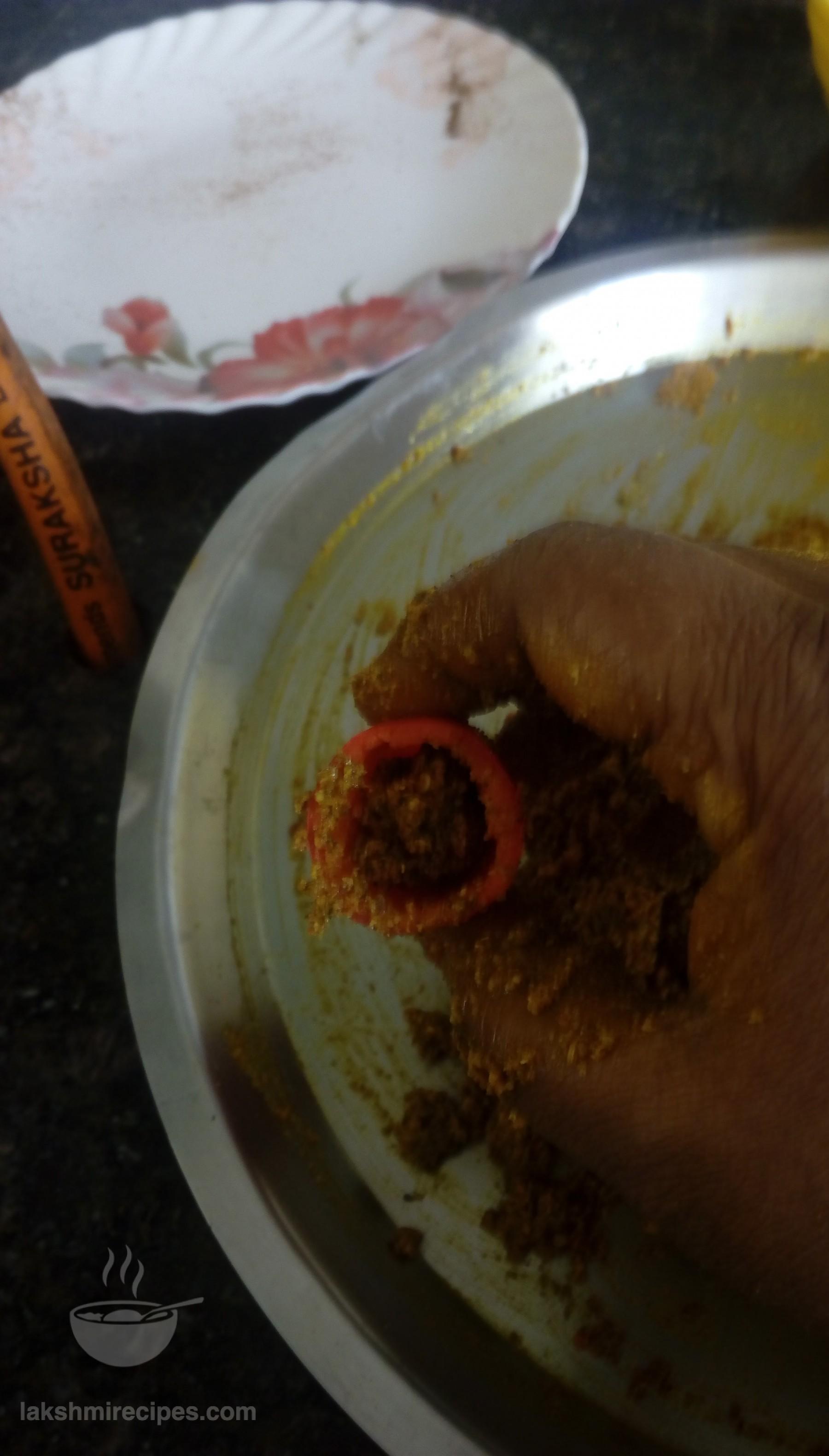 - After this start stuffing the masala prepared in these hollow big sized red chillis (achaar wali badi lal mirch). Press and stuff the masala in each chilli one by one.