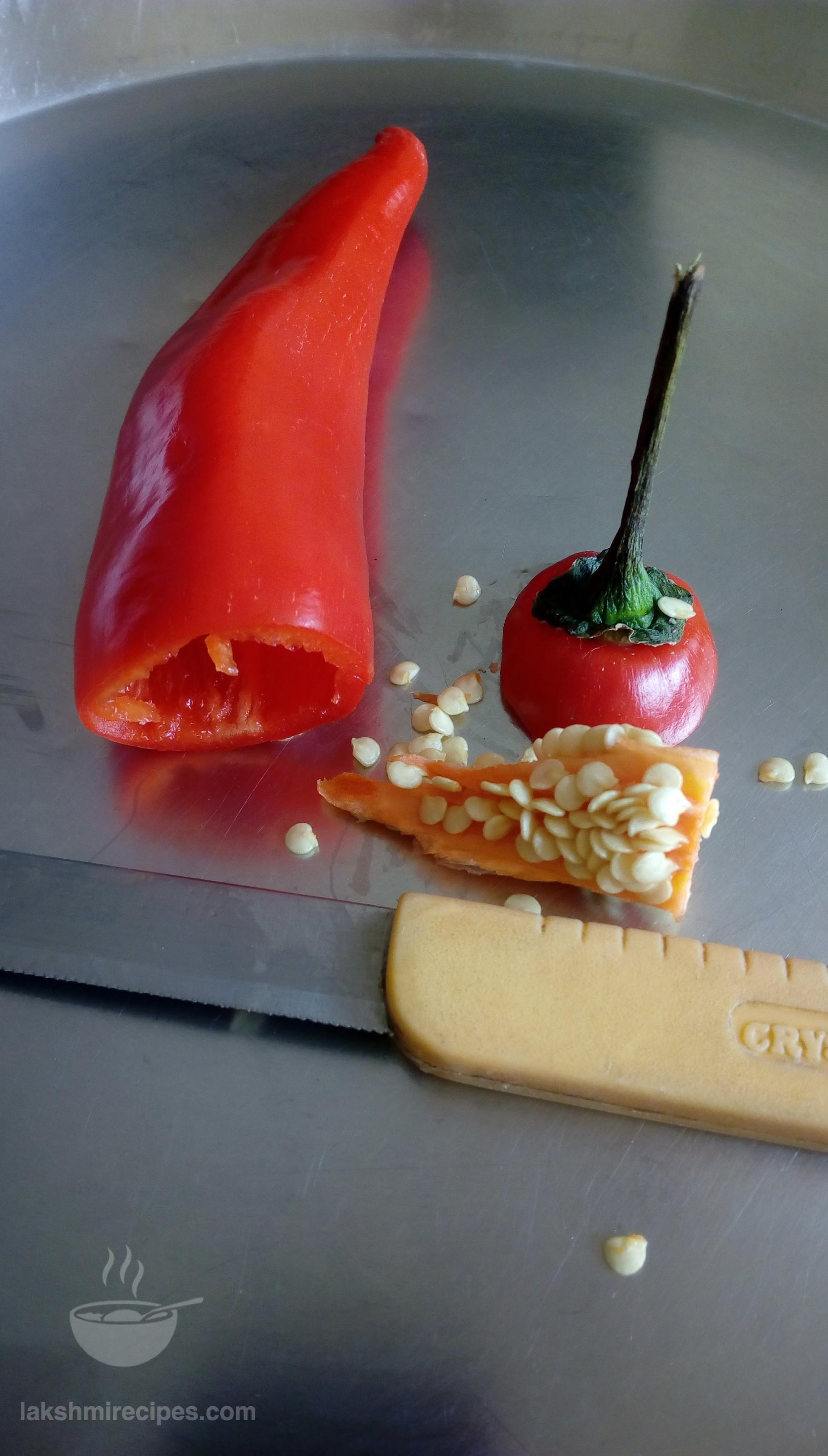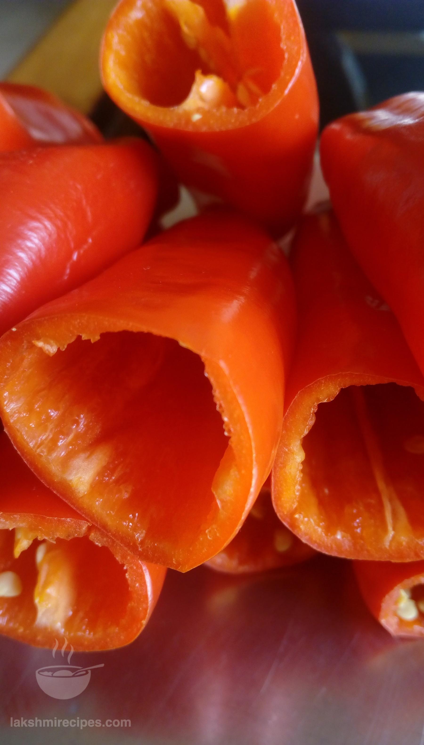 - Now remove the green stem of the big sized red chillis (achaar wali badi lal mirch) and cut it from the top to form cones of the big sized red chillis (as shown in the image below). Then remove the seeds of the big sized red chilli (achaar wali badi lal mirch) with the help of knife, to prepare it for stuffing. Prepare the remaining big sized red chillis (achaar wali badi lal mirch) in the similar manner.