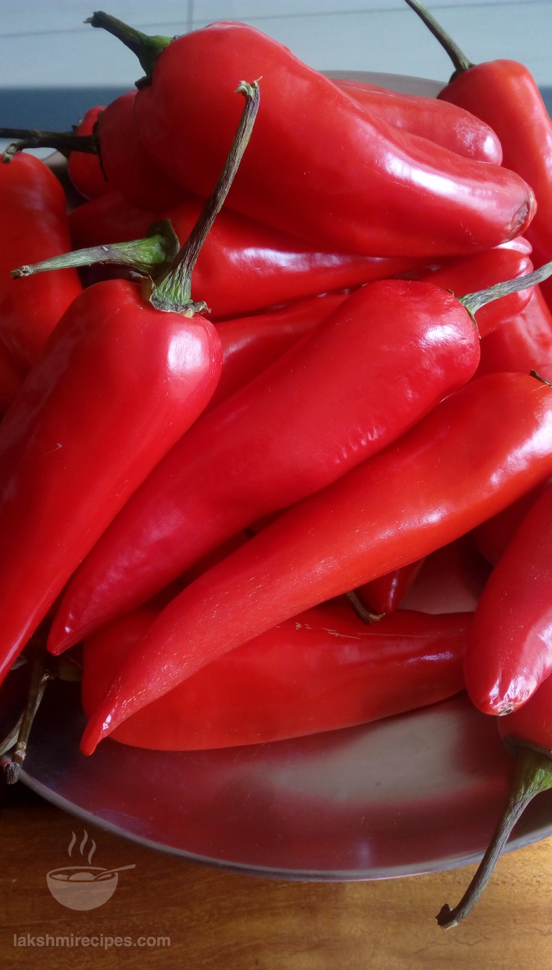 - Wash the big sized red chillis (achaar wali badi lal mirch) well with plain water and then pat them dry with a clean cotton cloth. Then keep these big sized red chillis in the sunlight for 2 hours.