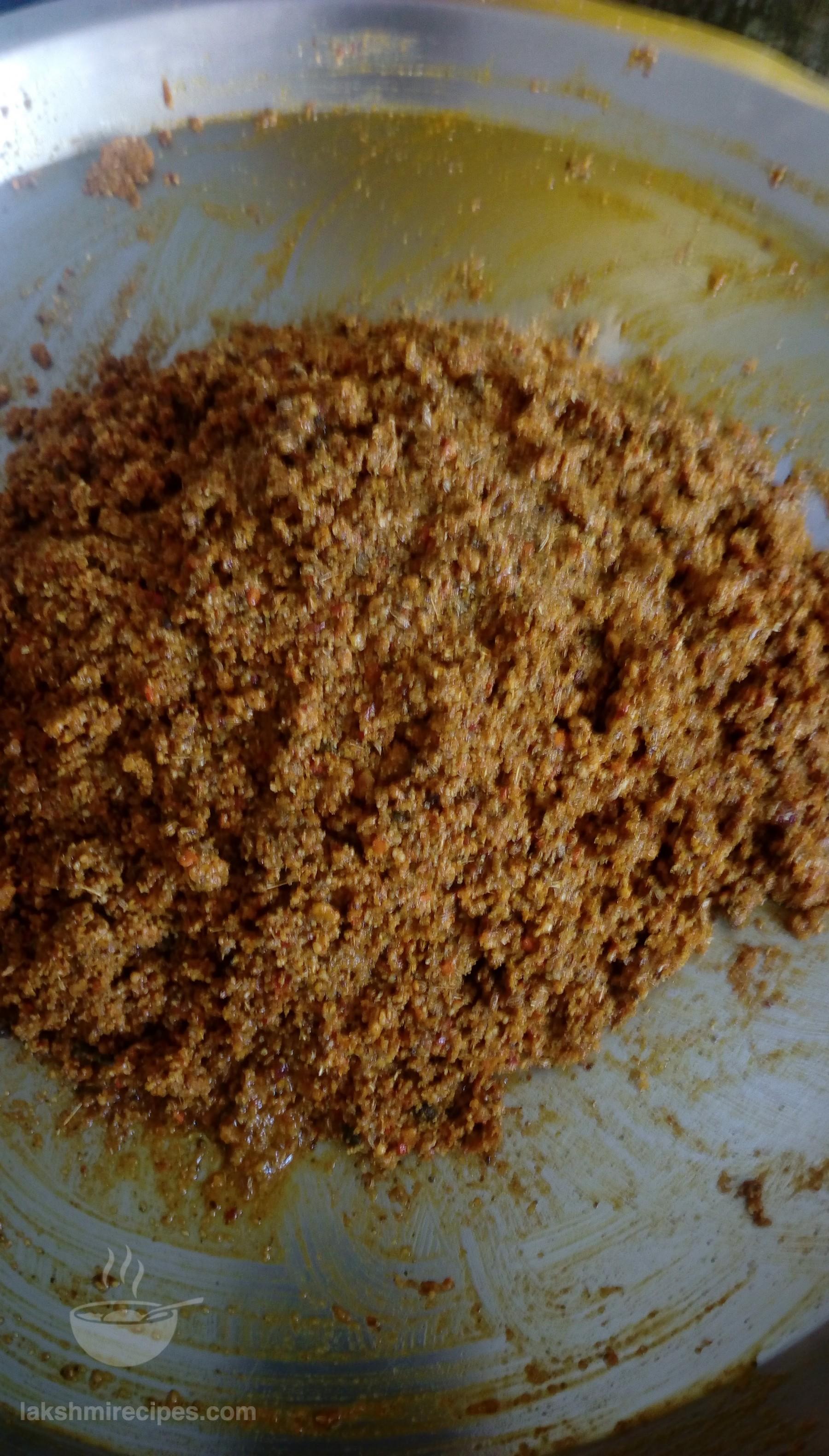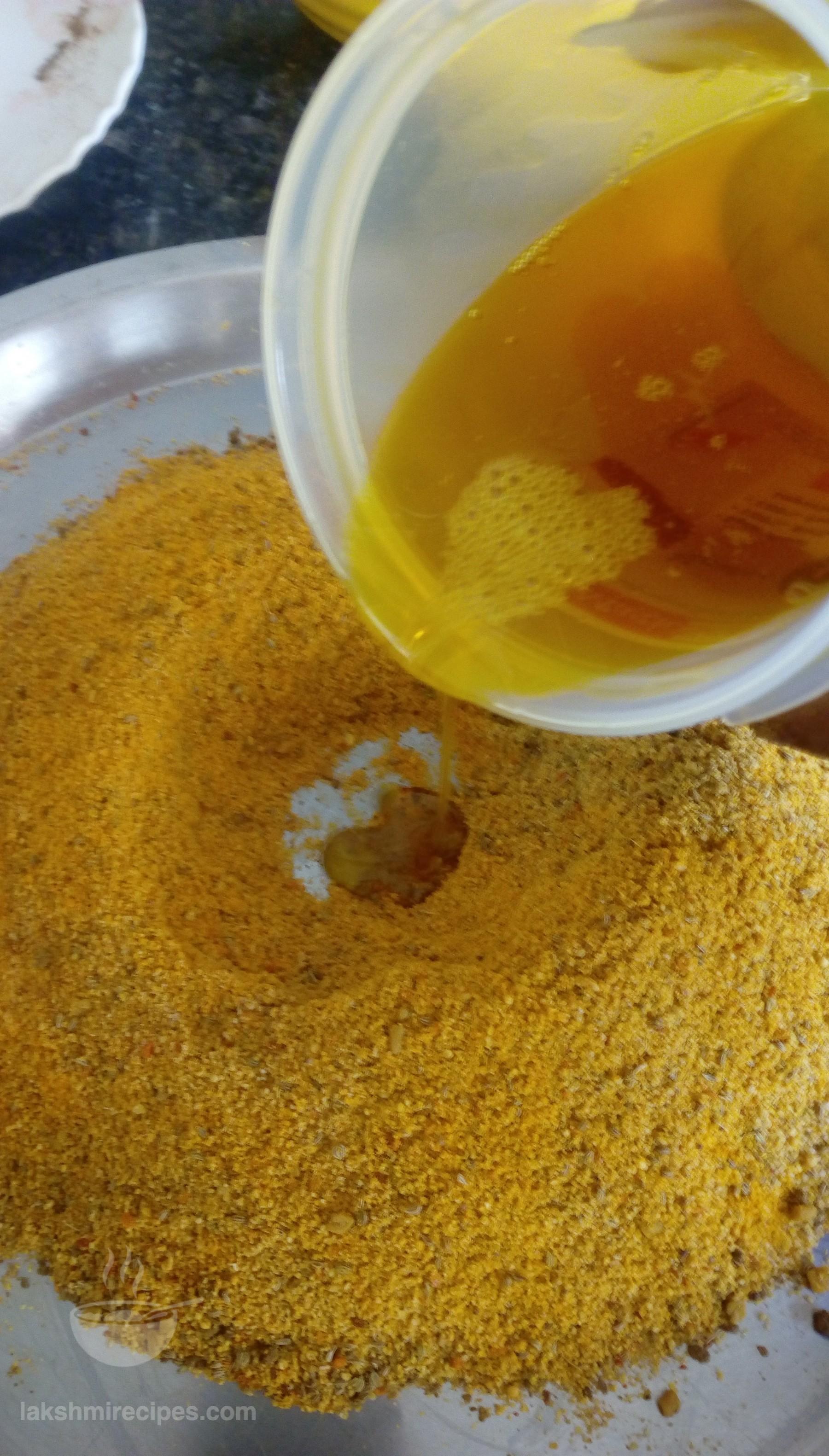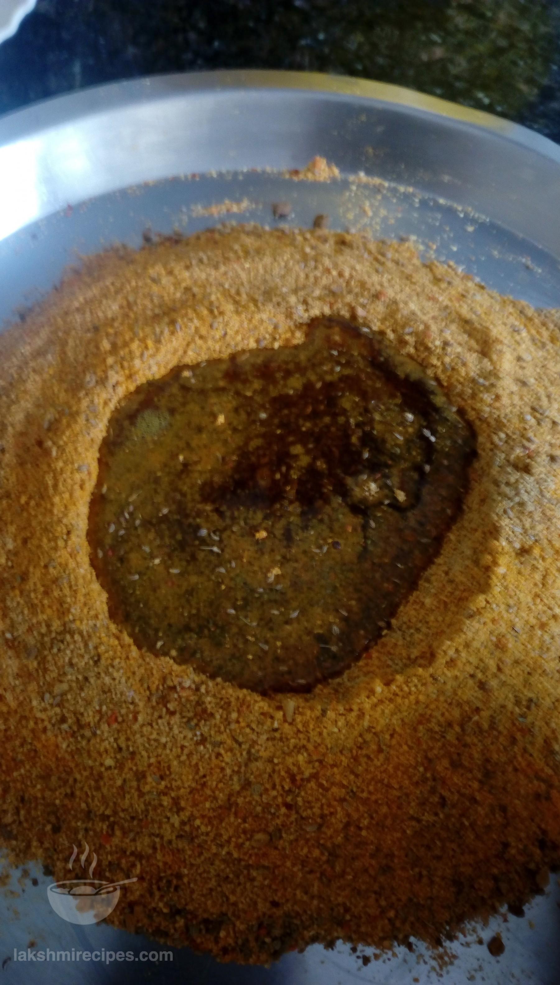 - Now add raw mustard oil (kachcha sarson ka tel) to the dry masala and mix well.
