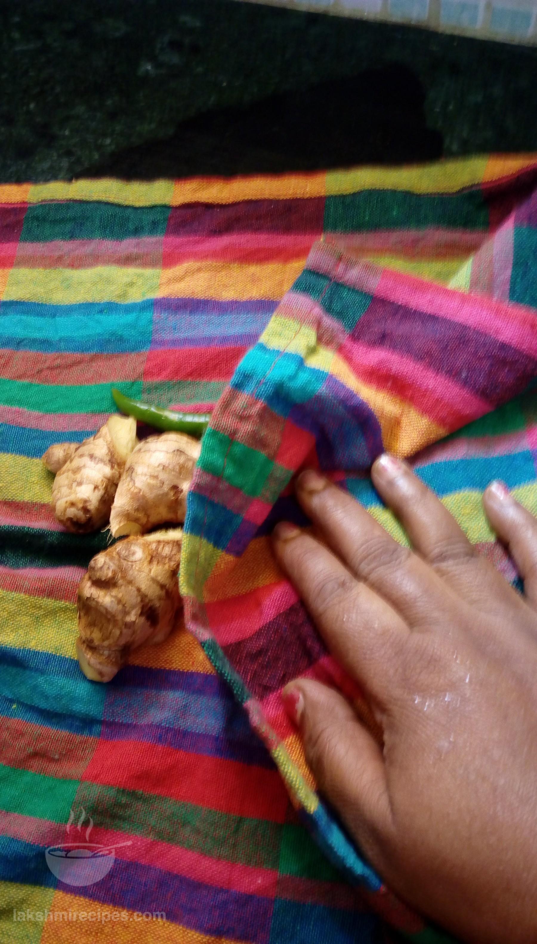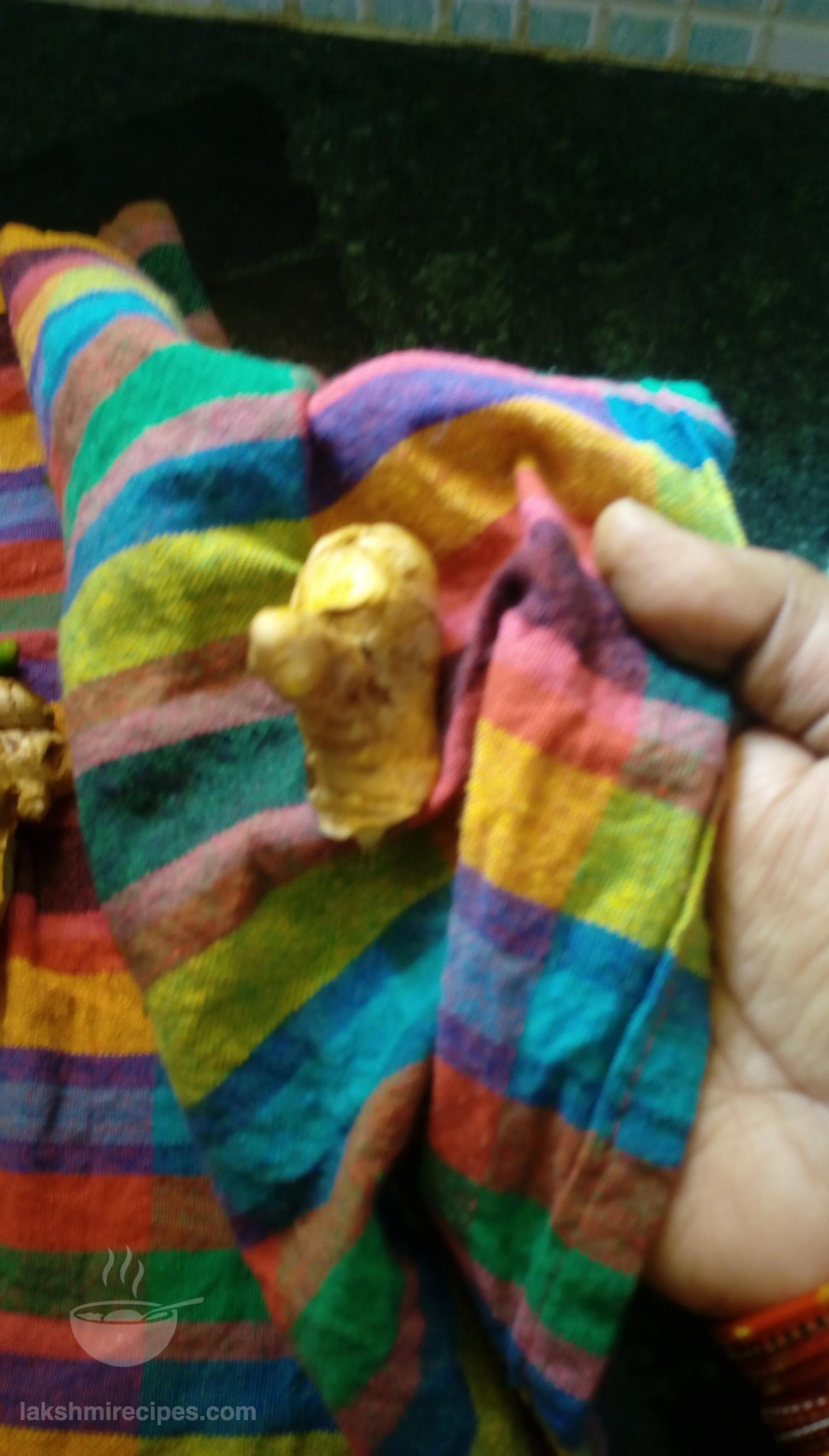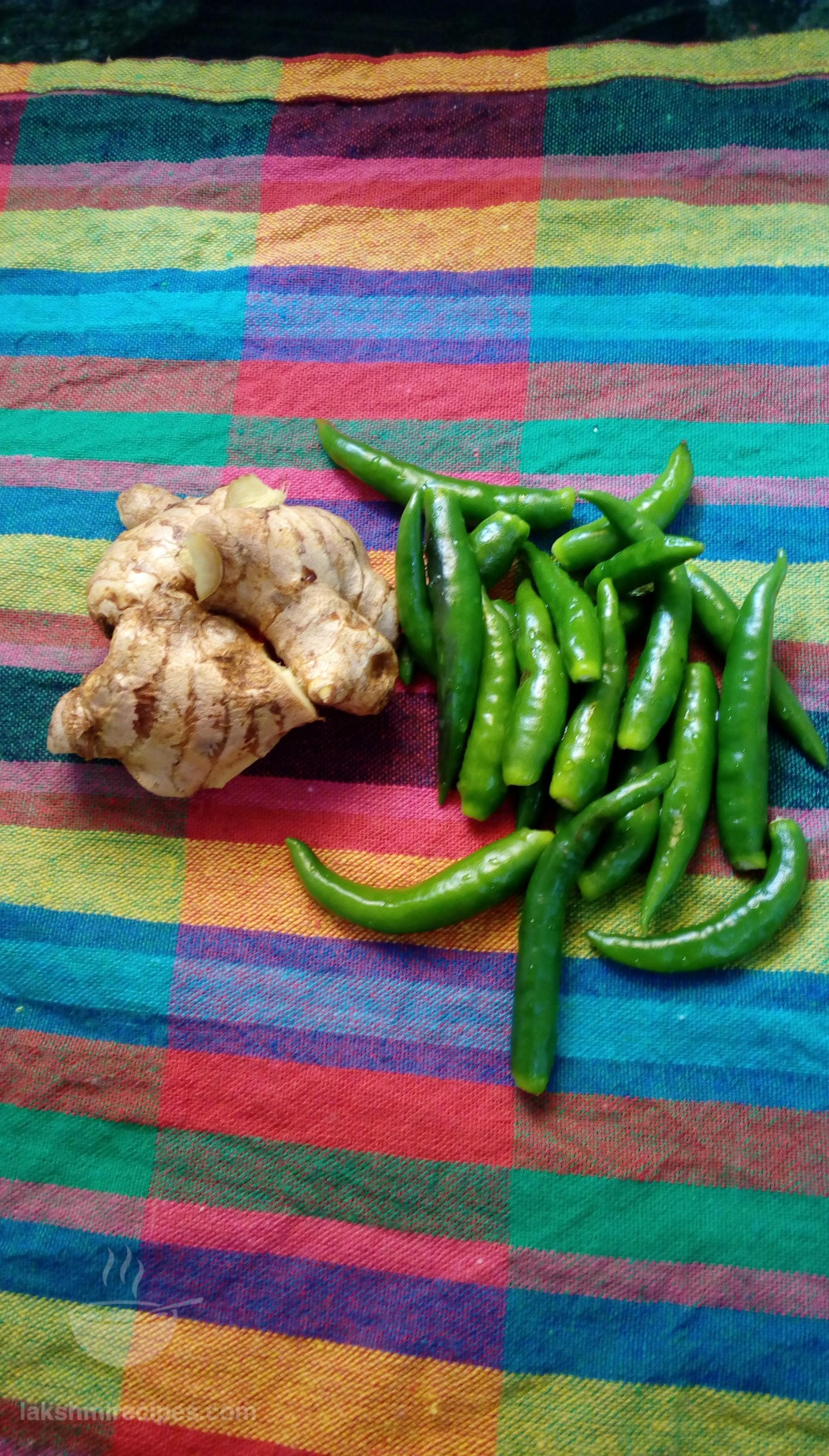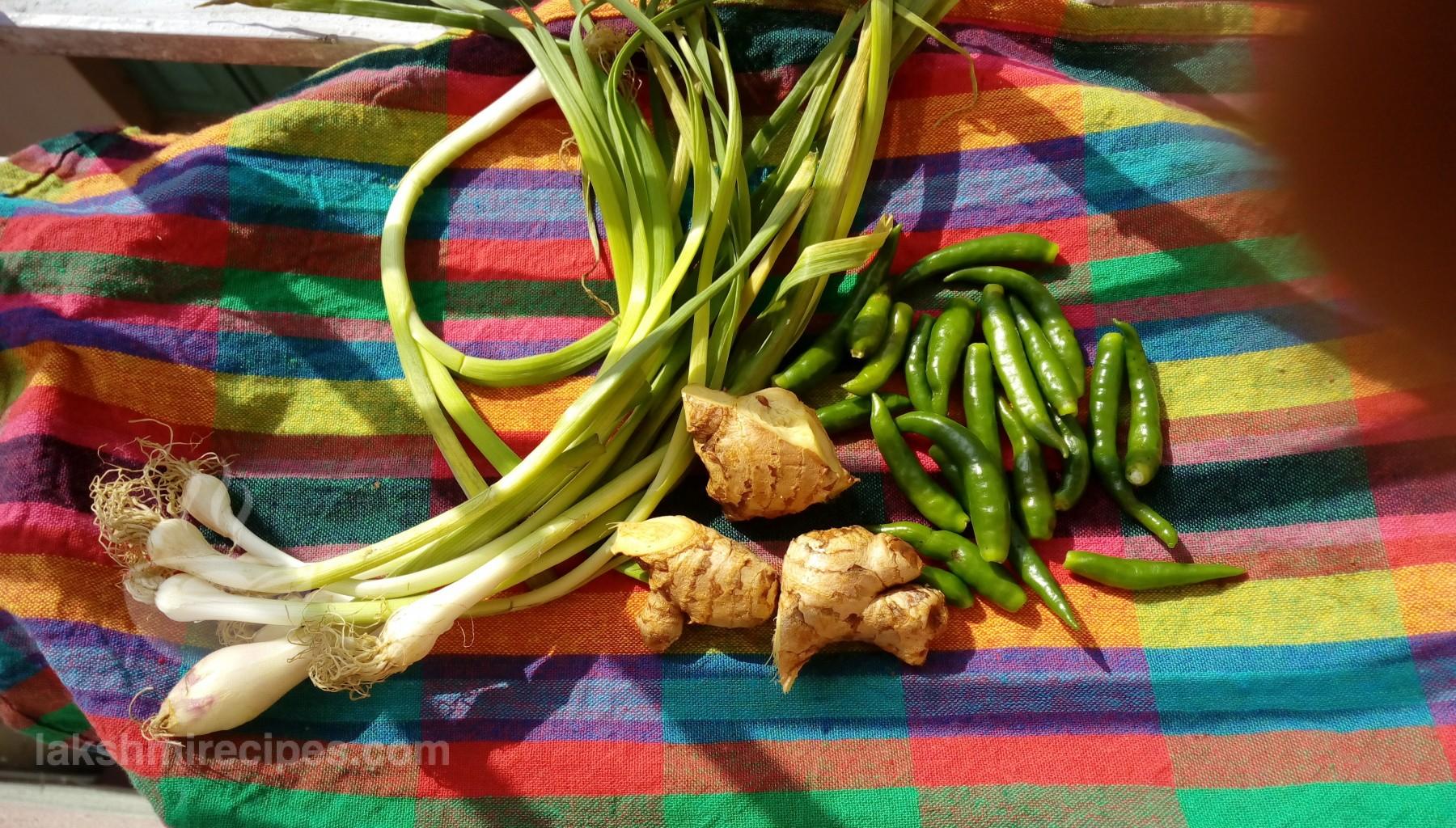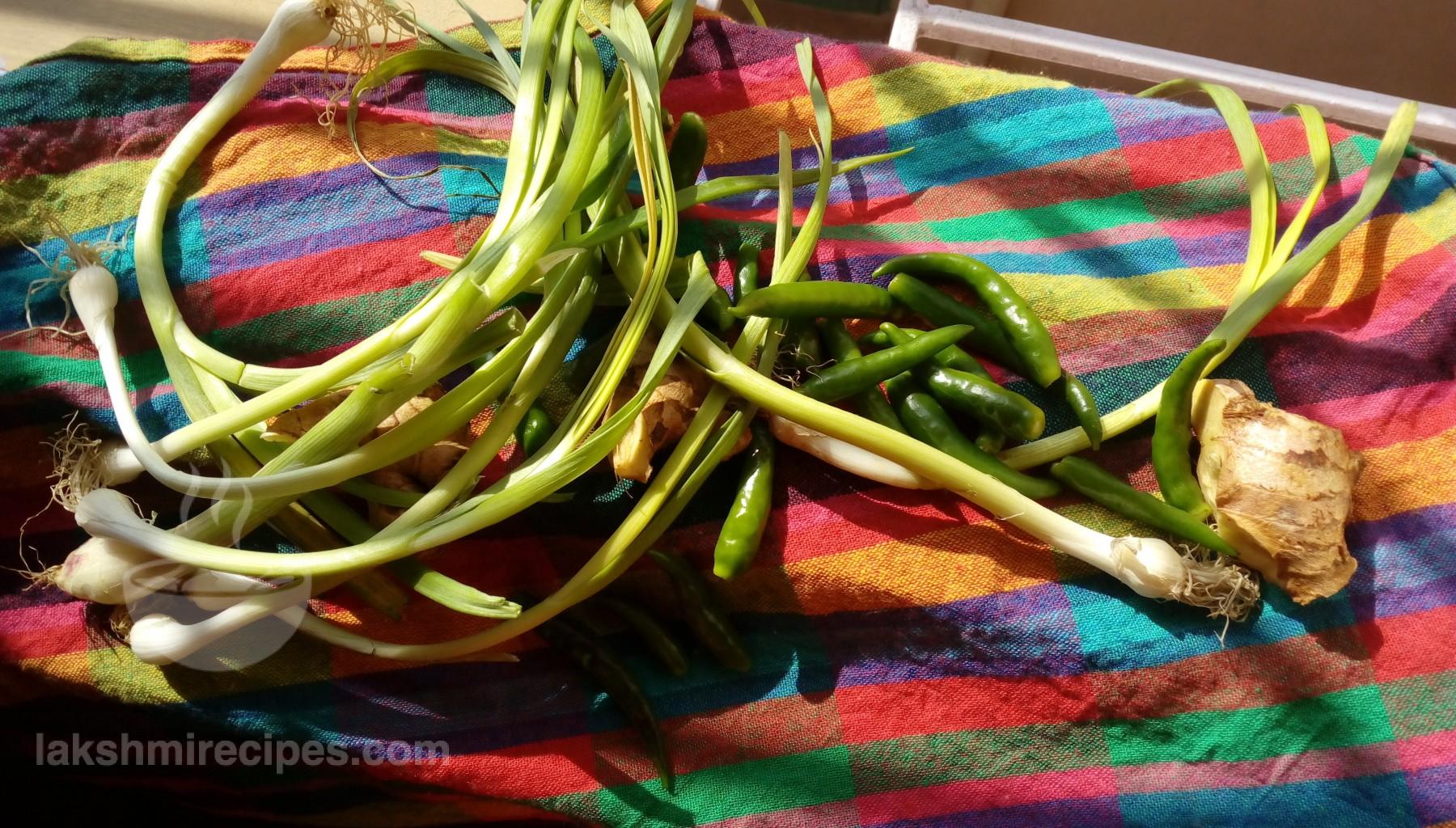 - Take the garlic along with the leaves (lehsun patte k sath lijiye). Kindly note, that the leaves are fresh and soft. Similarly, use only the fresh green chillis (hari mirch) and the ginger (adrak). Wash all the three ingredients well with plain water.