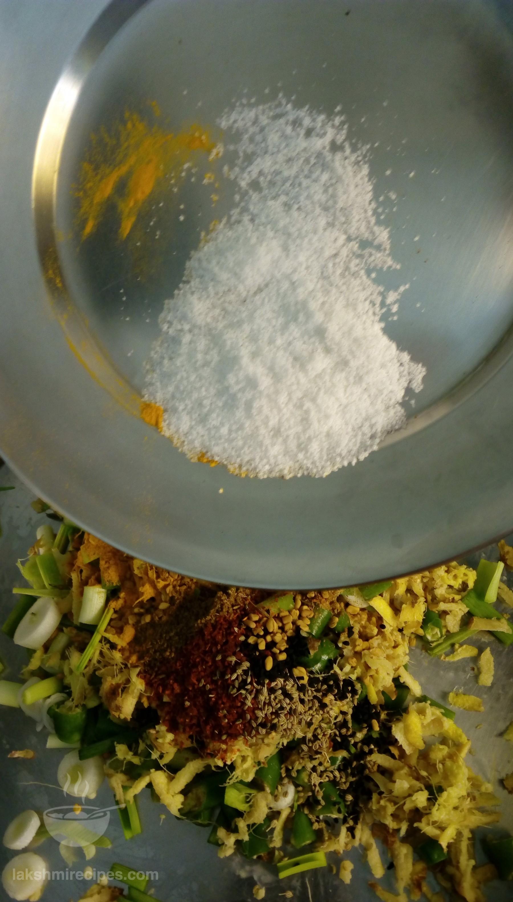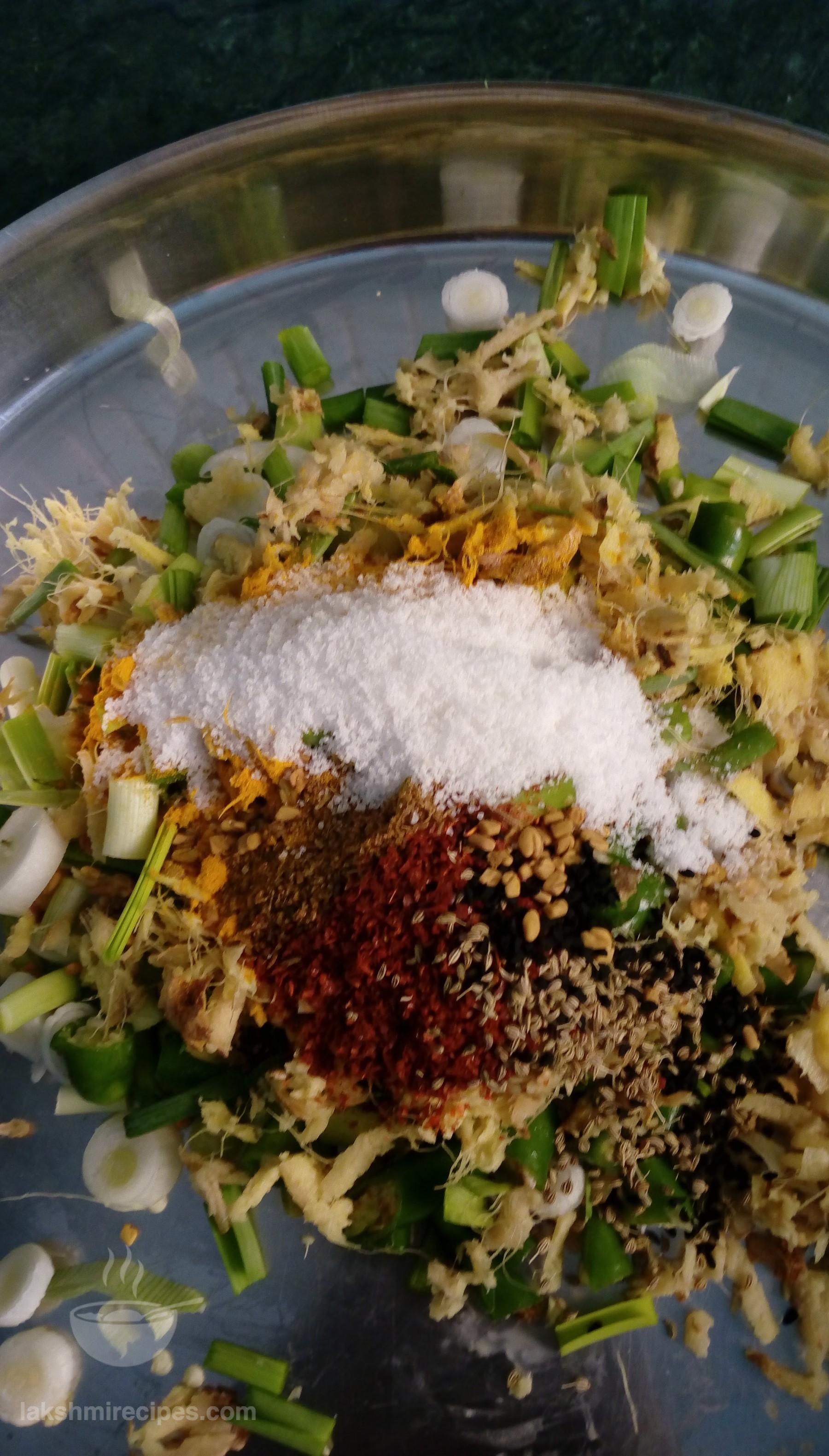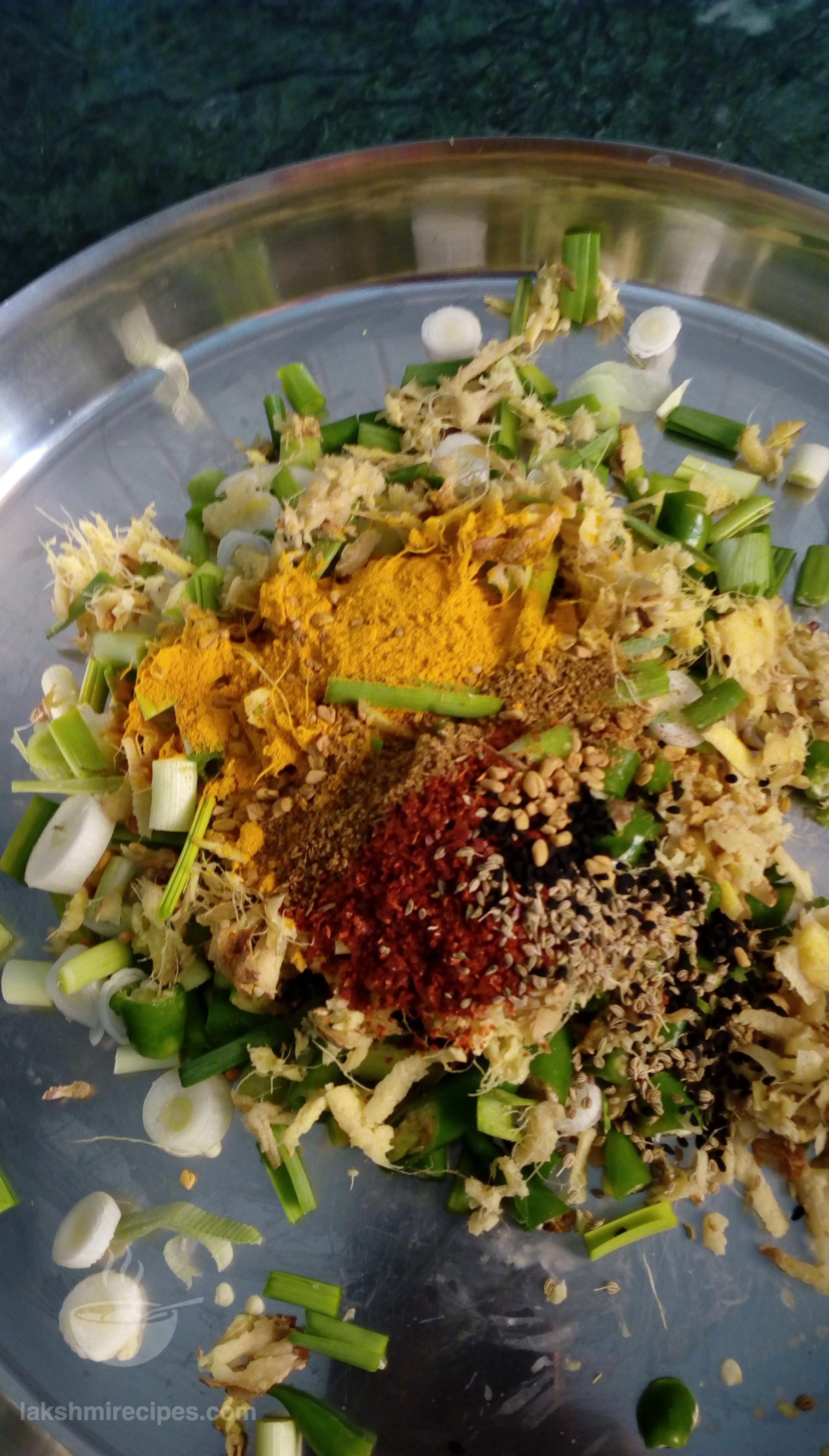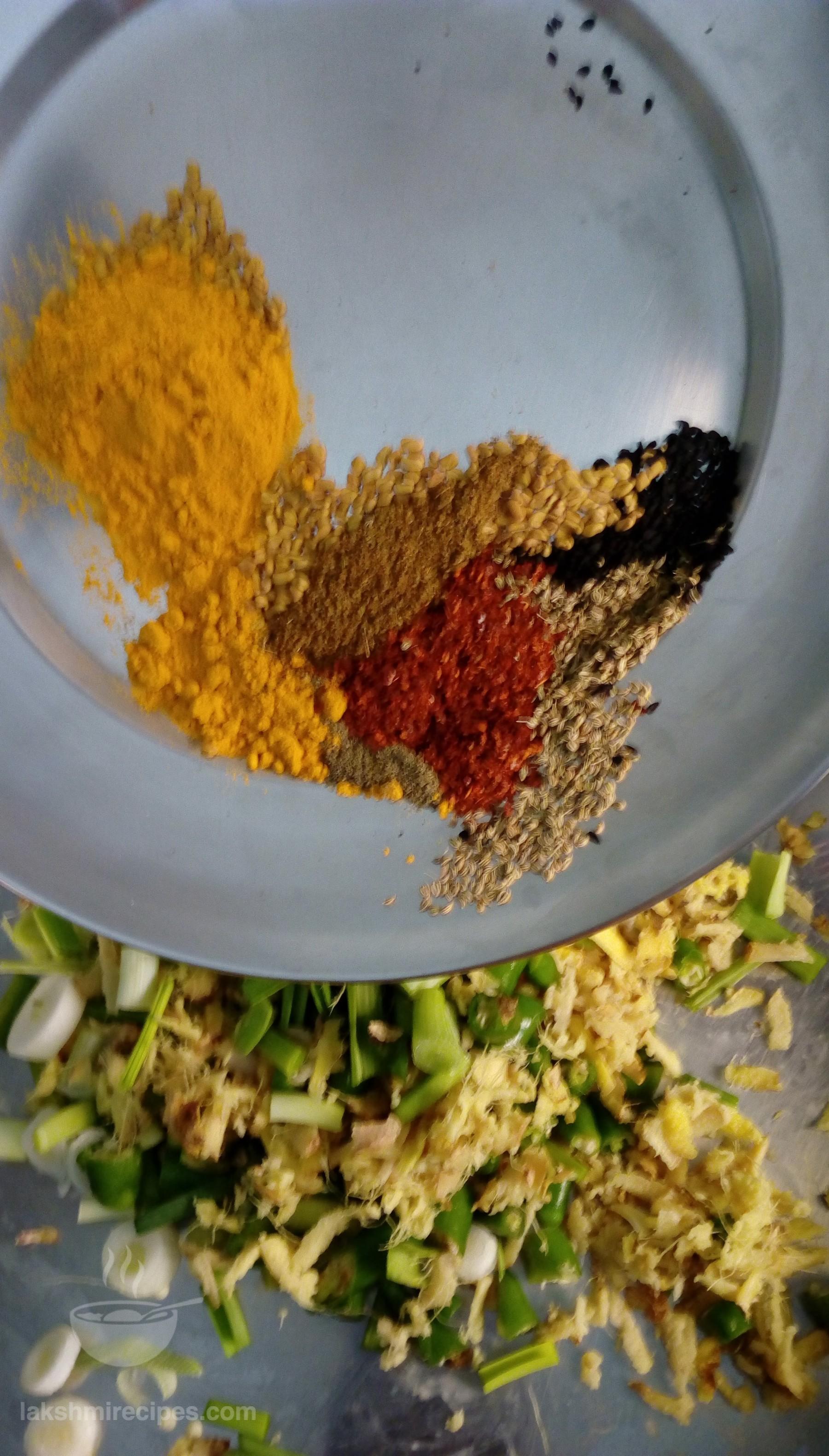 - Now gather the other spices (haldi powder, lal mirch powder, jeera powder, kali mirch powder, ajwain, mungrel, methi dana) in a plate and add them together to the plate containing the chopped ingredients (lehsun, hari mirch, adrak).Then mix all the spices together to form a uniform dry masala.