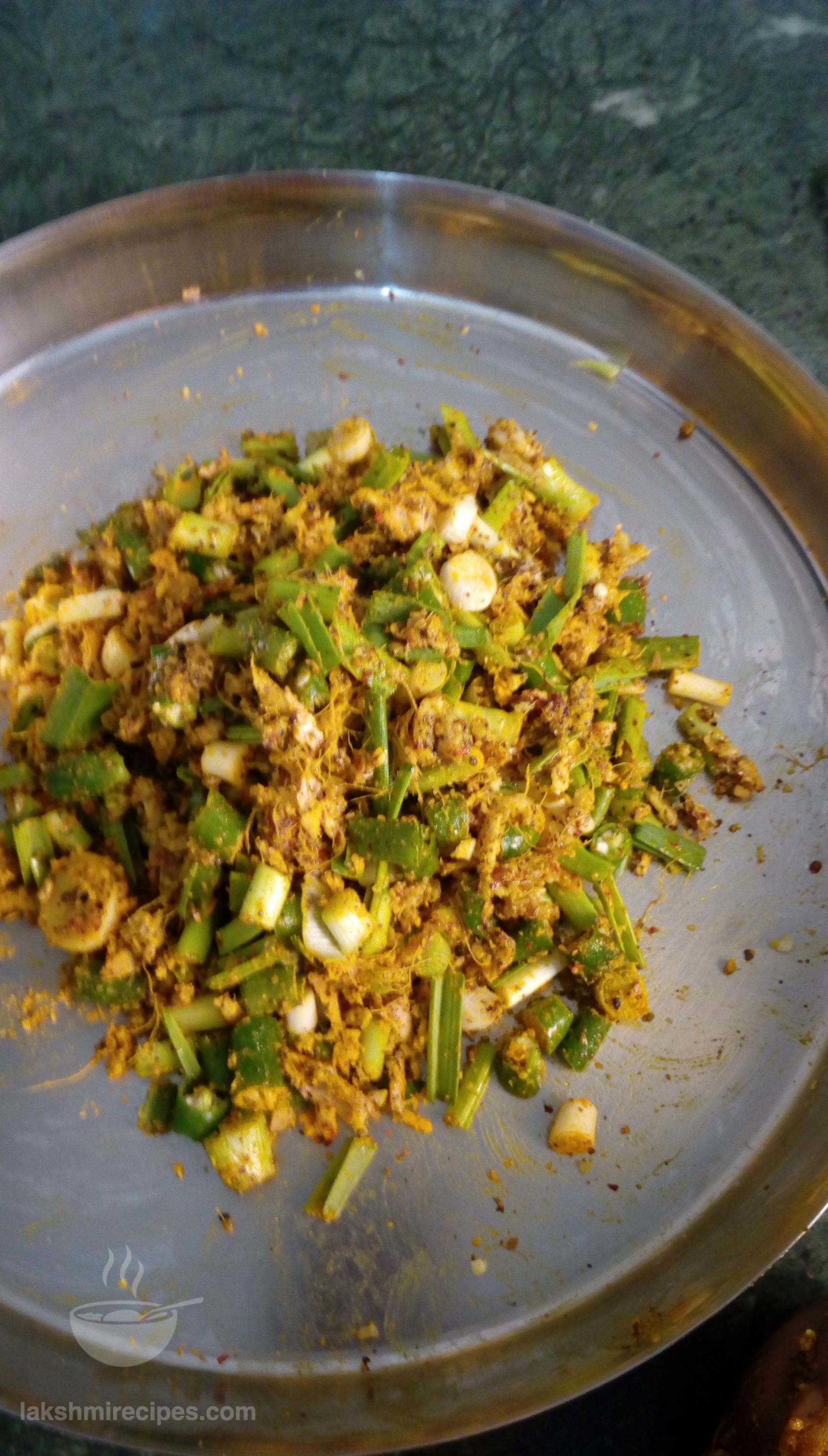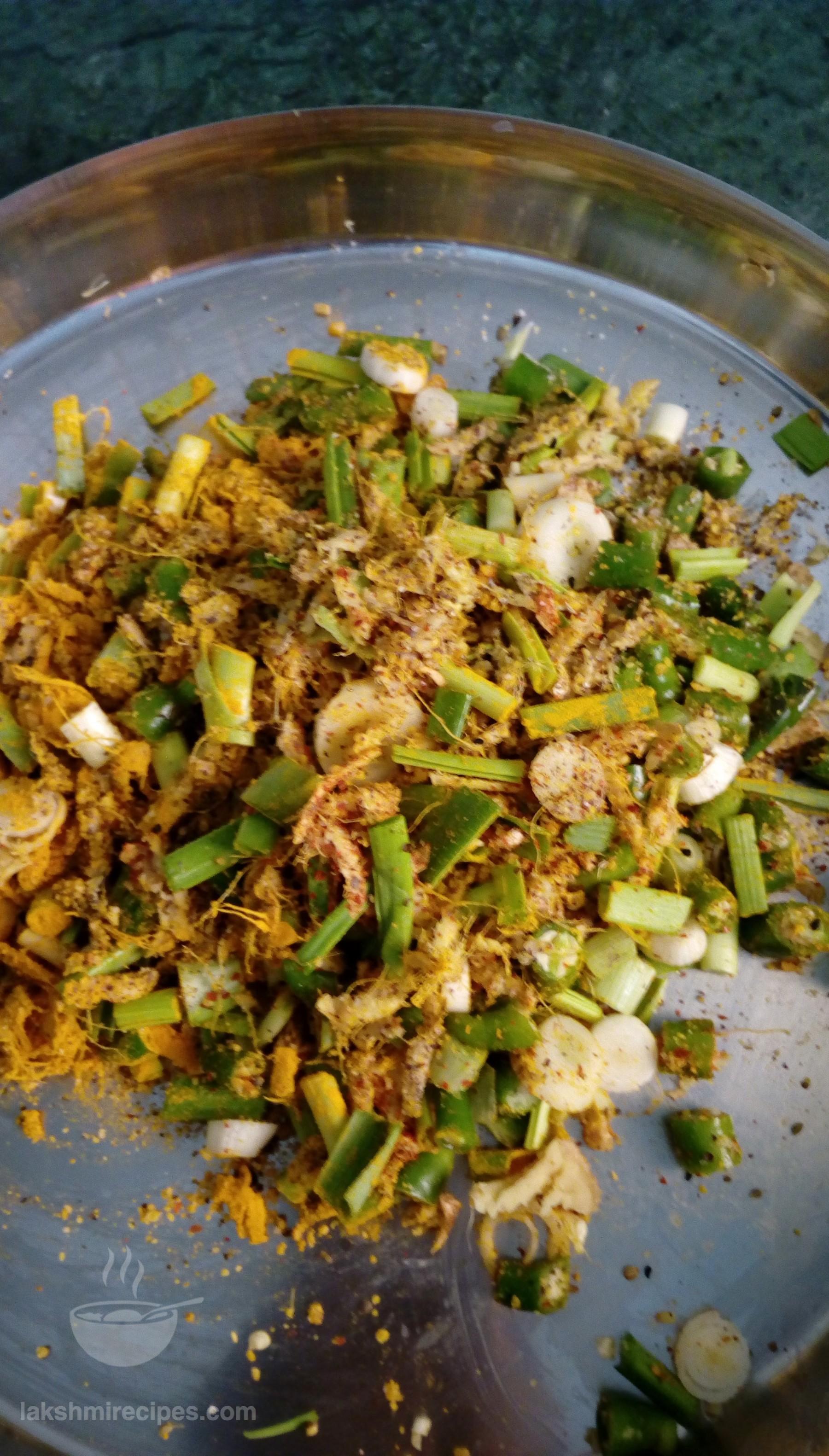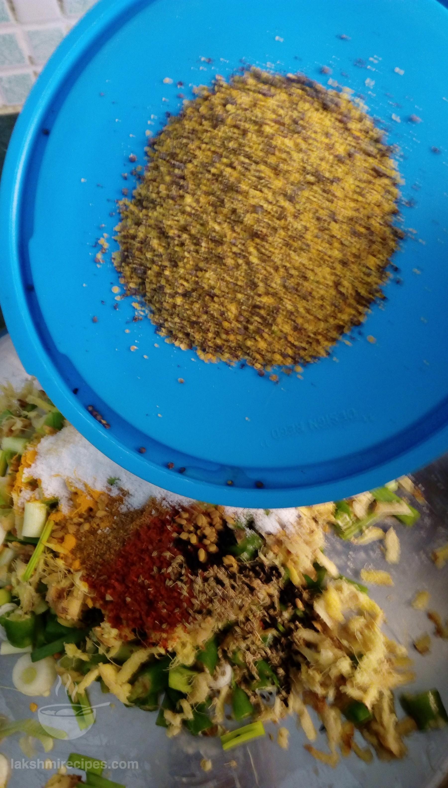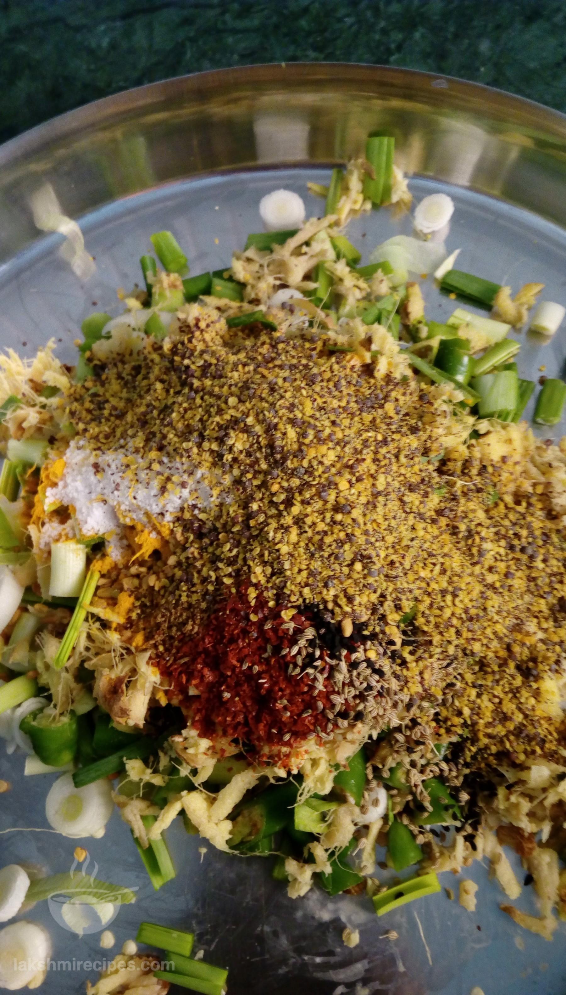- Now gather the other spices (haldi powder, lal mirch powder, jeera powder, kali mirch powder, ajwain, mungrel, methi dana) in a plate and add them together to the plate containing the chopped ingredients (lehsun, hari mirch, adrak).Then mix all the spices together to form a uniform dry masala.