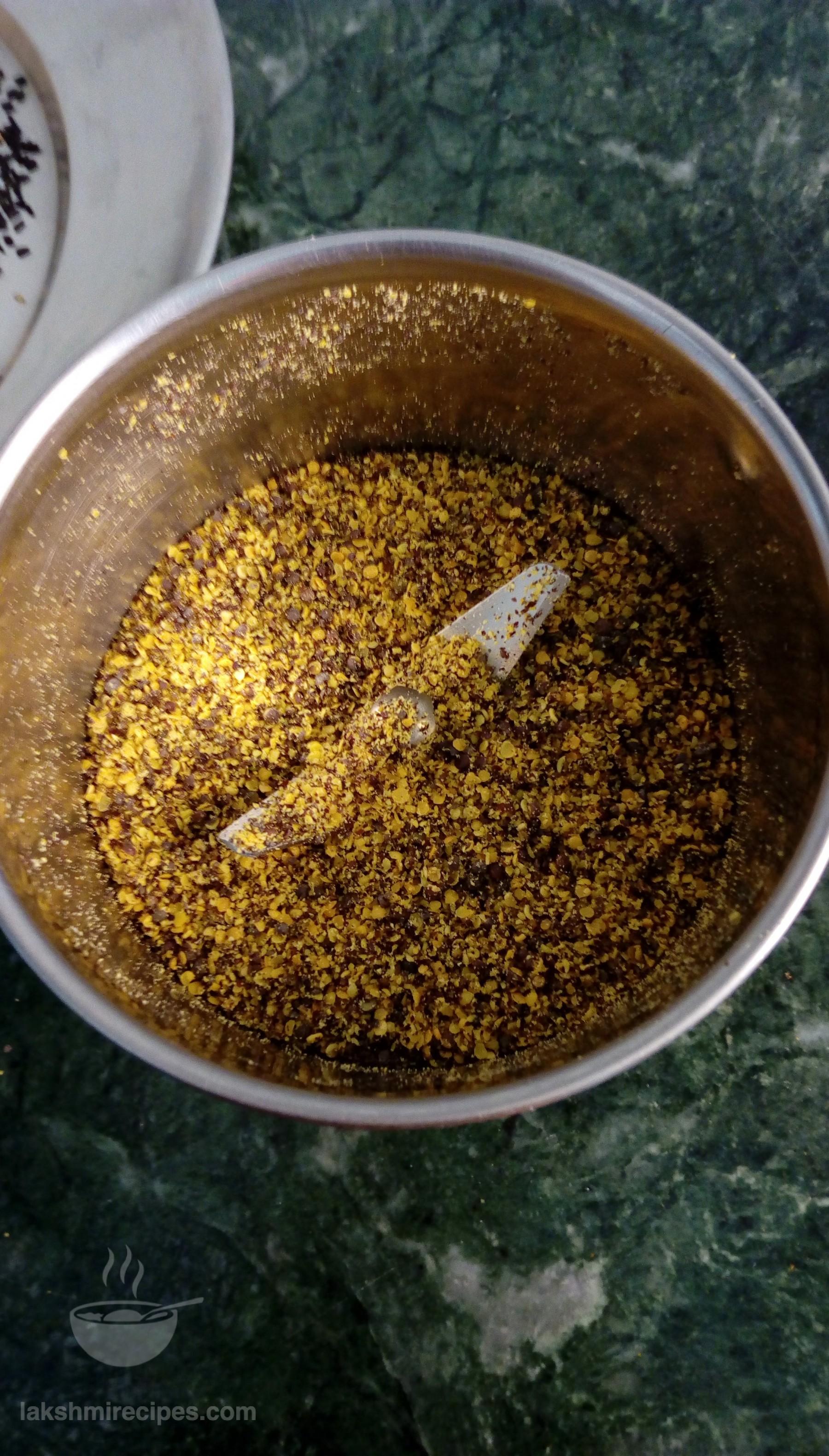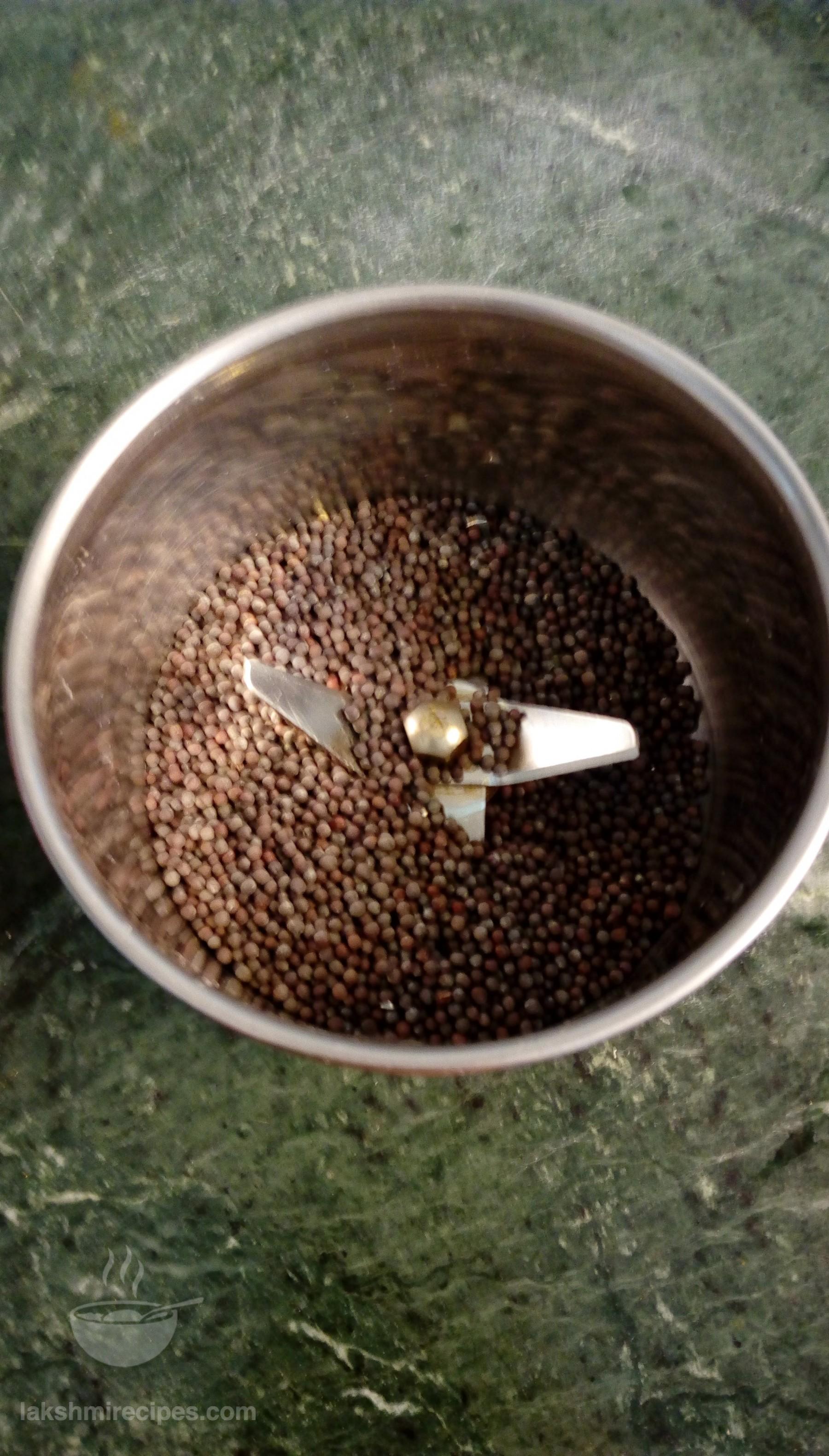 - In a mixer jar take the mustard seeds (sarson dana) and grind it to a fine powder form. Keep it aside to be used in later step.