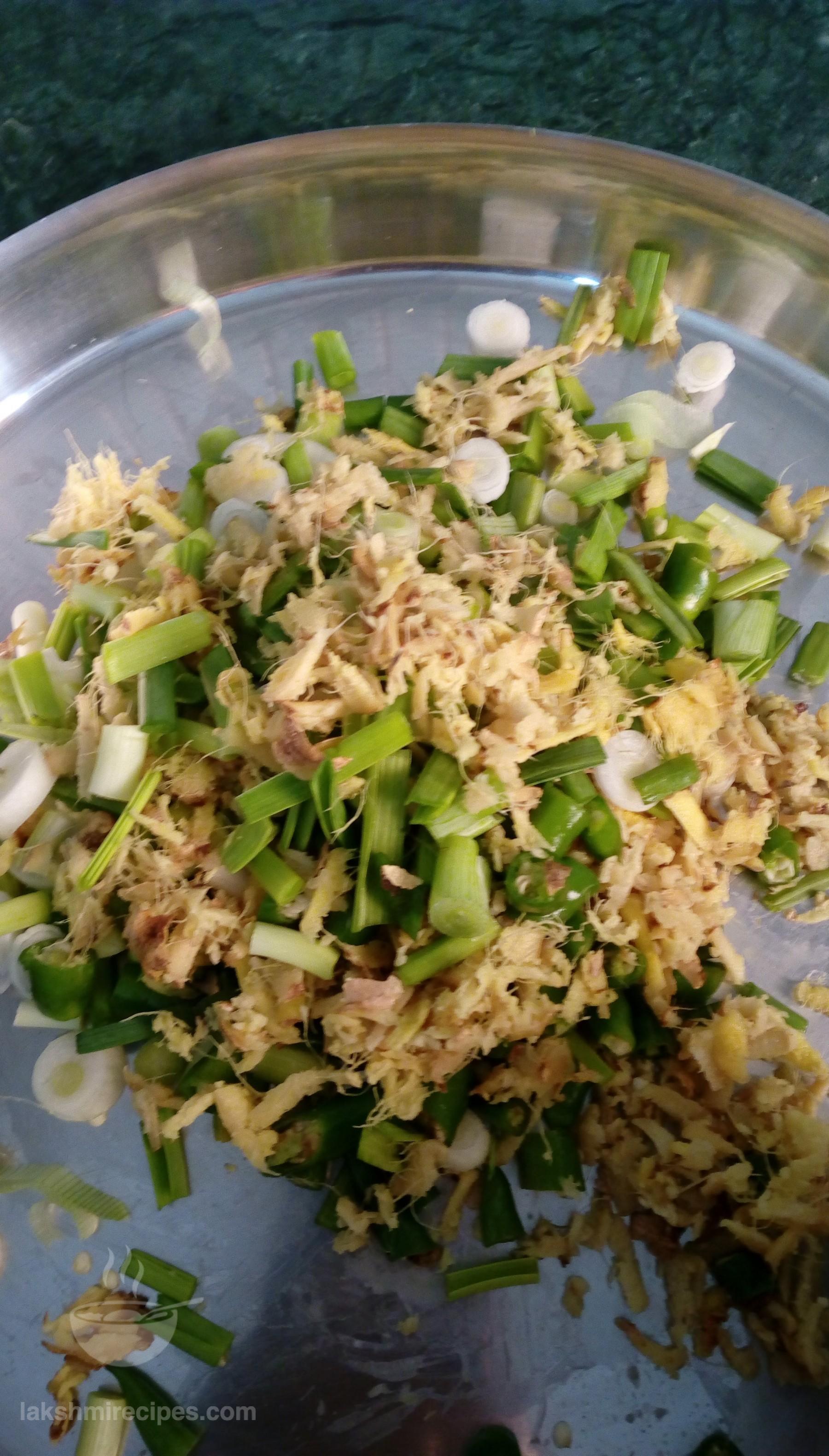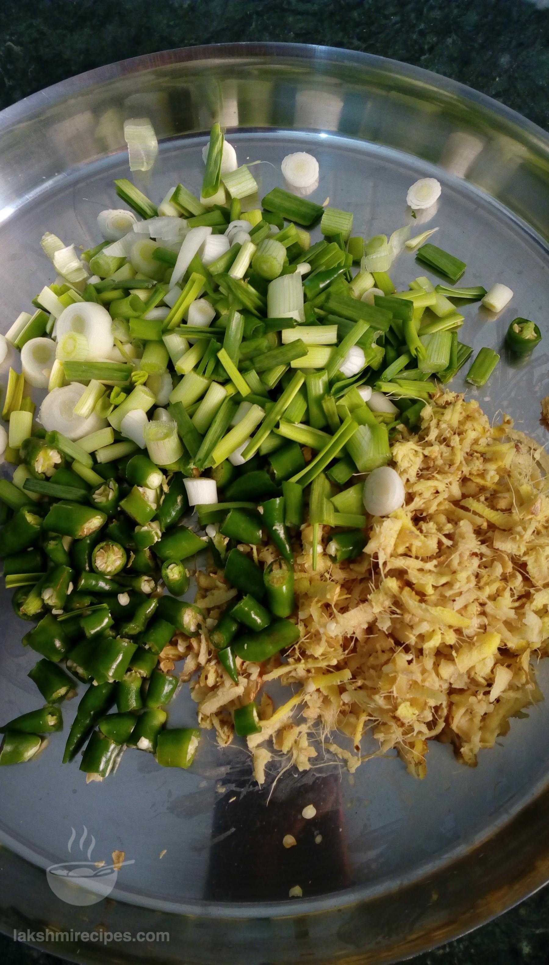 - Then chop the garlic (lehsun), garlic leaves (lehsun ka patta),green chilli (hari mirch) and ginger (adrak) into small and equal sized pieces and keep all of it together in a big plate.