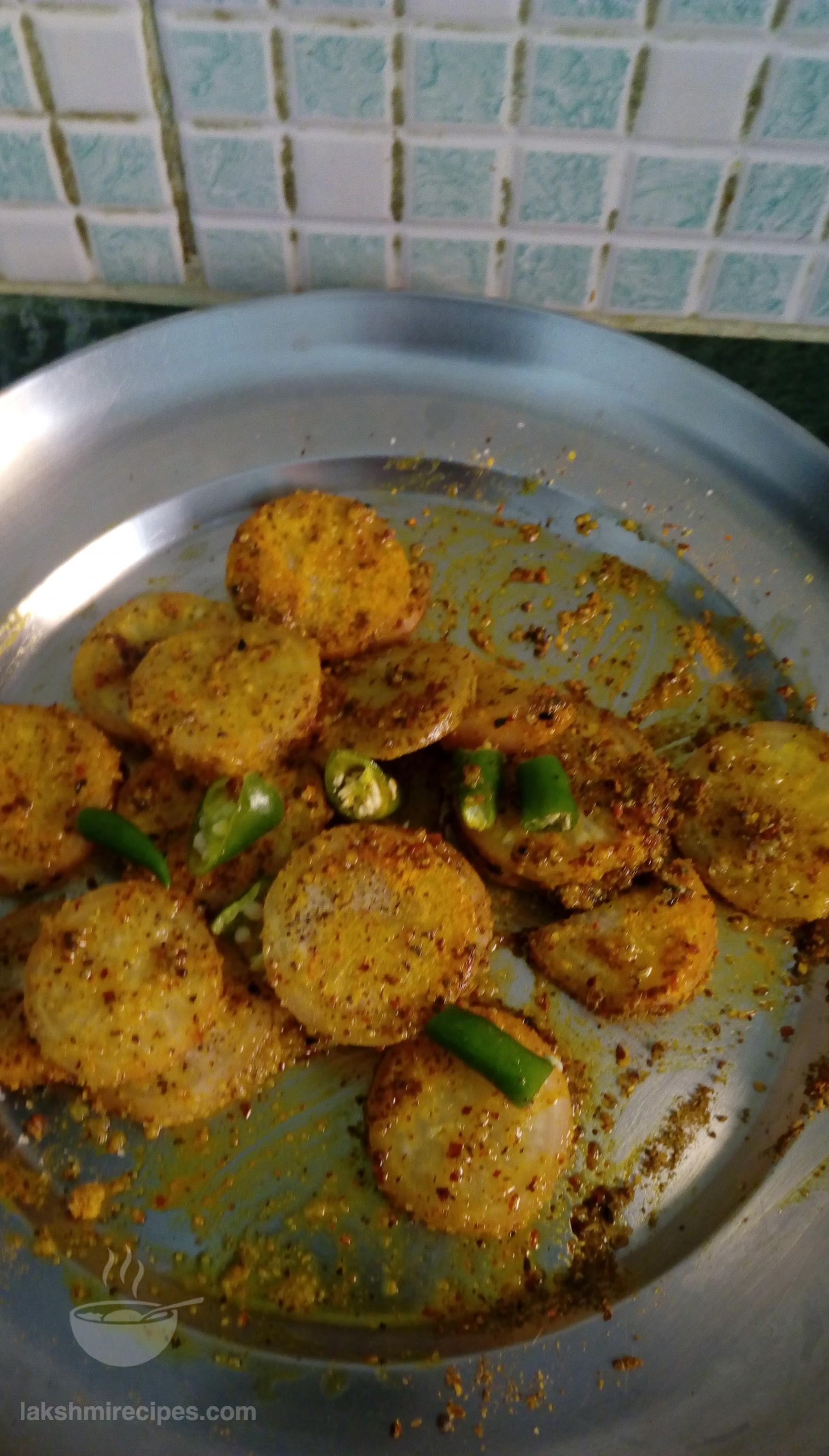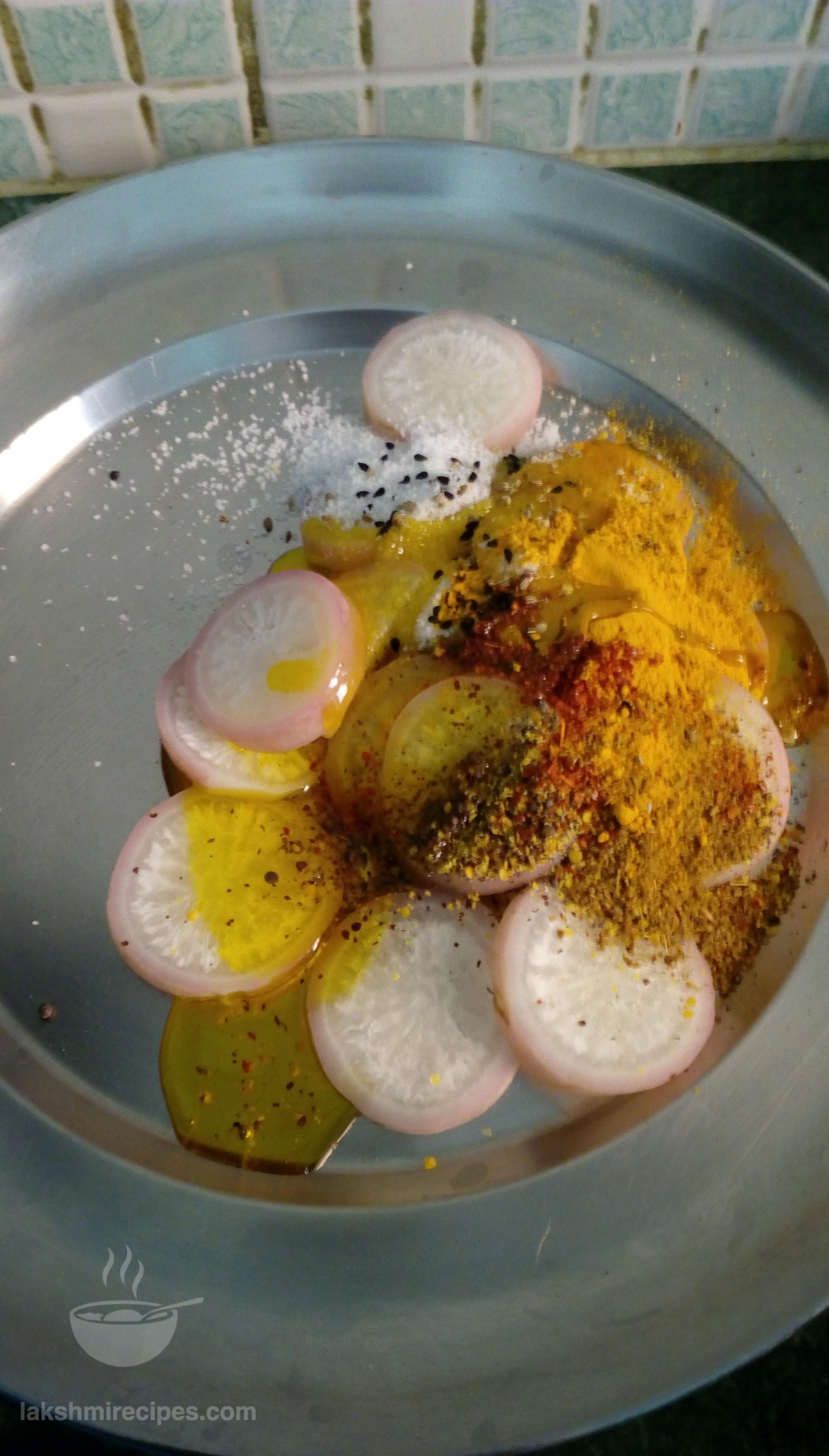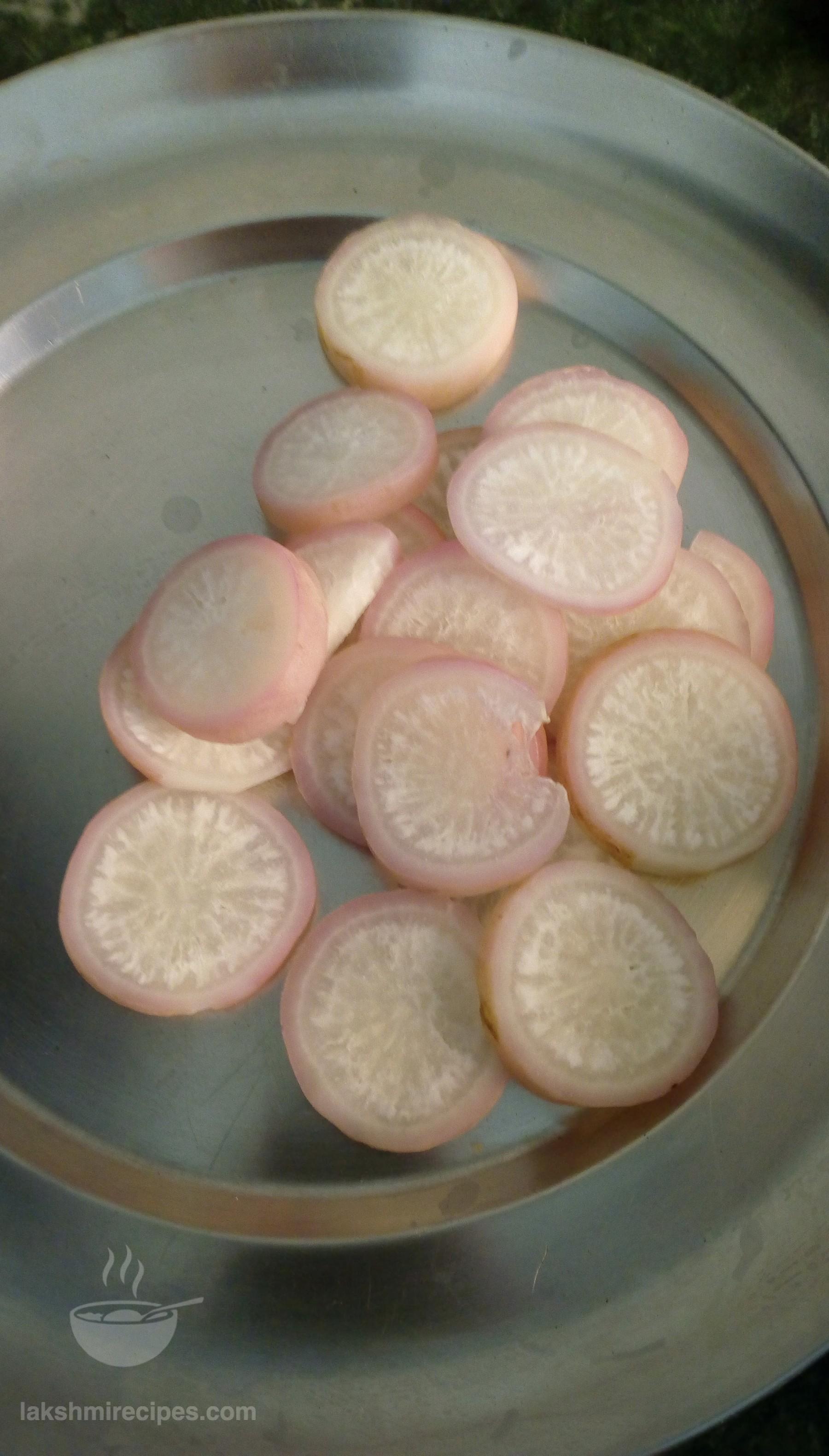 - Wash the raddish (mooli) nicely with plain water and then chop it into small round slices. Take some water in a deep vessel (bhagona/ pateela) and the chopped raddish (mooli) to it. Boil the raddish (mooli) in the water for 5 minutes and then turn of the flame.