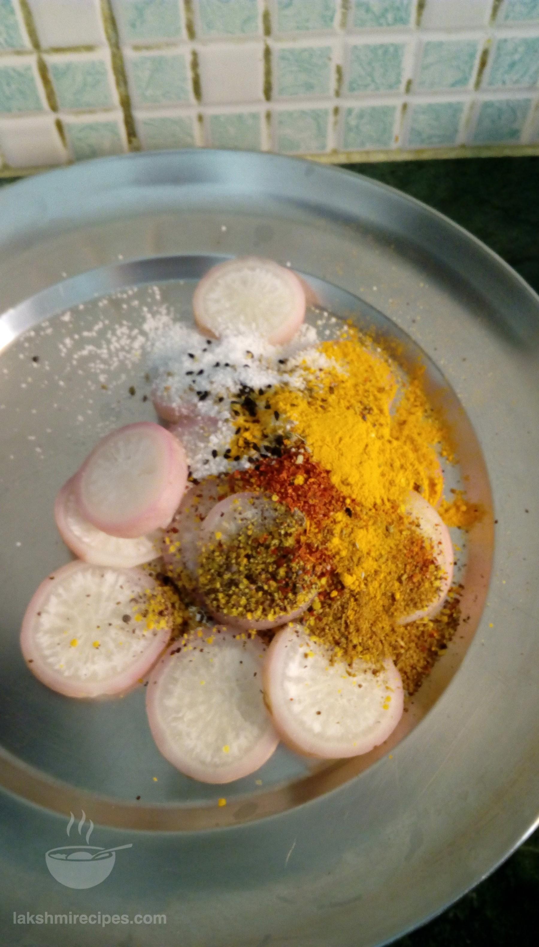 - Add salt and mustard oil (sarson ka tel) to the raddish (mooli) and dry masala. Mix well again.