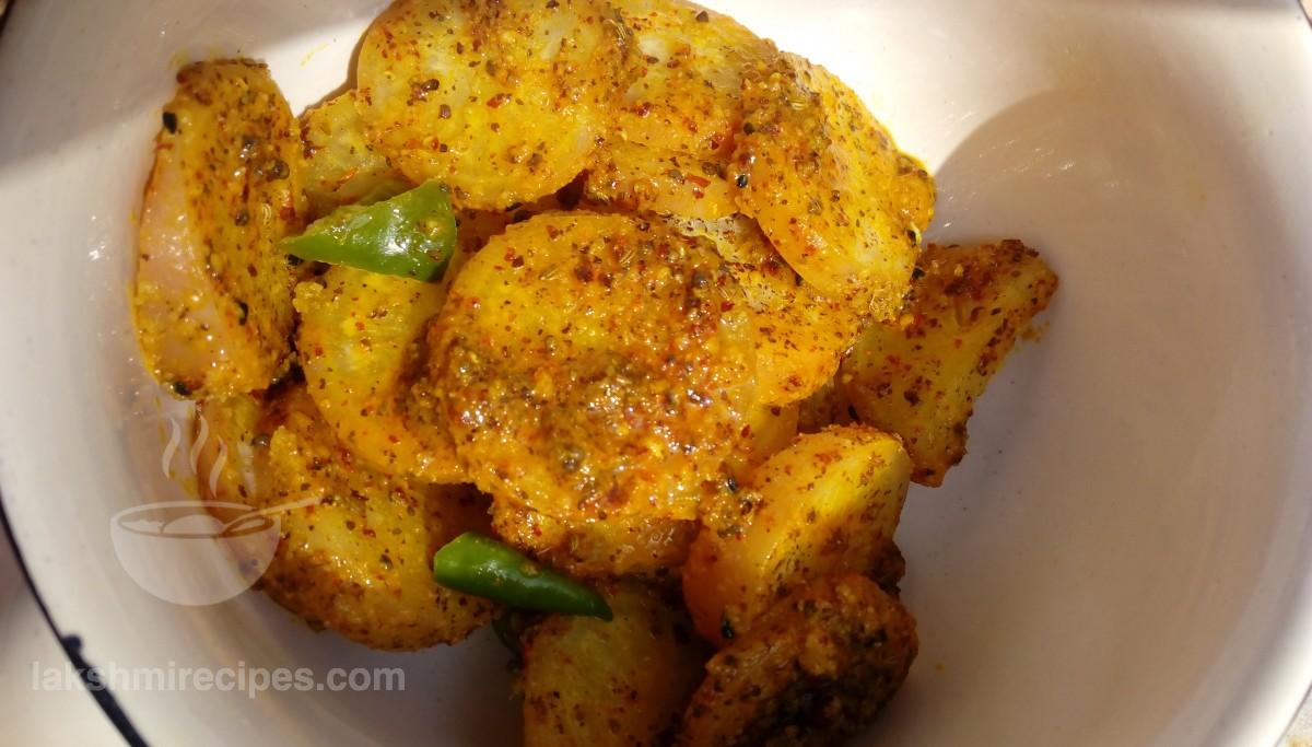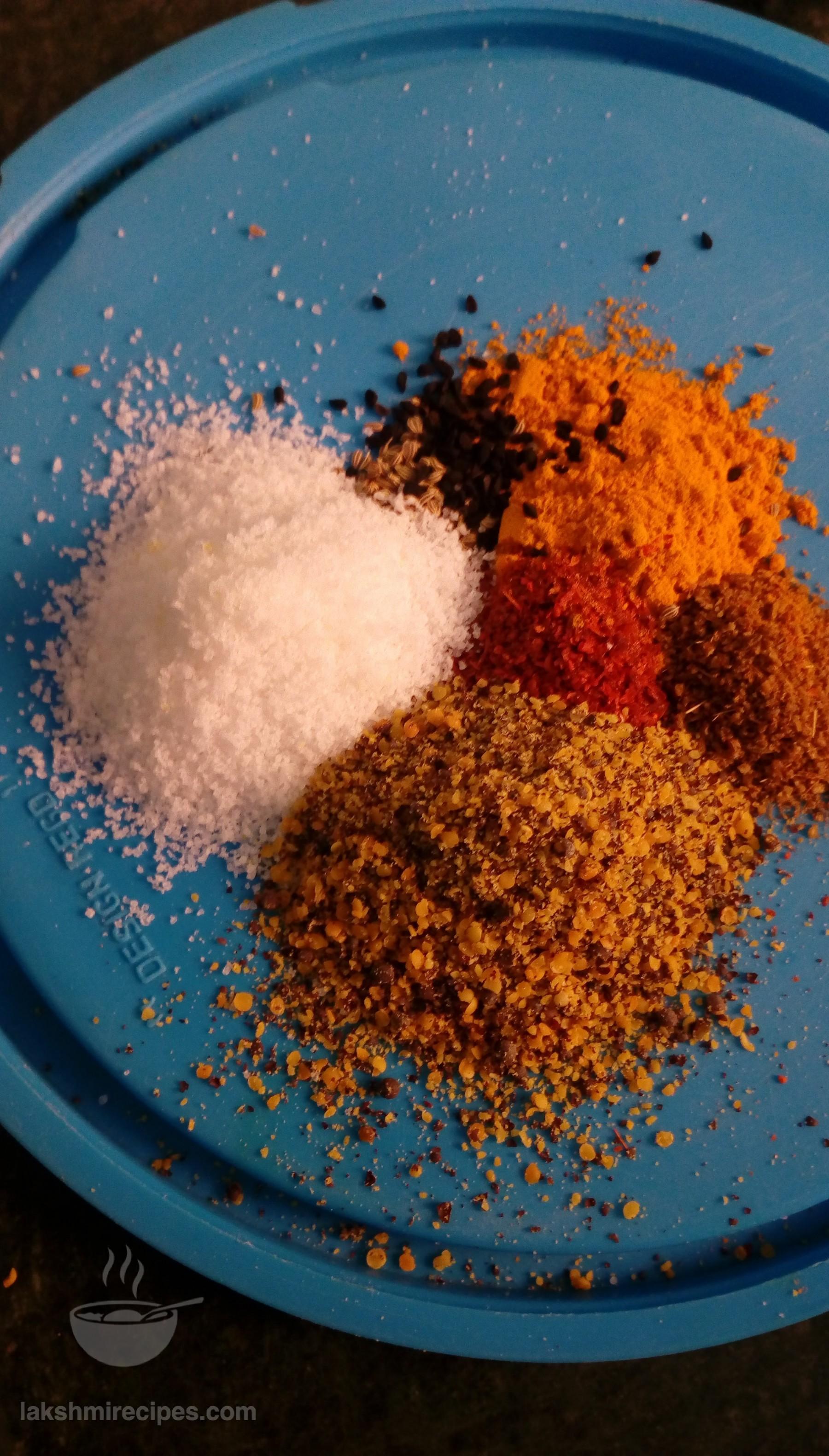 - Now collect all the spices (haldi powder, lal mirch powder, jeera powder, sarson dana ka powder, mungrel/ kalonji, ajwain) in a big plate.