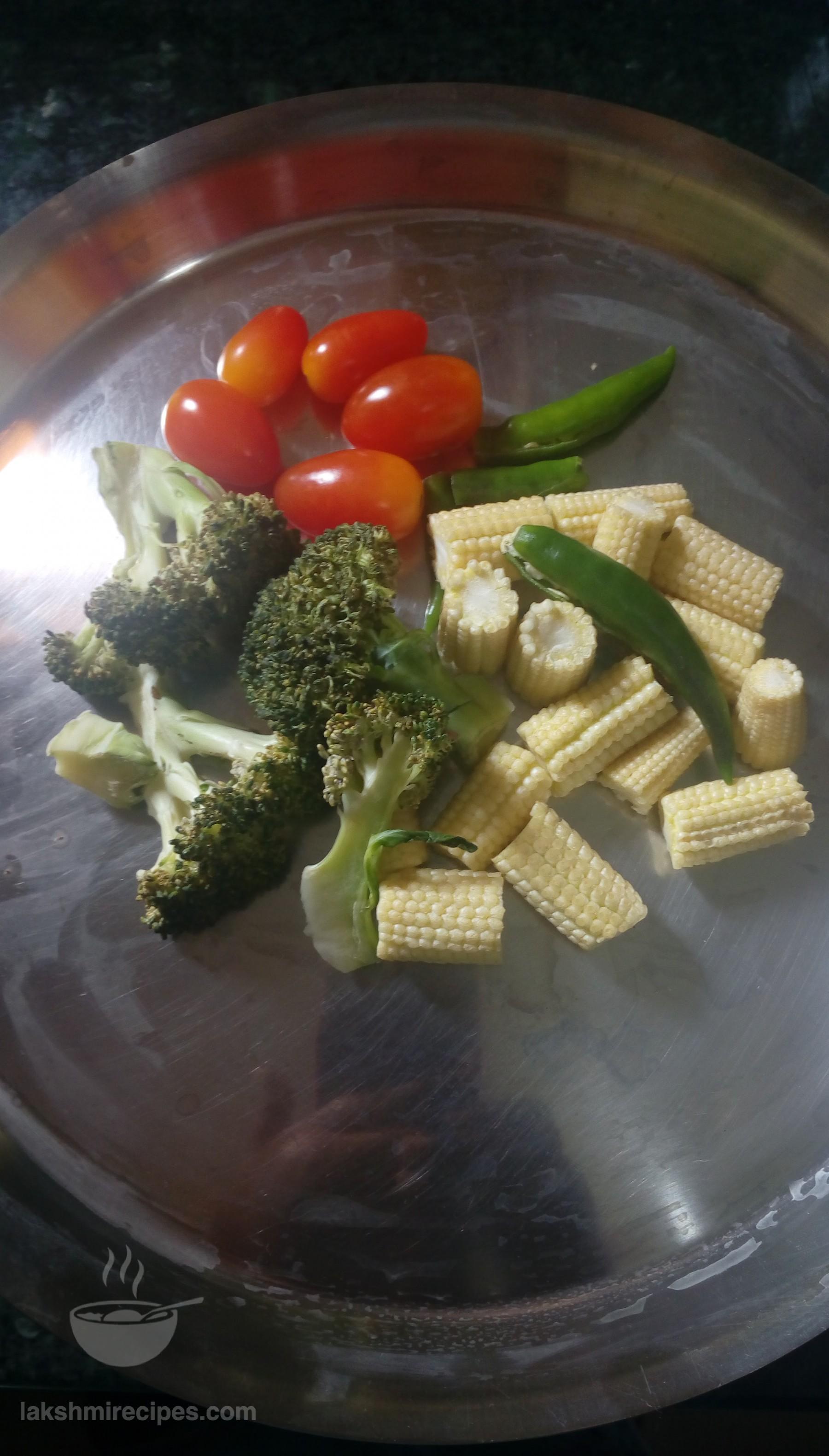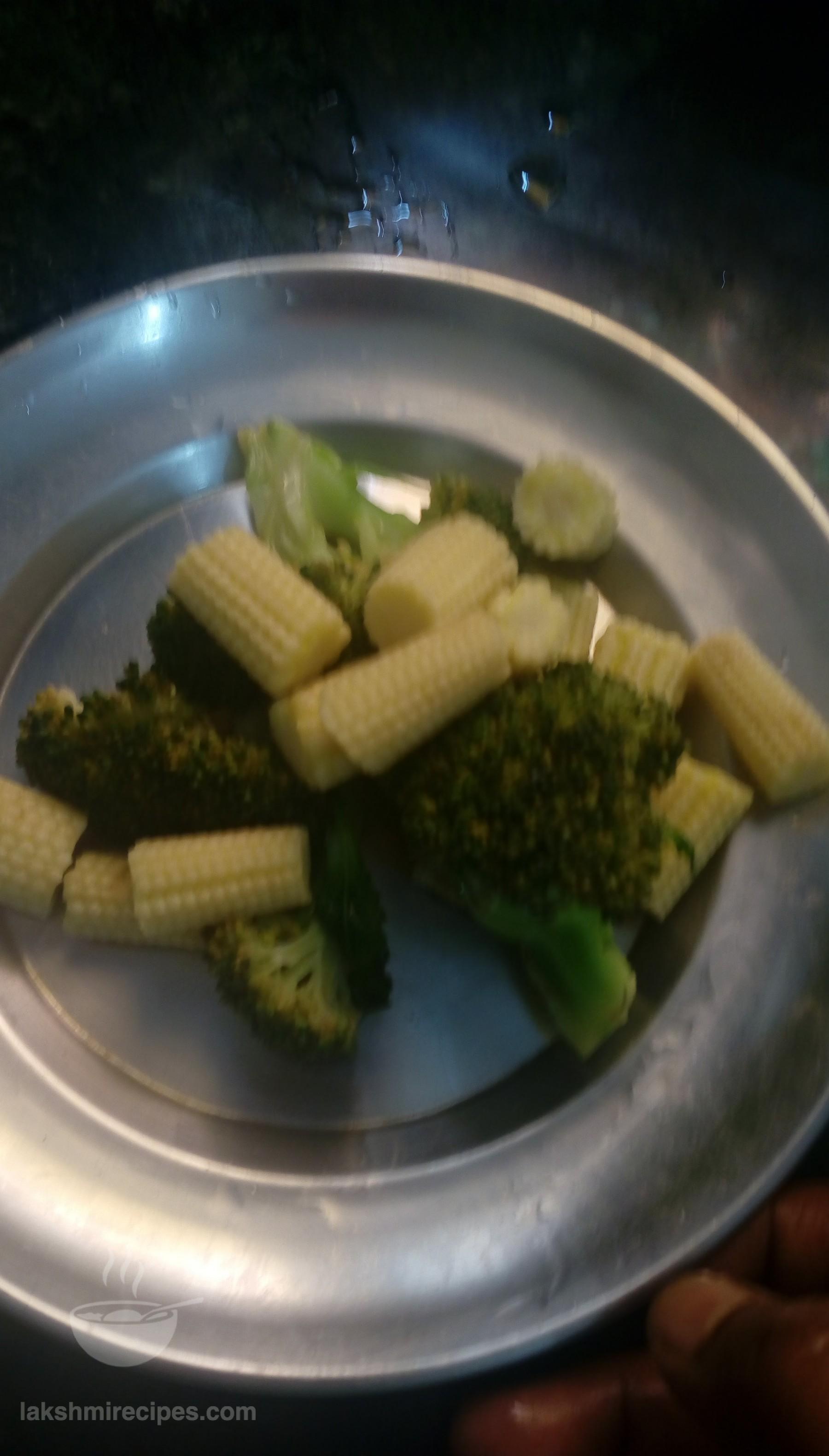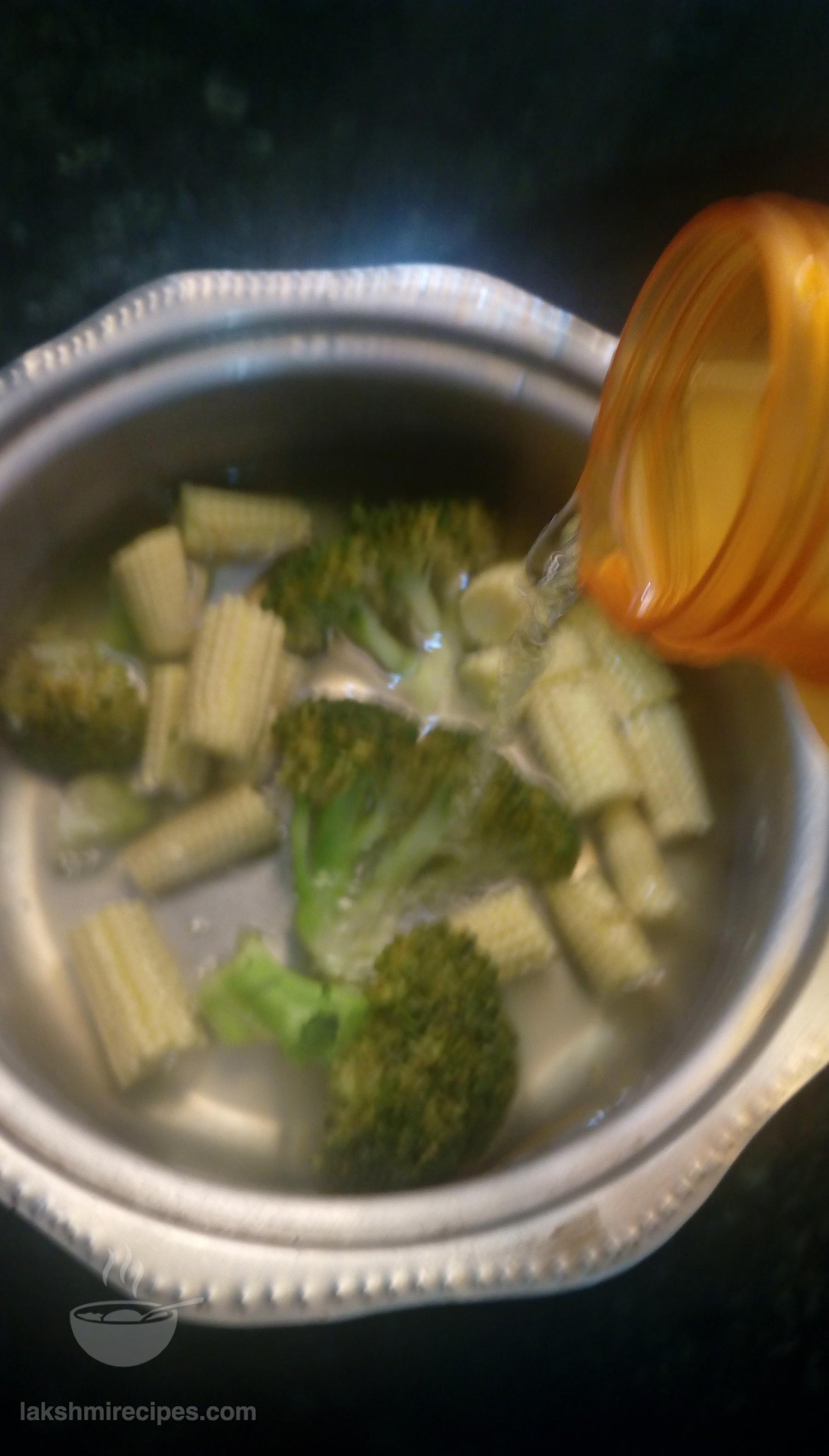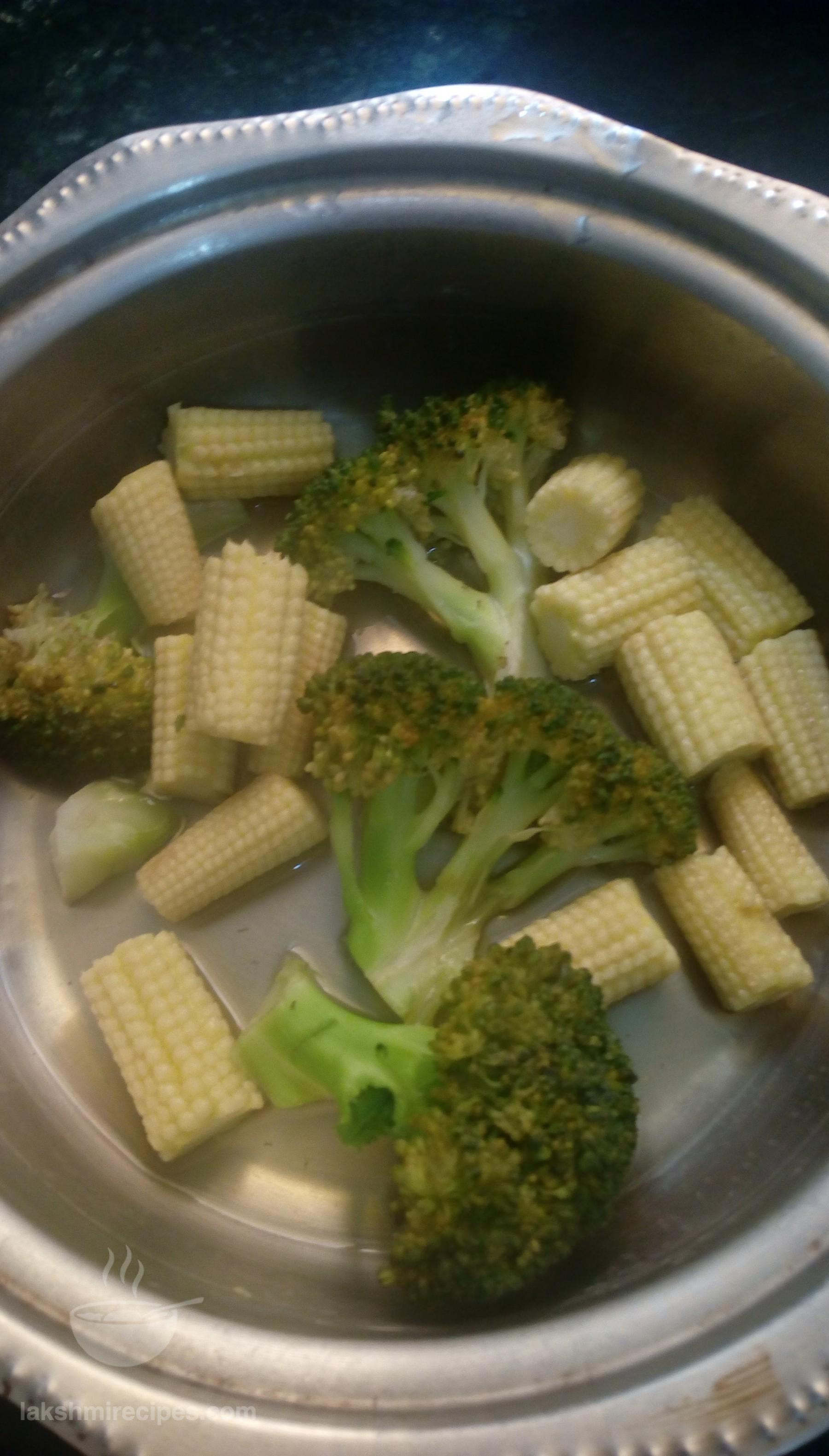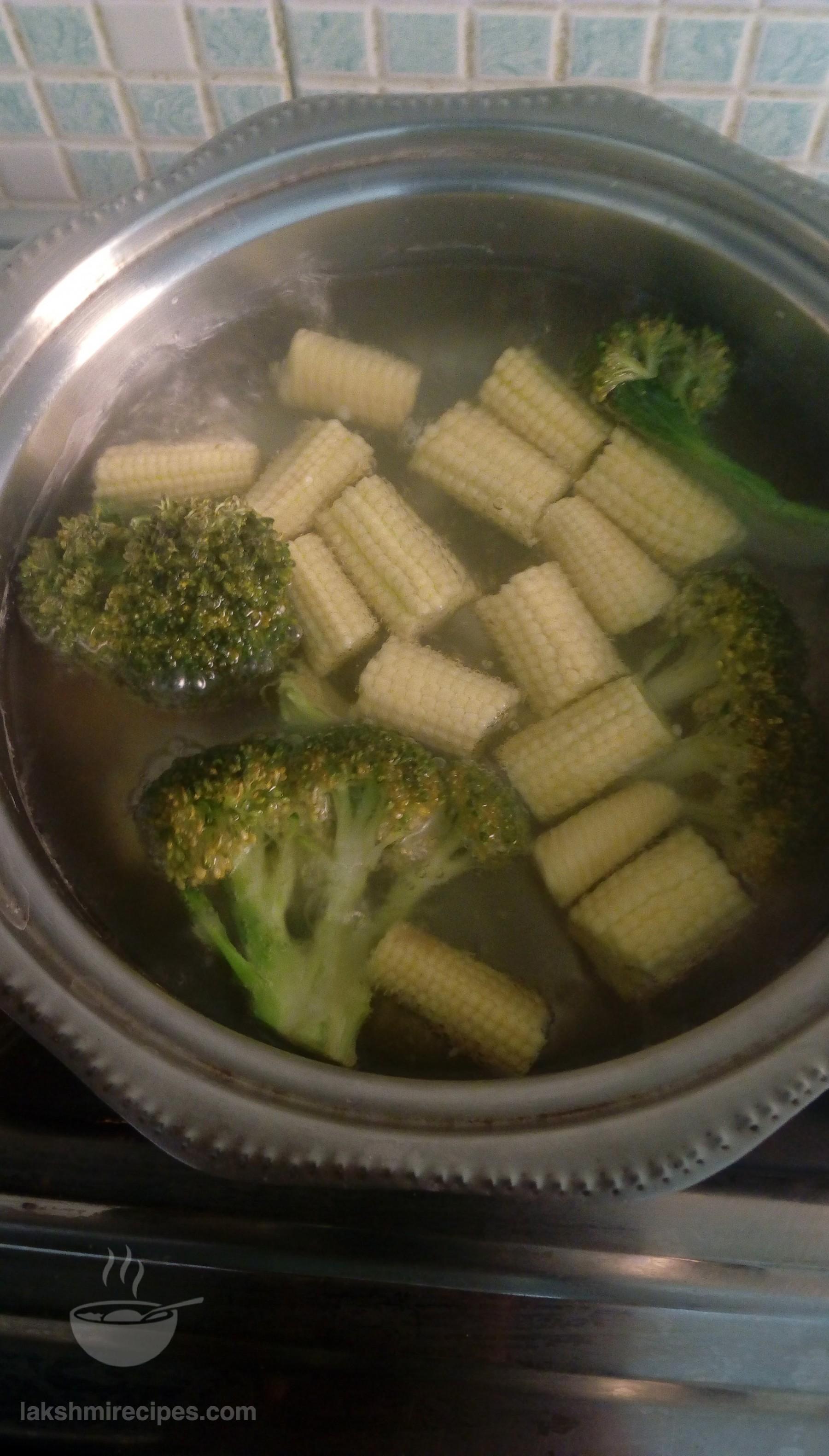 - Boil some water in a deep vessel, and then add the broccoli and baby corn to it. Boil them together for 4-5 minutes, and then take them out from the vessel and wash them with cold water from the fridge. This will help the broccoli retain its color and make these vegetables soft.