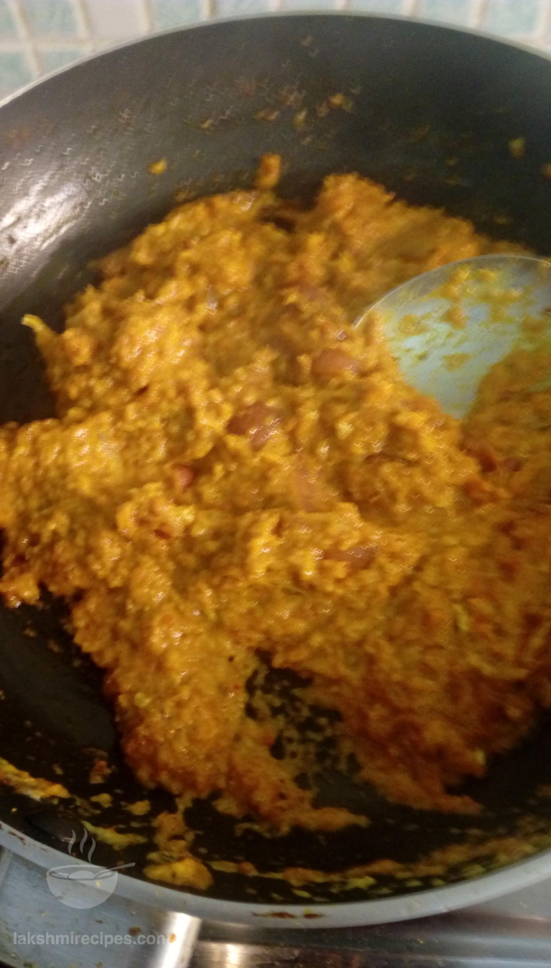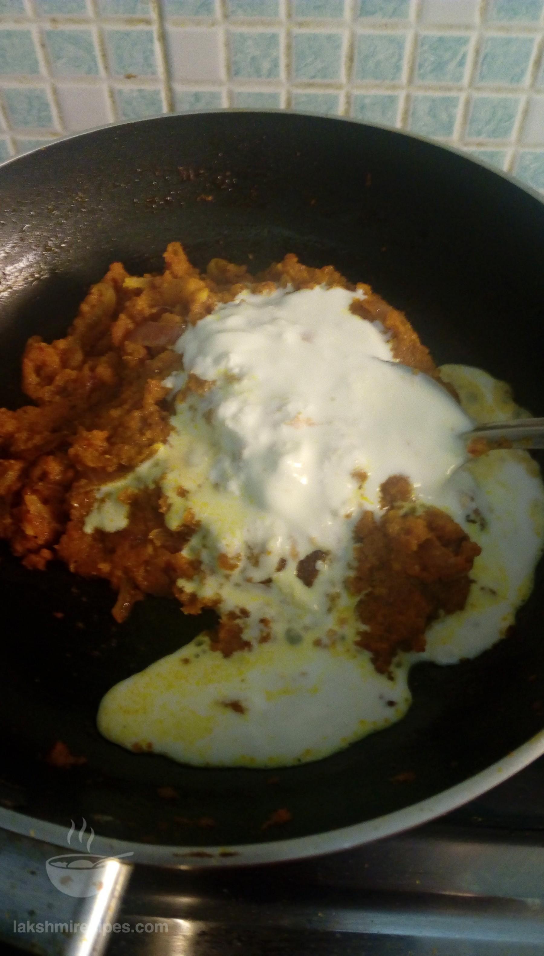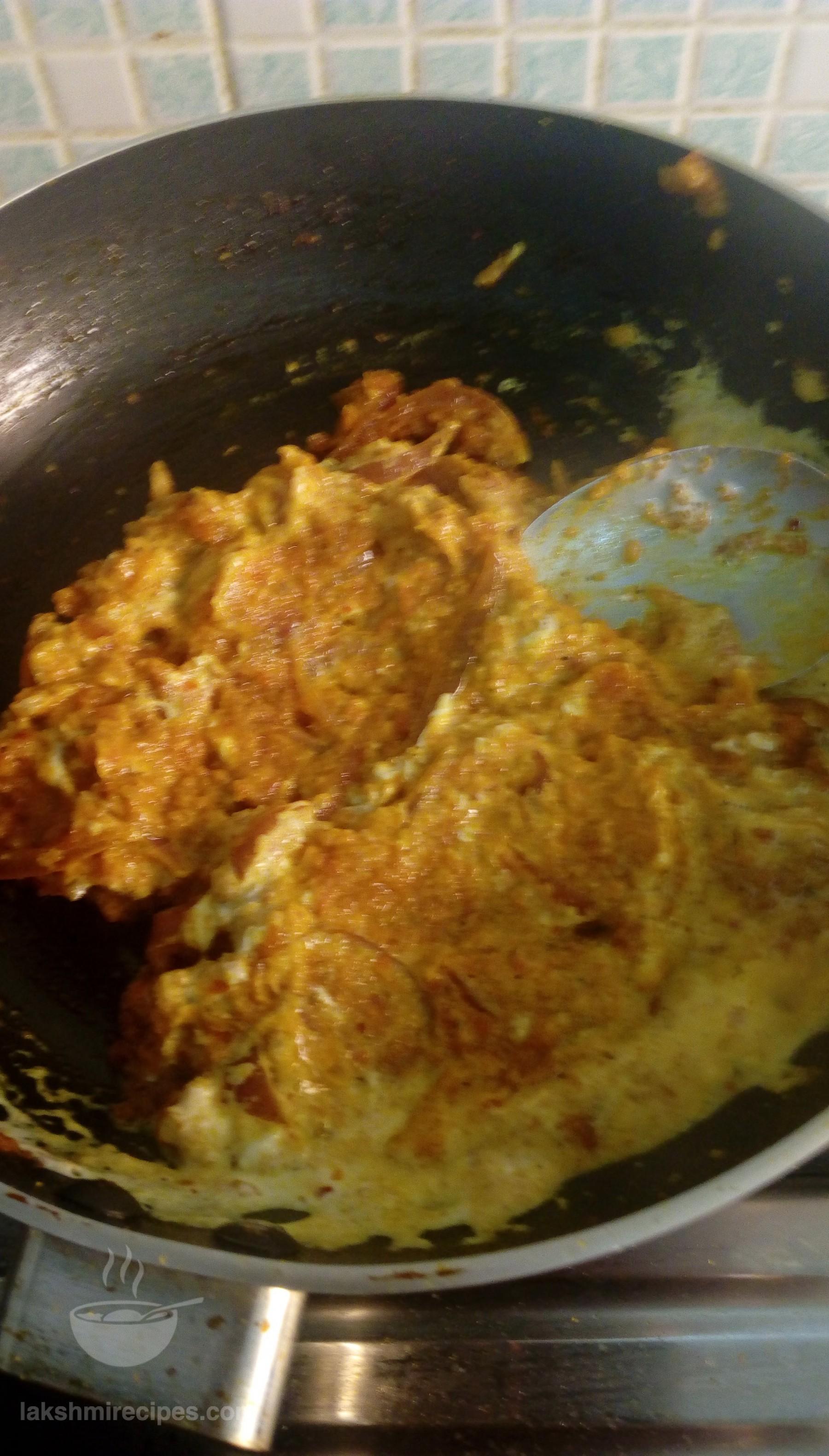 - Heat some ghee in a kadhai and add the remaining half amount of onion (pyaz) and cook till they turn red. Now add the masala paste prepared to the kadhai and cook till the ghee seperates from the masala. Then add fresh cream to it and stir.