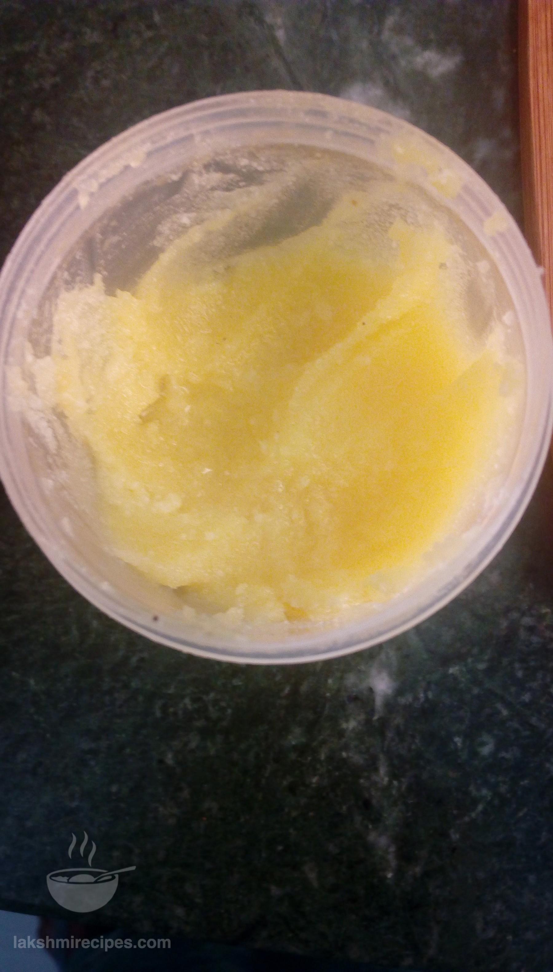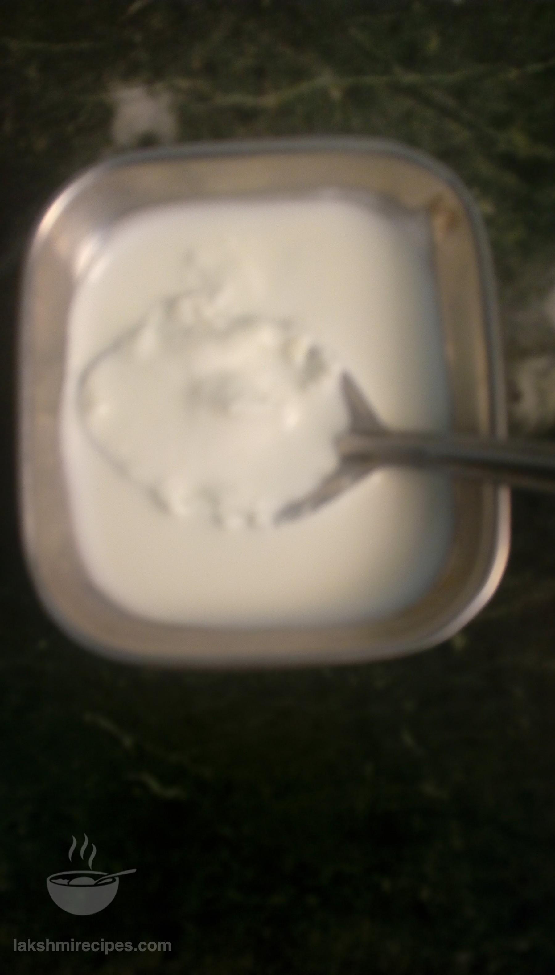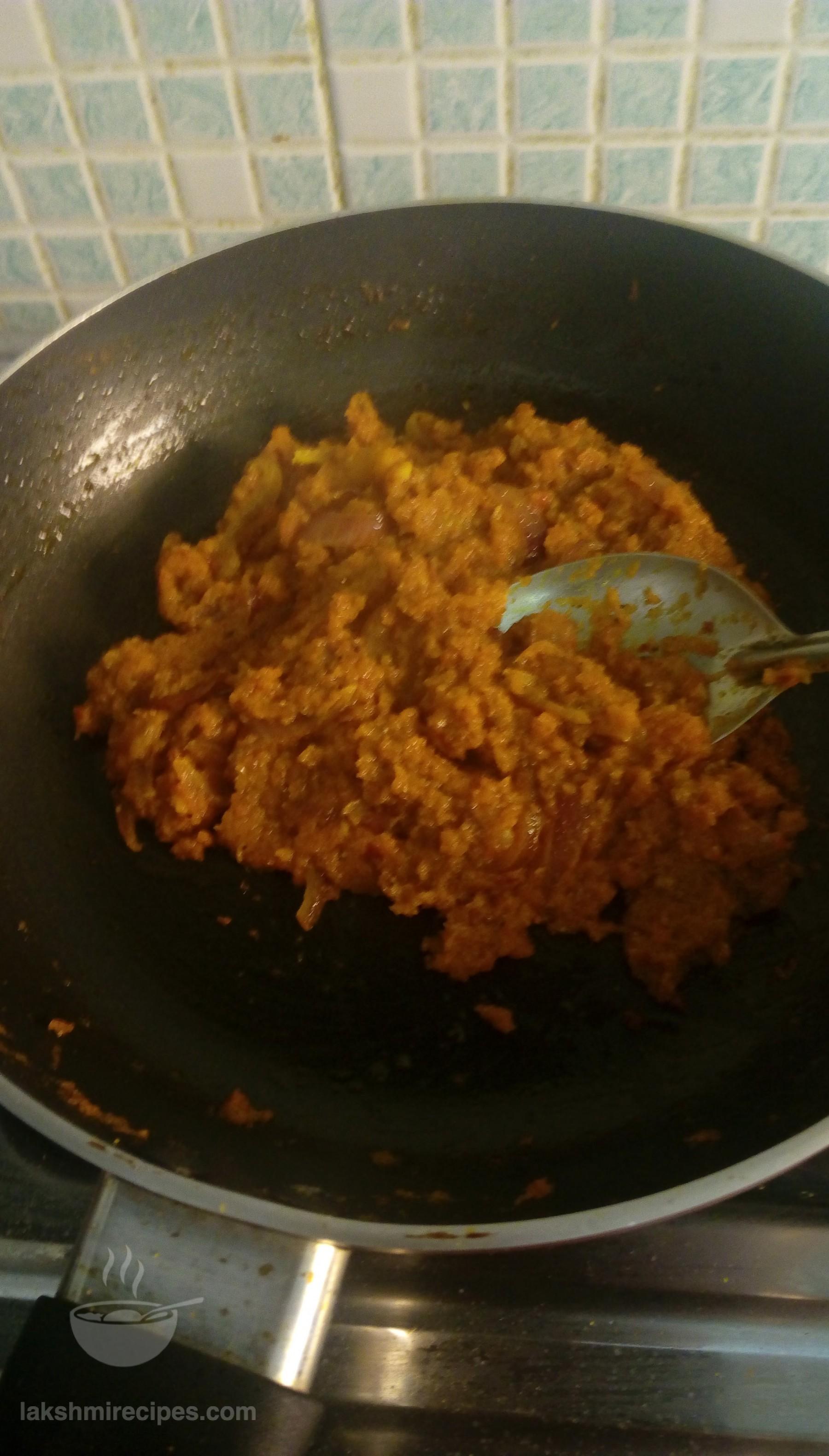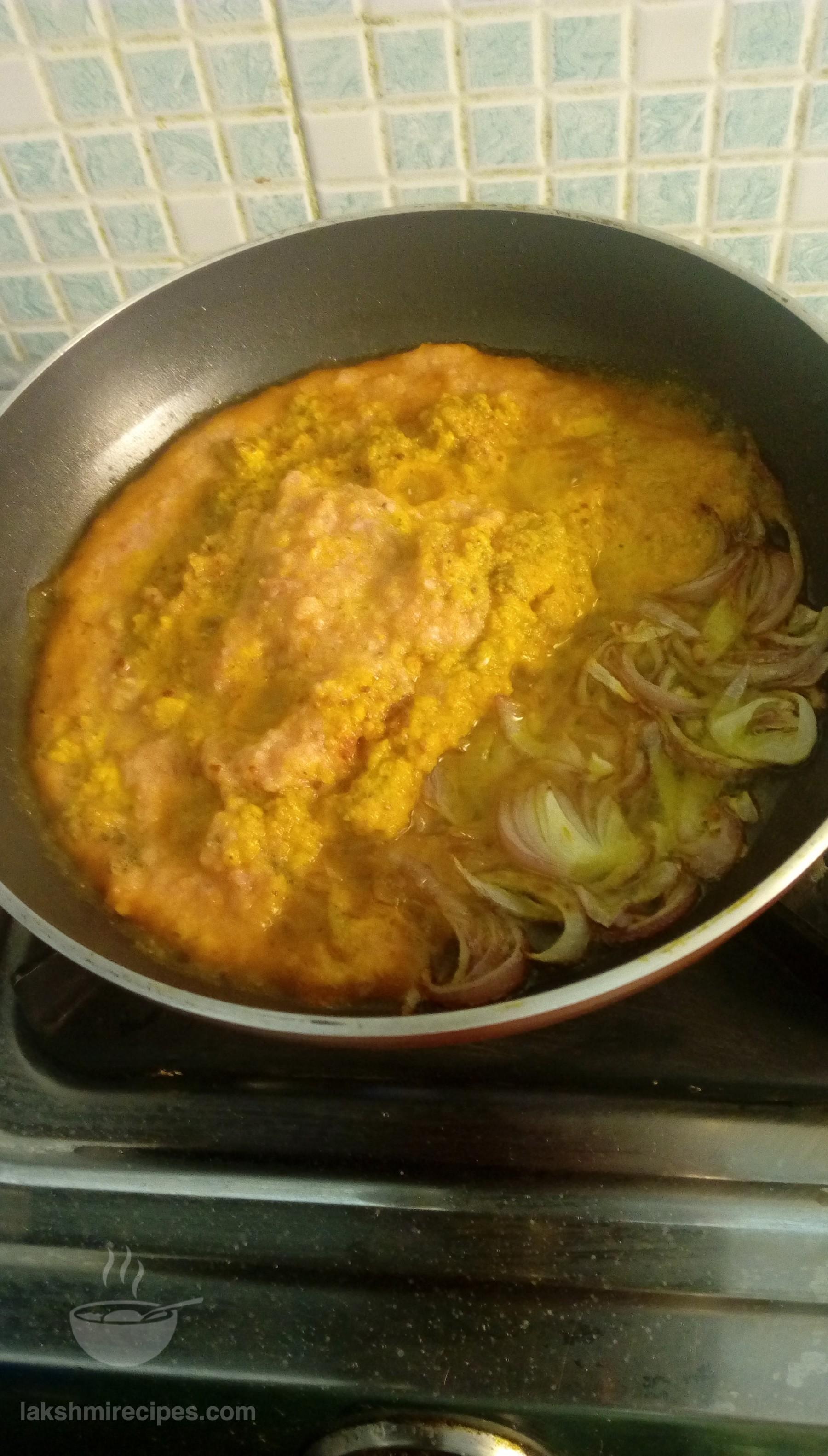- Heat some ghee in a kadhai and add the remaining half amount of onion (pyaz) and cook till they turn red. Now add the masala paste prepared to the kadhai and cook till the ghee seperates from the masala. Then add fresh cream to it and stir.