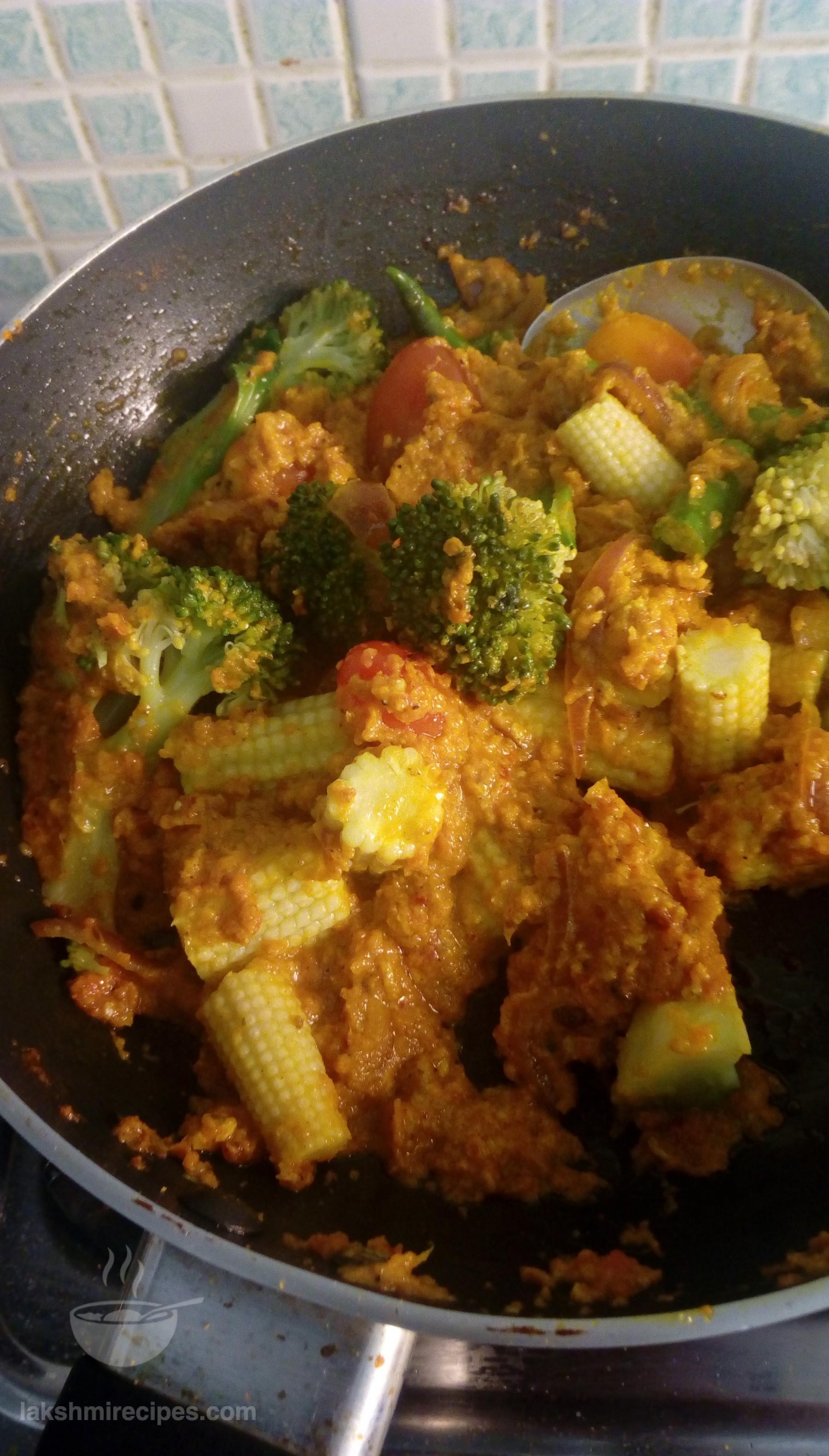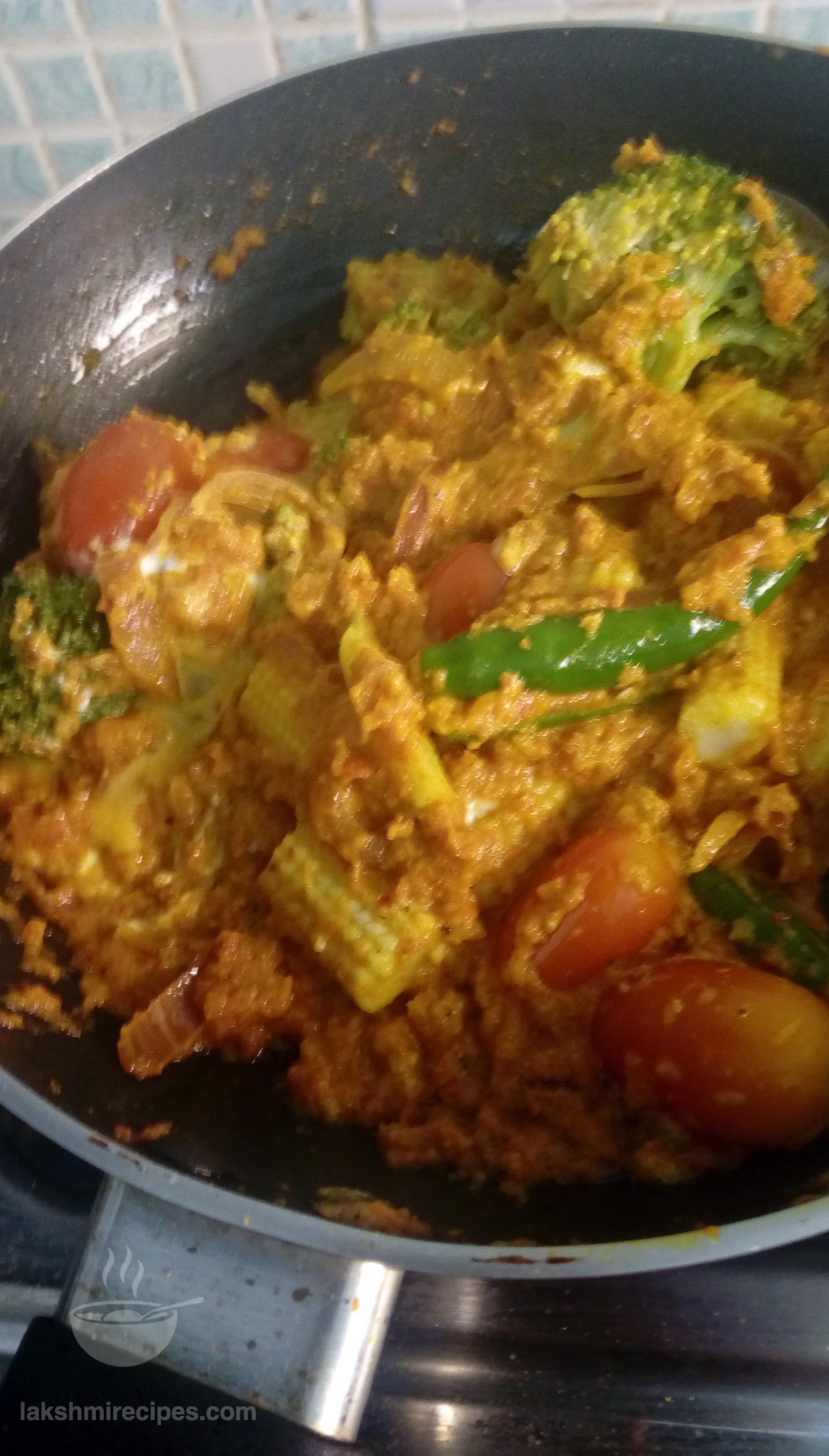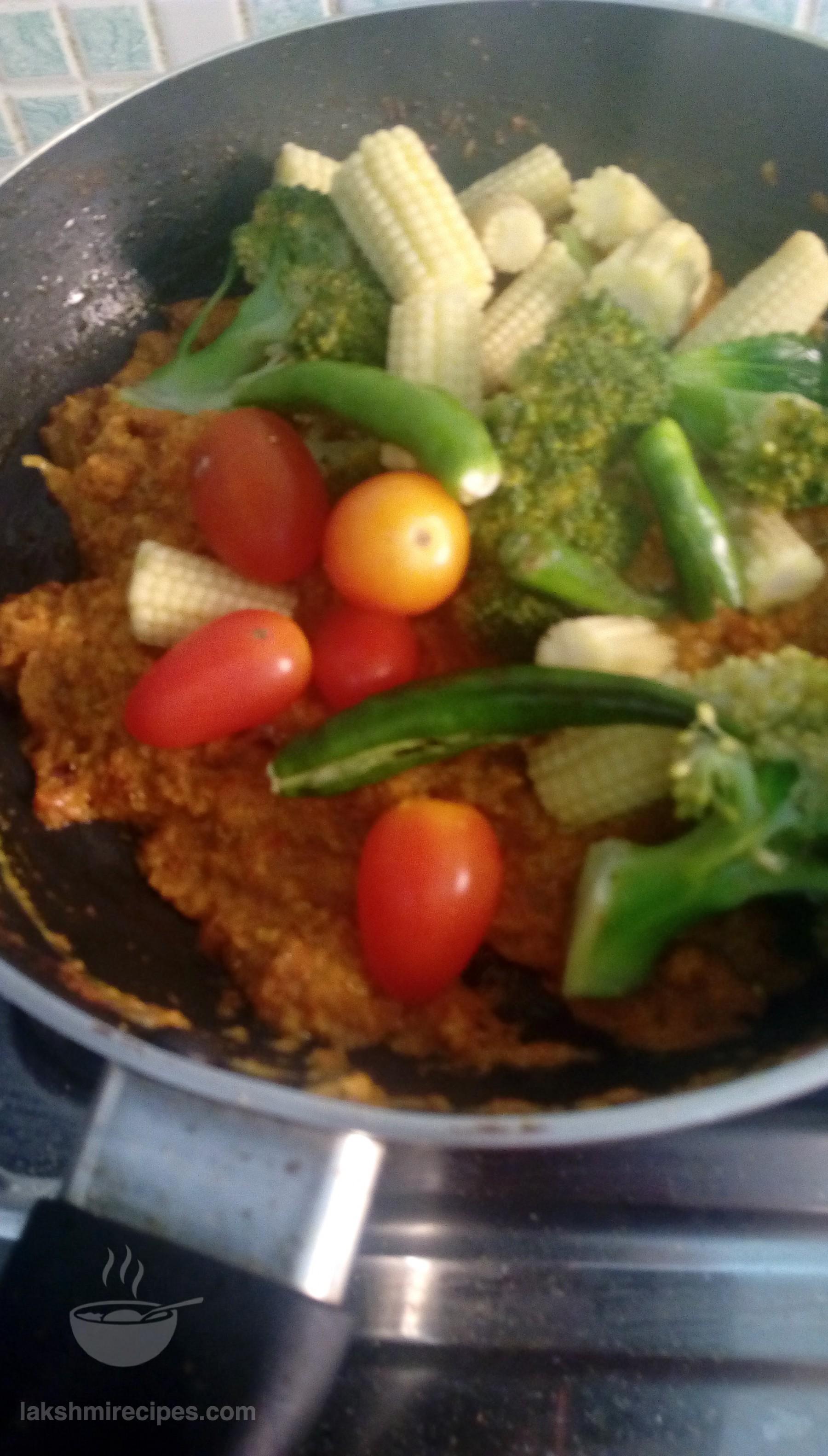 - When the cream mixes well with the masala to form a uniform masala mixture, add all the vegetables into it and stir for 1-2 minutes to mix the vegetables well with the masala.