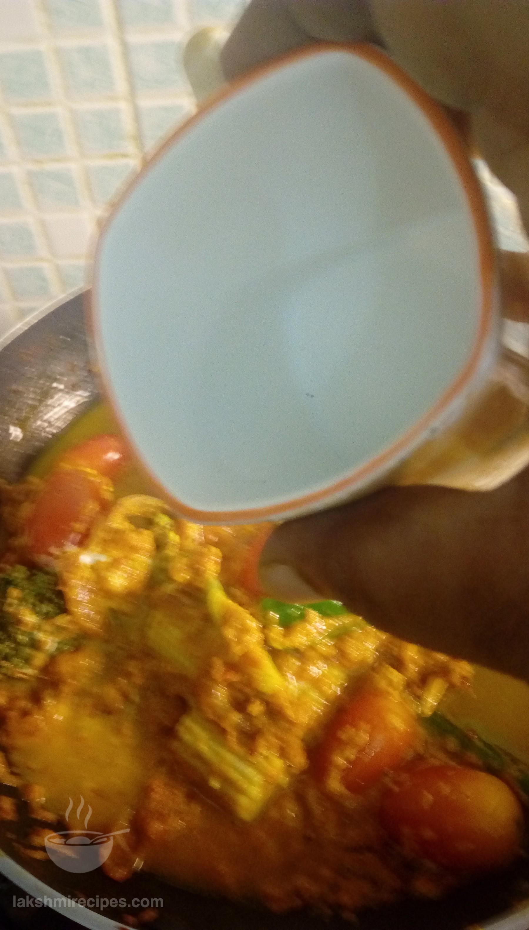 - Now add 1 cup water to it and stir. Cover the kadhai with a lid and allow the vegetables to cook over low flame.
