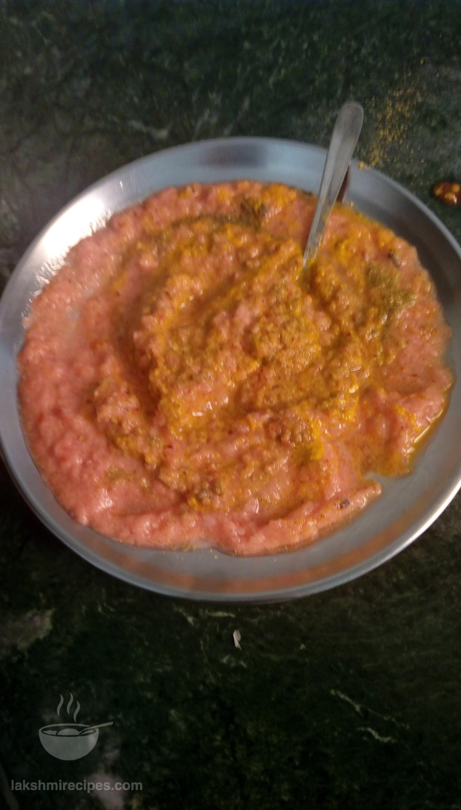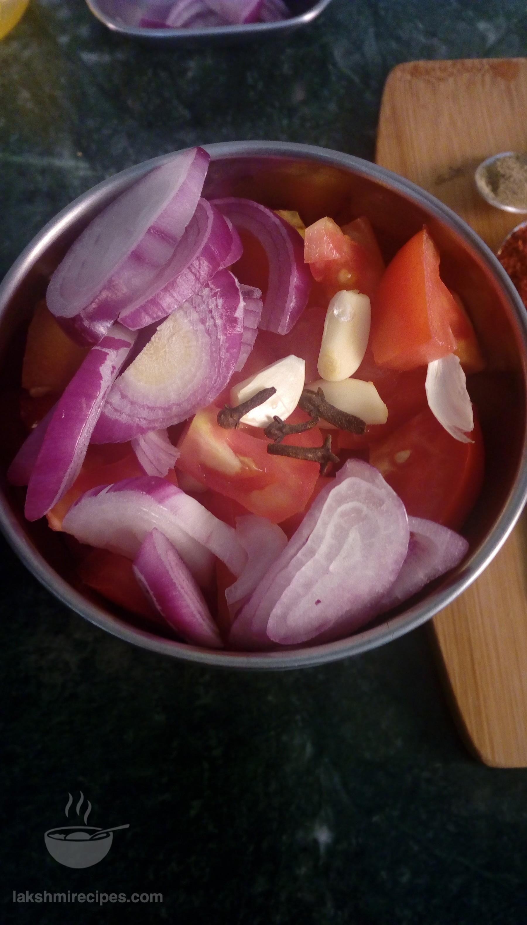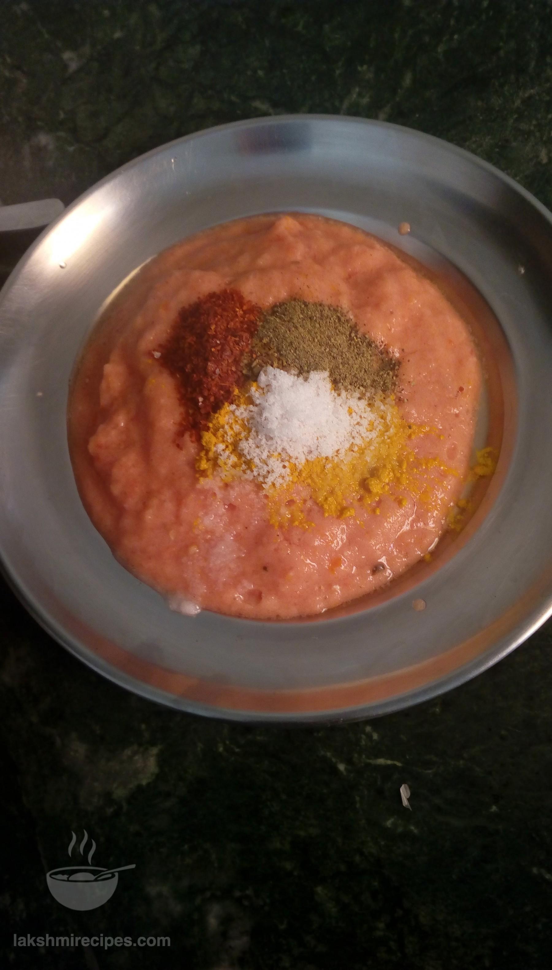 - Now grind the tomatoes, half the amount of onion, cloves (laung) and garlic petals (lehsun ki kali) into a fine paste. Transfer this paste to a plate and add all the spices (haldi powder, lal mirch powder, jeera powder, kali mirch powder and dhaniya powder) and salt amd mix all the ingredients well to form a paste