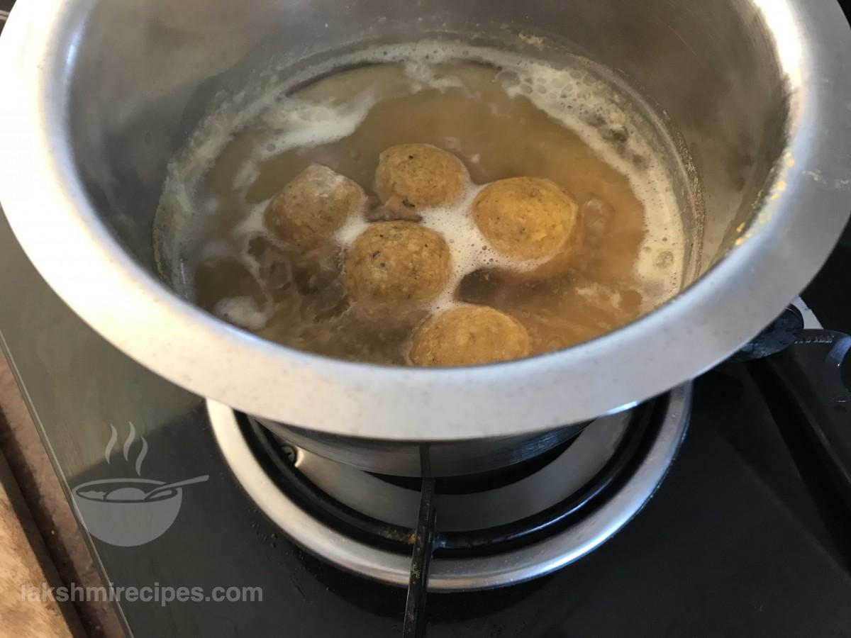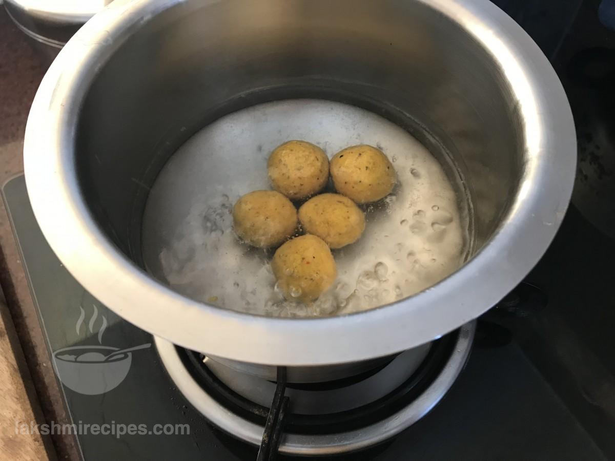 - जब पानी उबलने लगे तो उसमें पिछले चरण में तैयार की हुई छोटी-छोटी नींबू के आकार की गोलियों को डालें। इन गोलियों को उबलते पानी में 7-8 मिनट तक पकाएं।