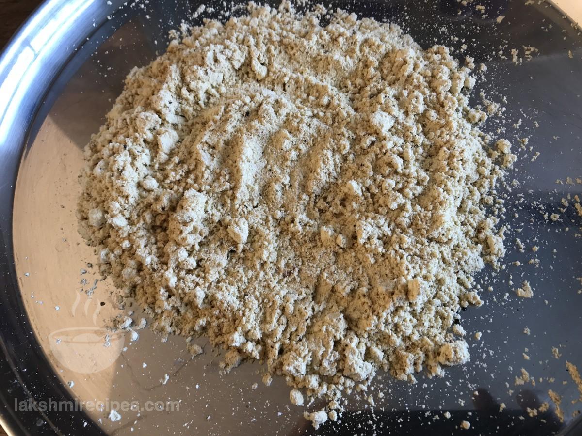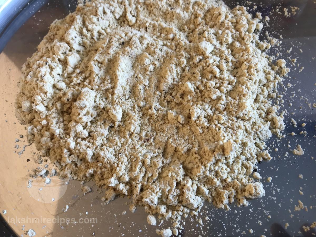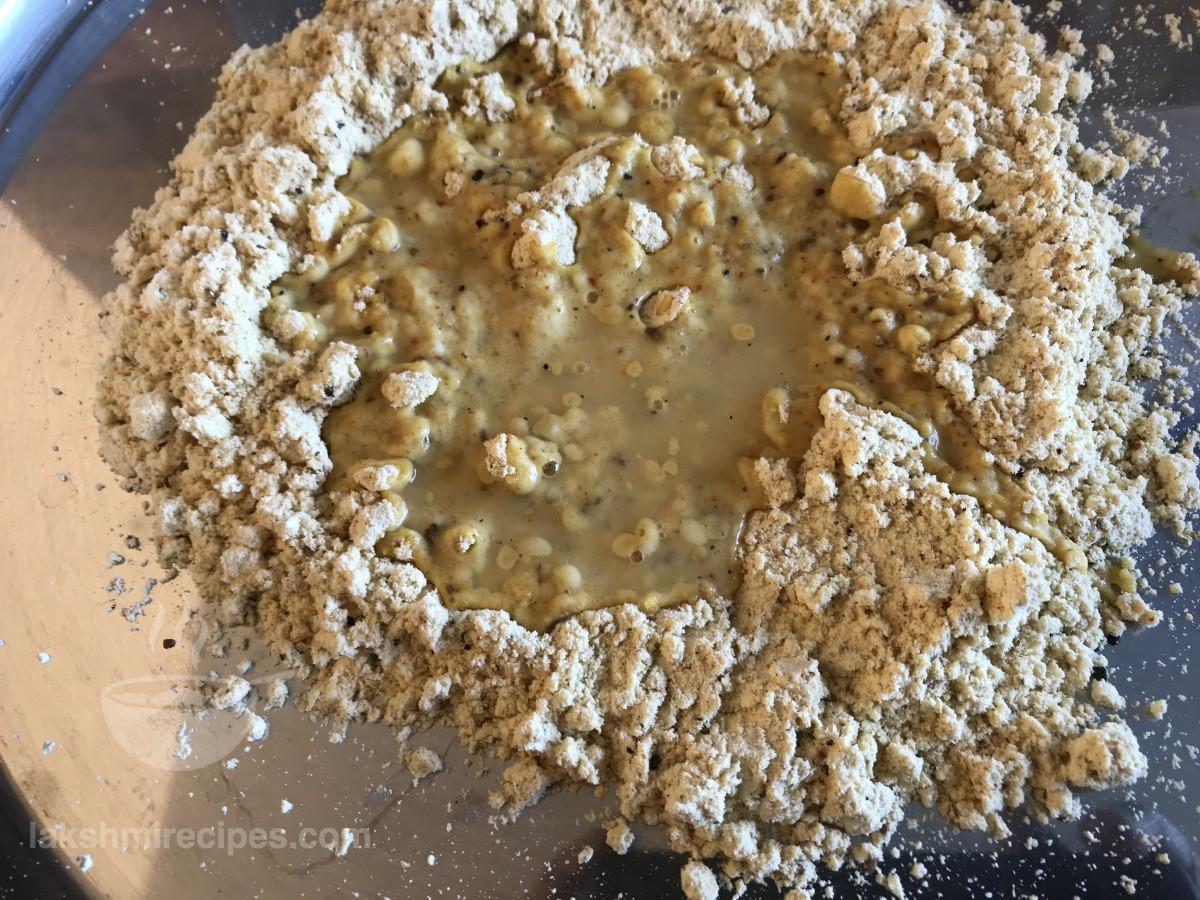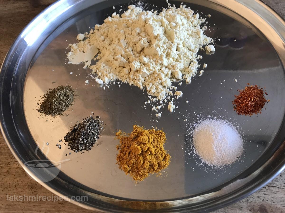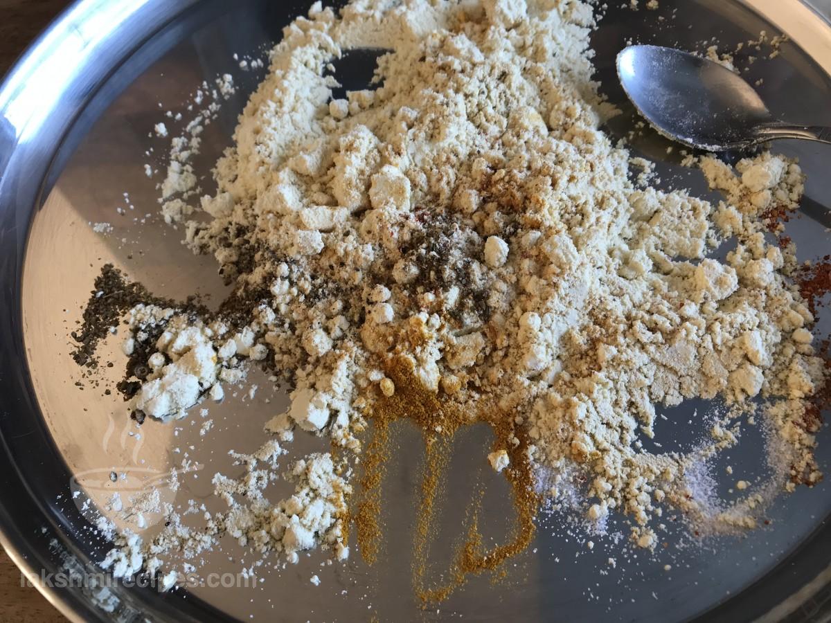 - Then add 1/2 tea spoon of the following powdered spices (turmeric powder, red chilli powder, cumin powder and black pepper powder) the mixing bowl. Mix the dry ingredients well.