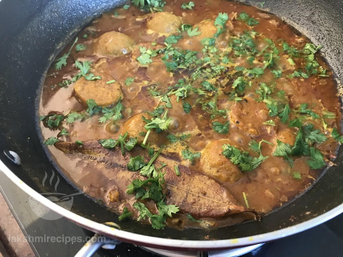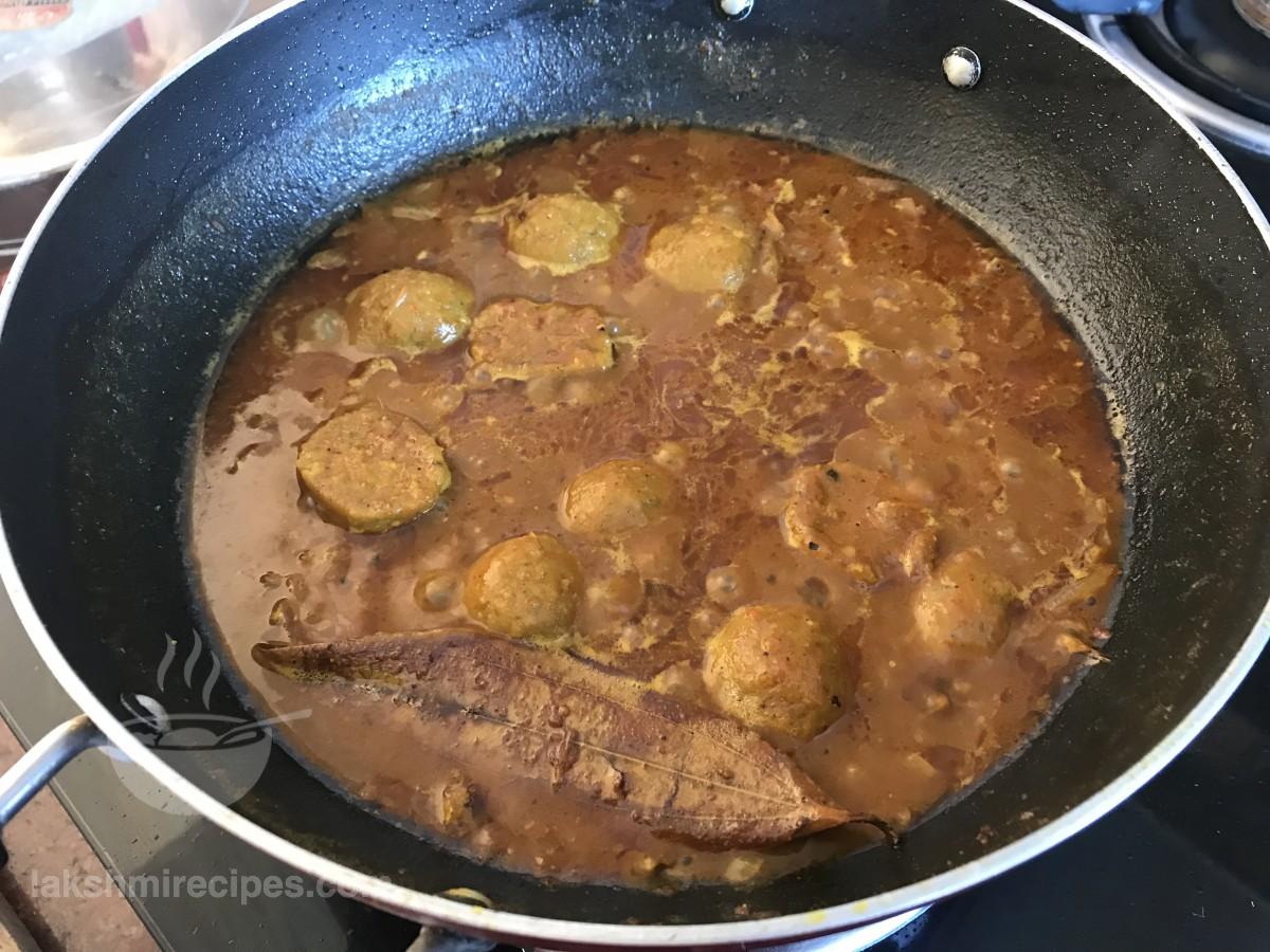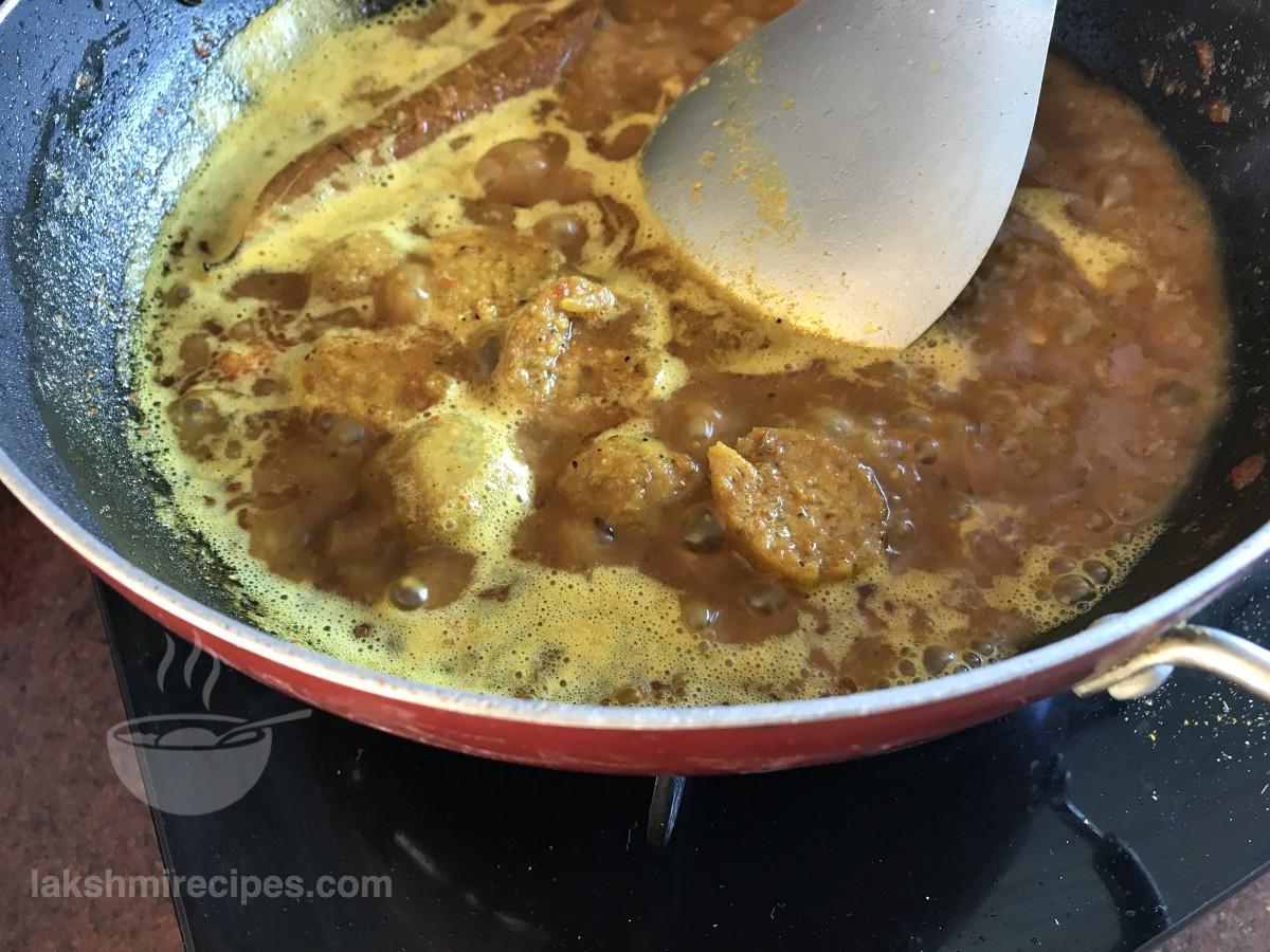 - When the gravy thickens a little then add the dough balls to it and lower the flame. Allow the dough balls to cook in the gravy for 5 minutes.