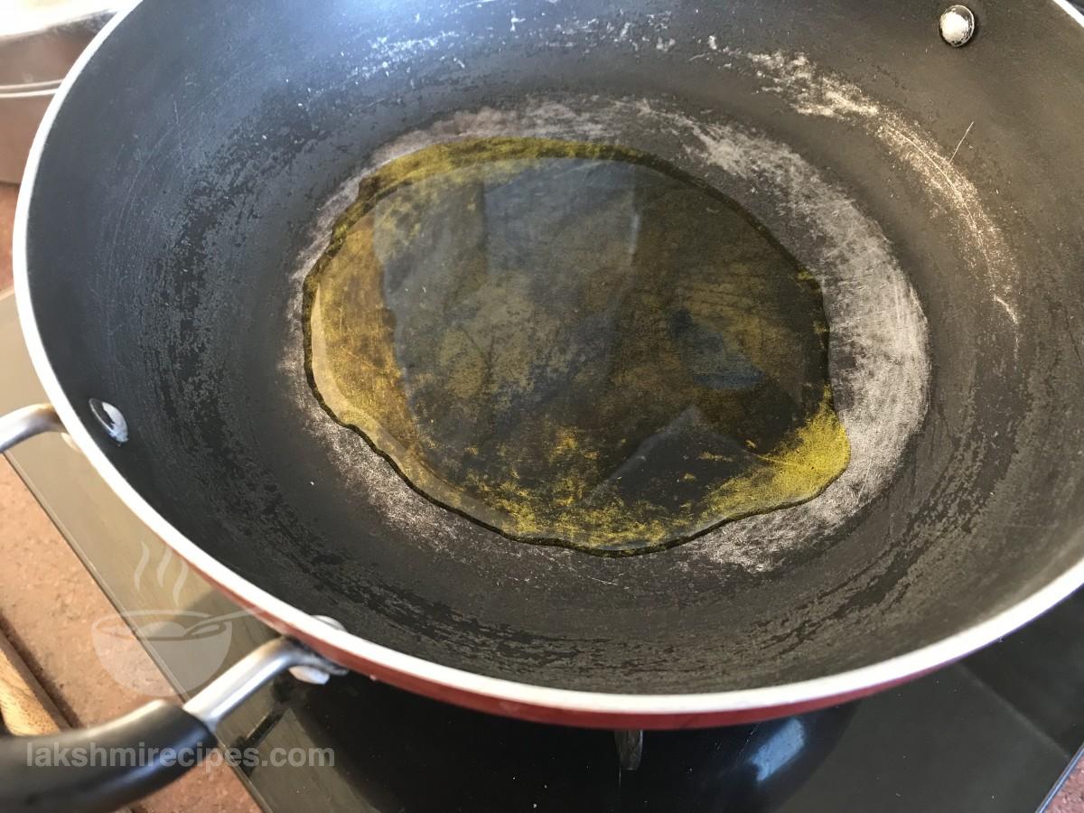 - अब एक कढ़ाई गर्म करें और इसमें 2 बड़ा चम्मच सरसों का तेल डालें।