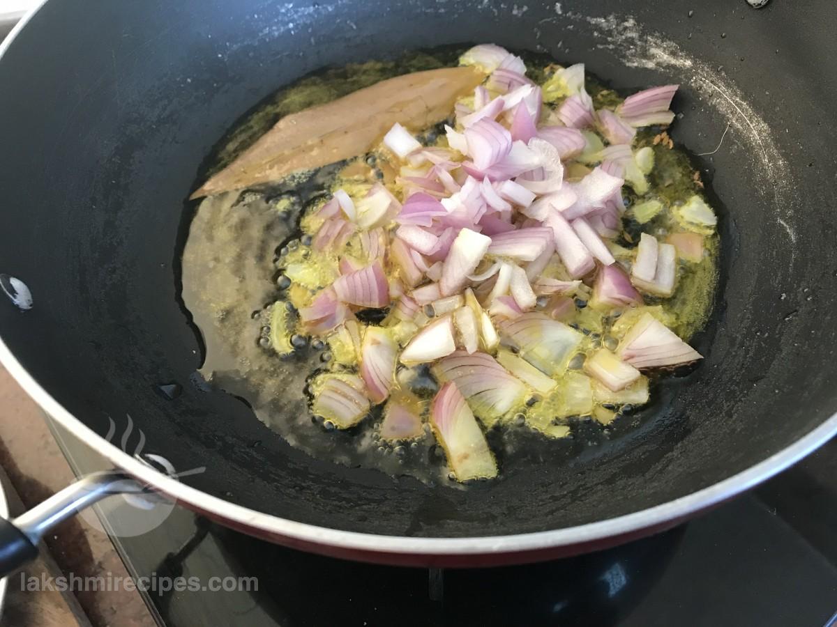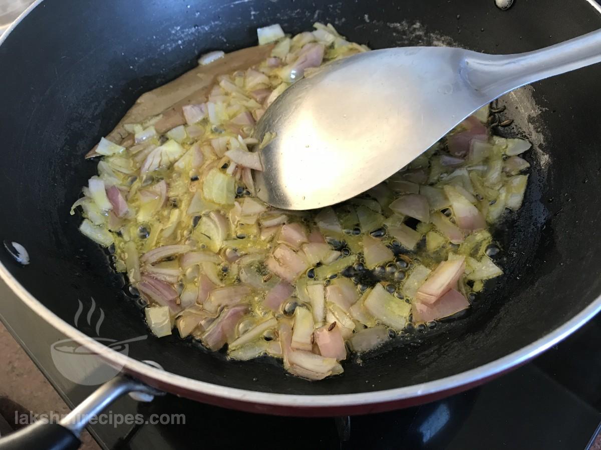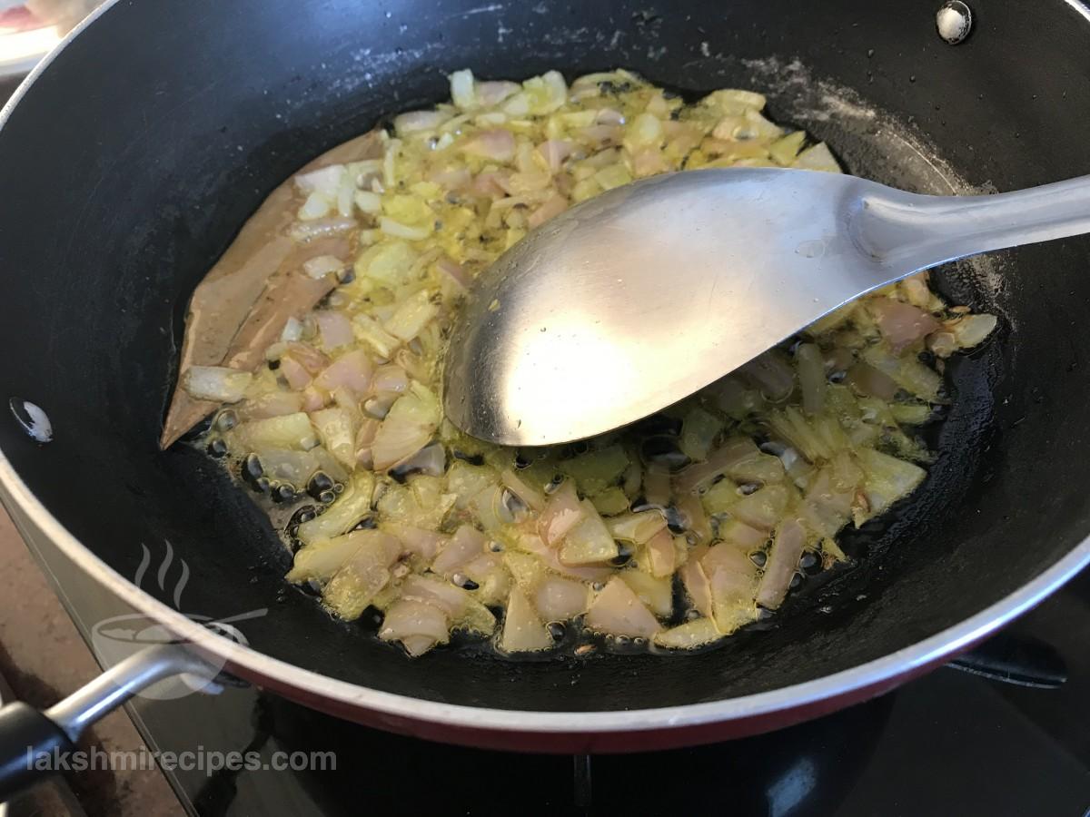 - फिर बारीक कटा हुआ प्याज डालें। कटा हुआ प्याज को रंग में सुनहरा लाल होने तक भूनें।