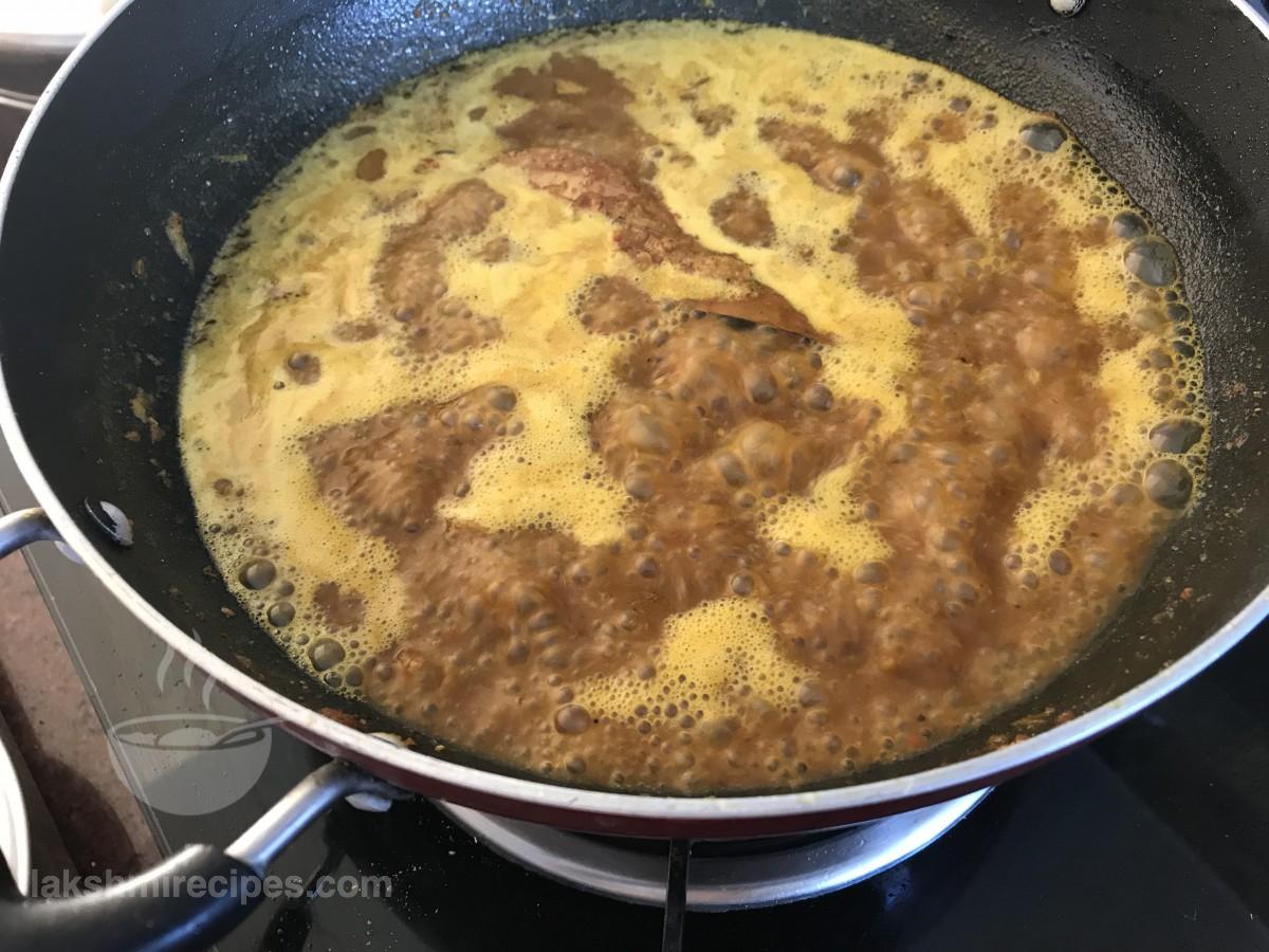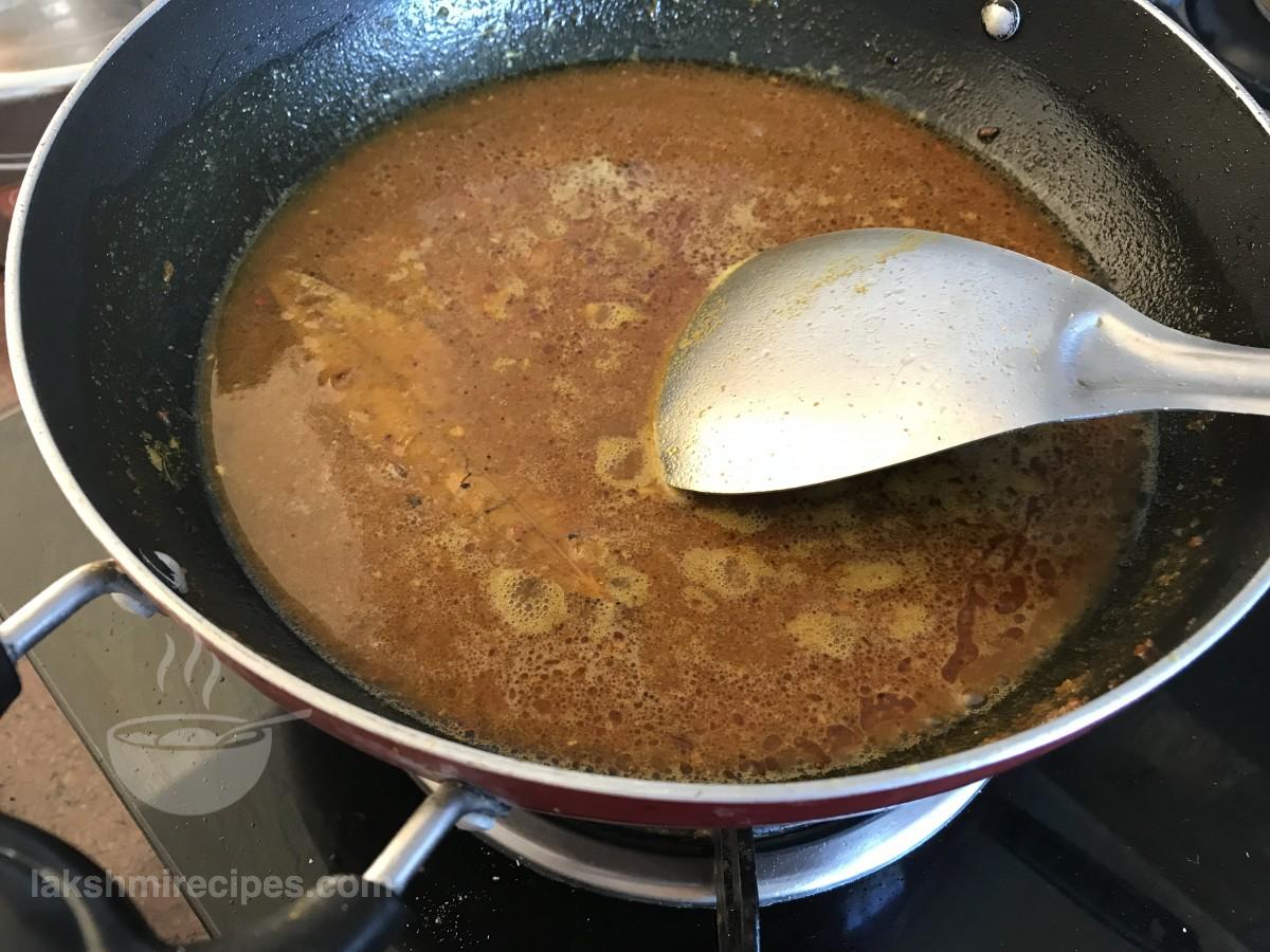 - Now add water as per requirement to the kadhai and stir and mix again. Allow the gravy being prepared to come to a boil. (The amount of water added should be slightly more than required for gravy. Because the dough balls prepared earlier will soak up some gravy when added to it.)