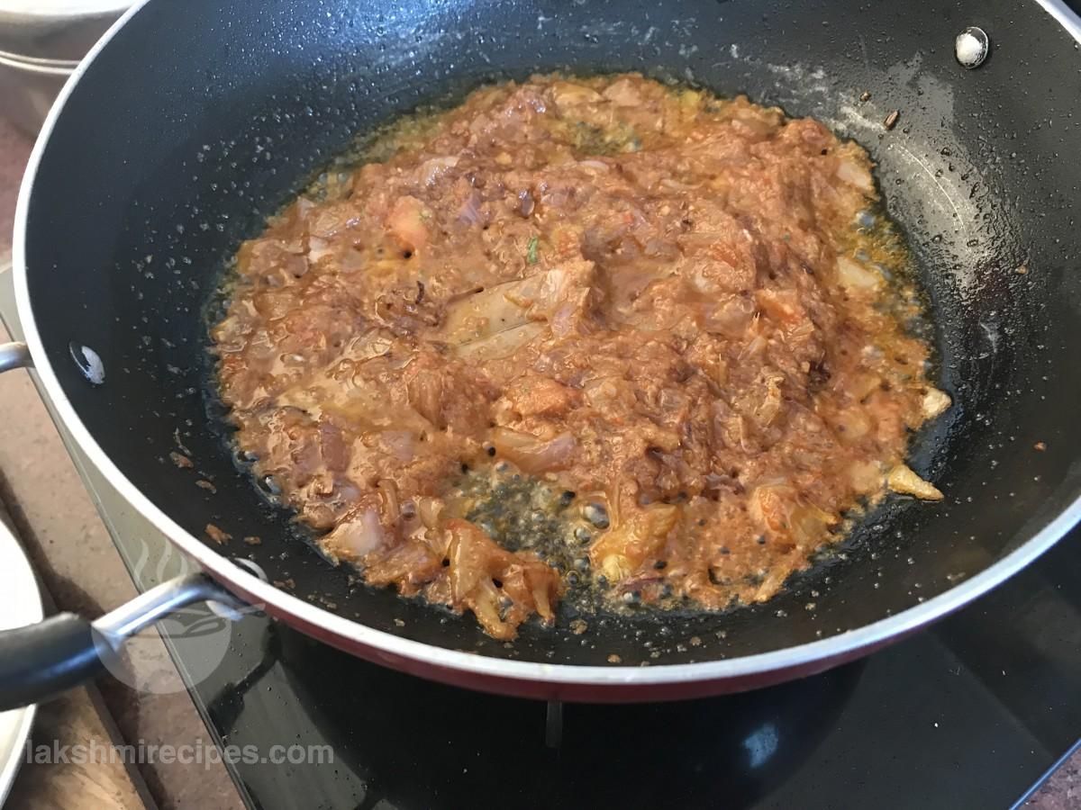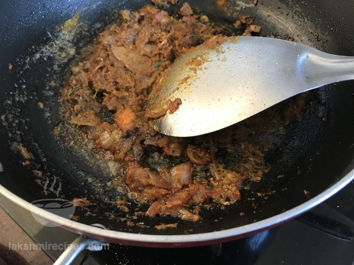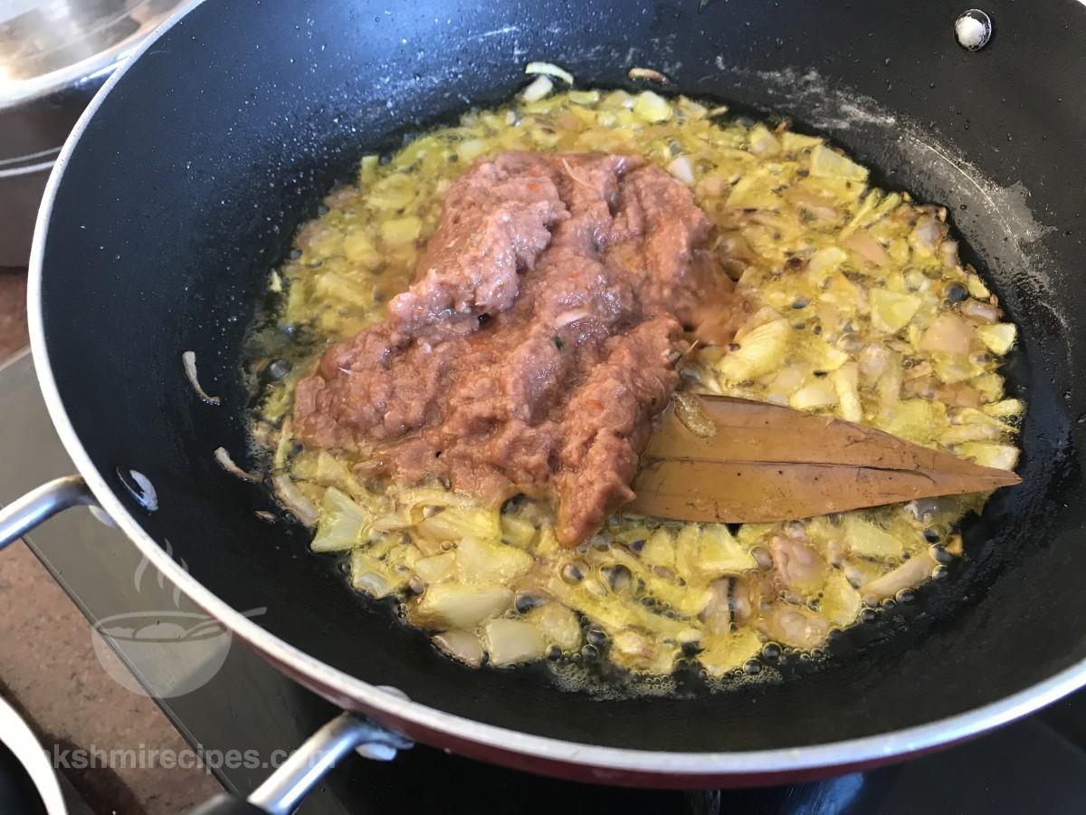 - Now add the paste of tomato-ginger-garlic-green chilli to the cooking ingredients. Stir and cook the ingredients together.