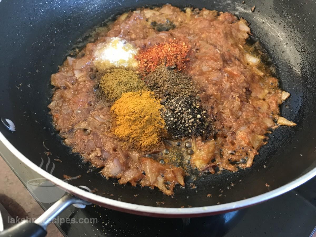 - After a few seconds add the powdered spices (turmeric powder, red chilli powder, cumin powder, black pepper powder and coriander powder) and salt to the cooking ingredients. Stir, mix and cook the ingredients together till the oil begins to seperate from them.