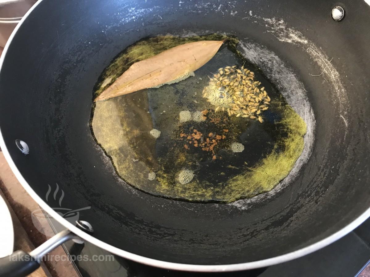 - जब तेल खाना पकाने के लिए पर्याप्त गर्म होजाए तो उसमें जीरा, तेज पत्ता और हींग डालें। जीरा को चटकने दें।