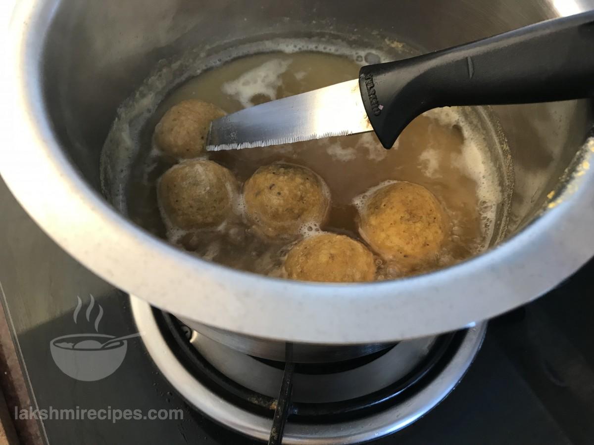 - After 7-8 minutes poke one of these dough ball with a knife to check if they are cooked. If the knife comes out clean then turn off the flame and transfer the cooked dough balls to a plate. Allow them to cool.