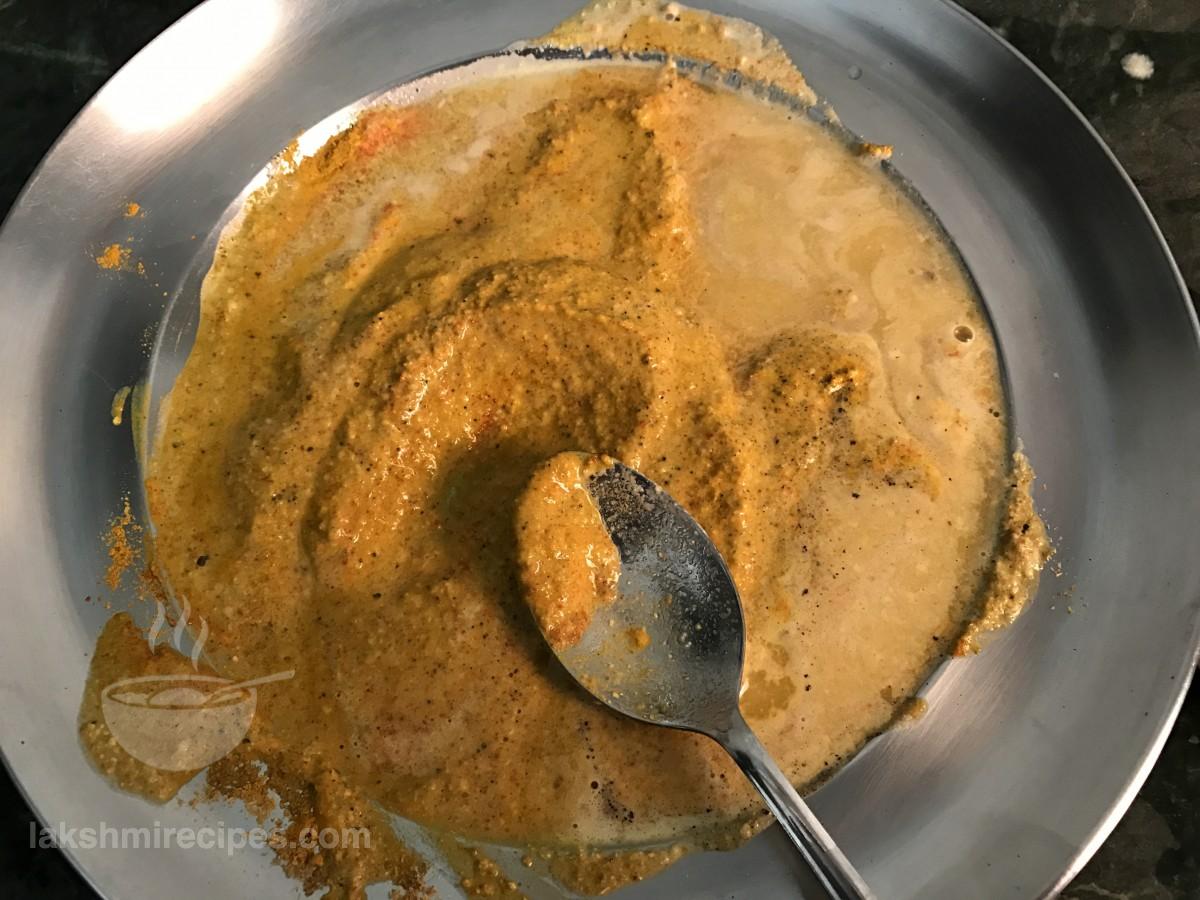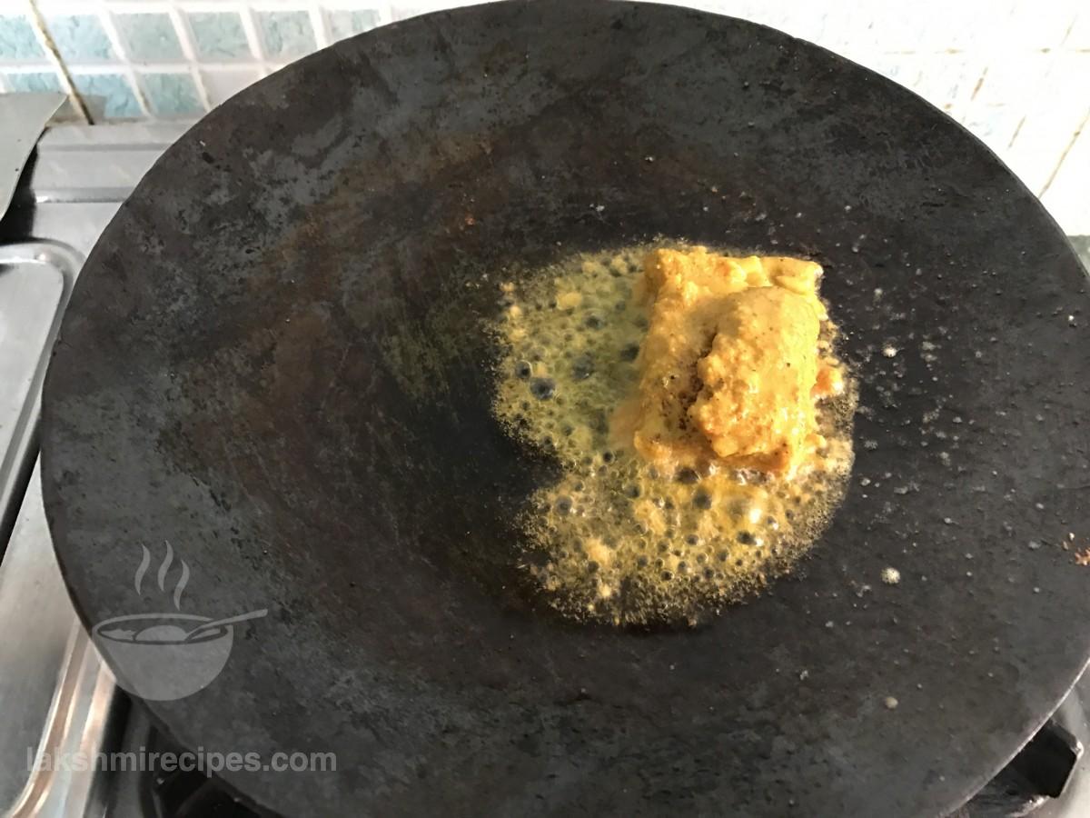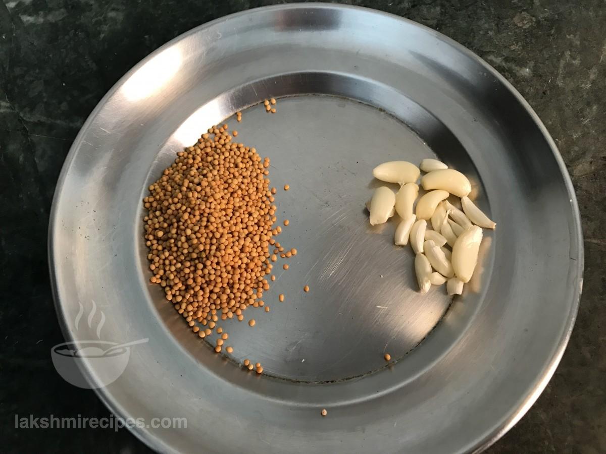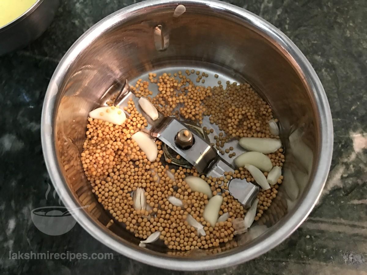 - Take yellow mustard seeds and garlic petals in a mixer jar and add 2 table spoon water to it. Grind the ingredients together to form a fine paste.