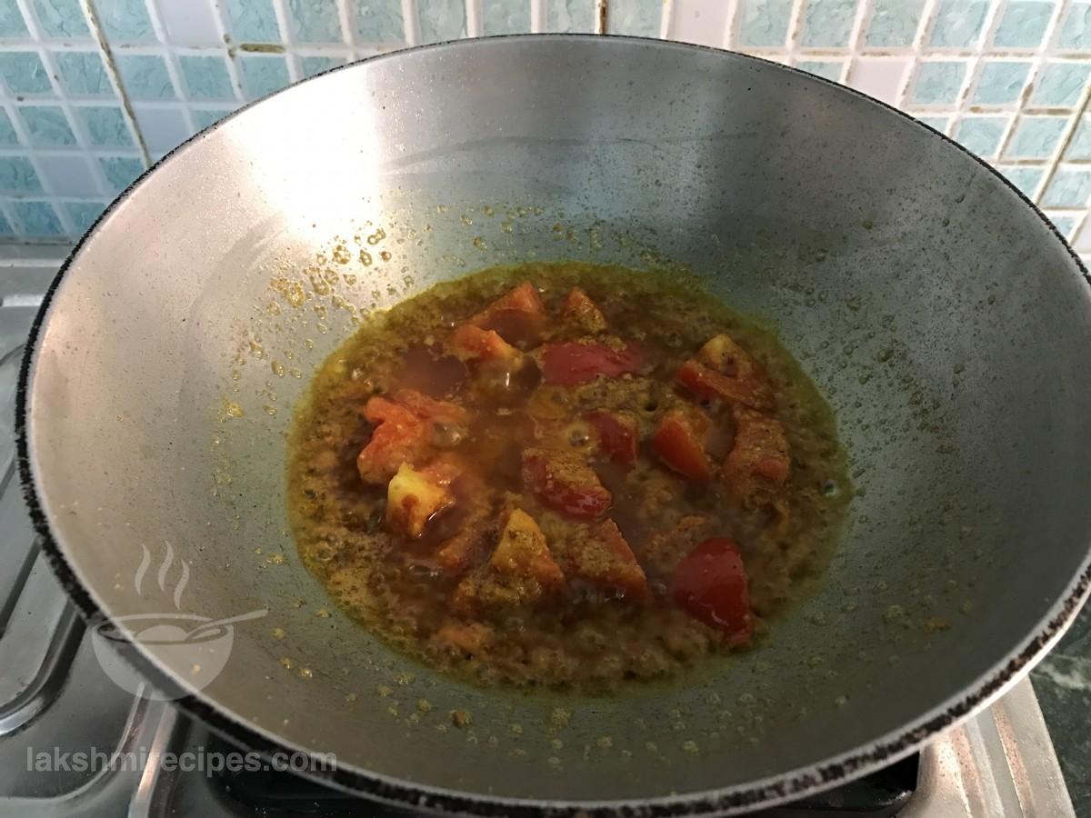 - Then add the remaining mixture of spices to the kadhai. Stir and cook the mixture of spices.