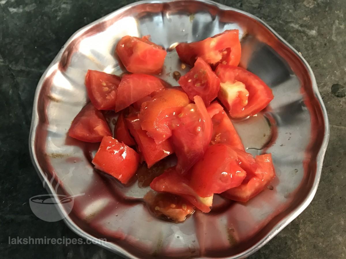 - Then add chopped tomato and a little salt to the cooking ingredients. Adding little salt at this stage will help the tomato pieces to cook easily and the amount of salt gets balanced while making gravy for Besan ki Machhli. Mash and cook the tomato pieces in the spices till they attain a creamy texture and oil begins to seperate from the spices.