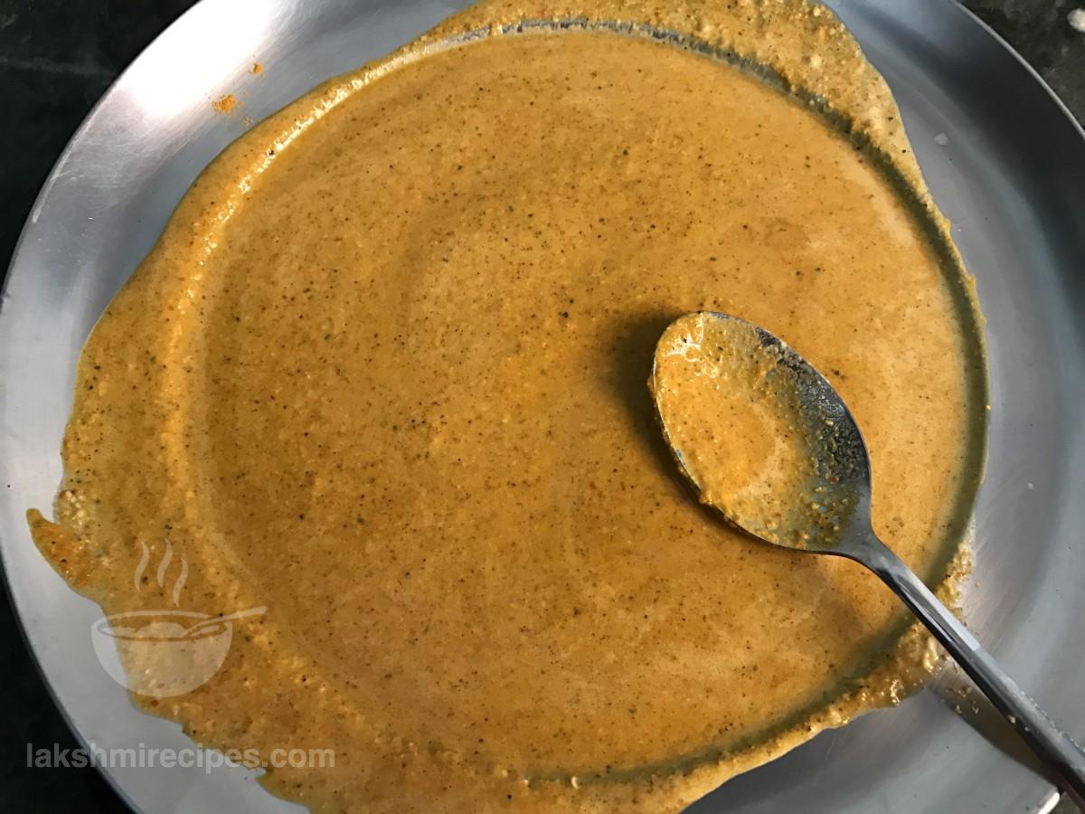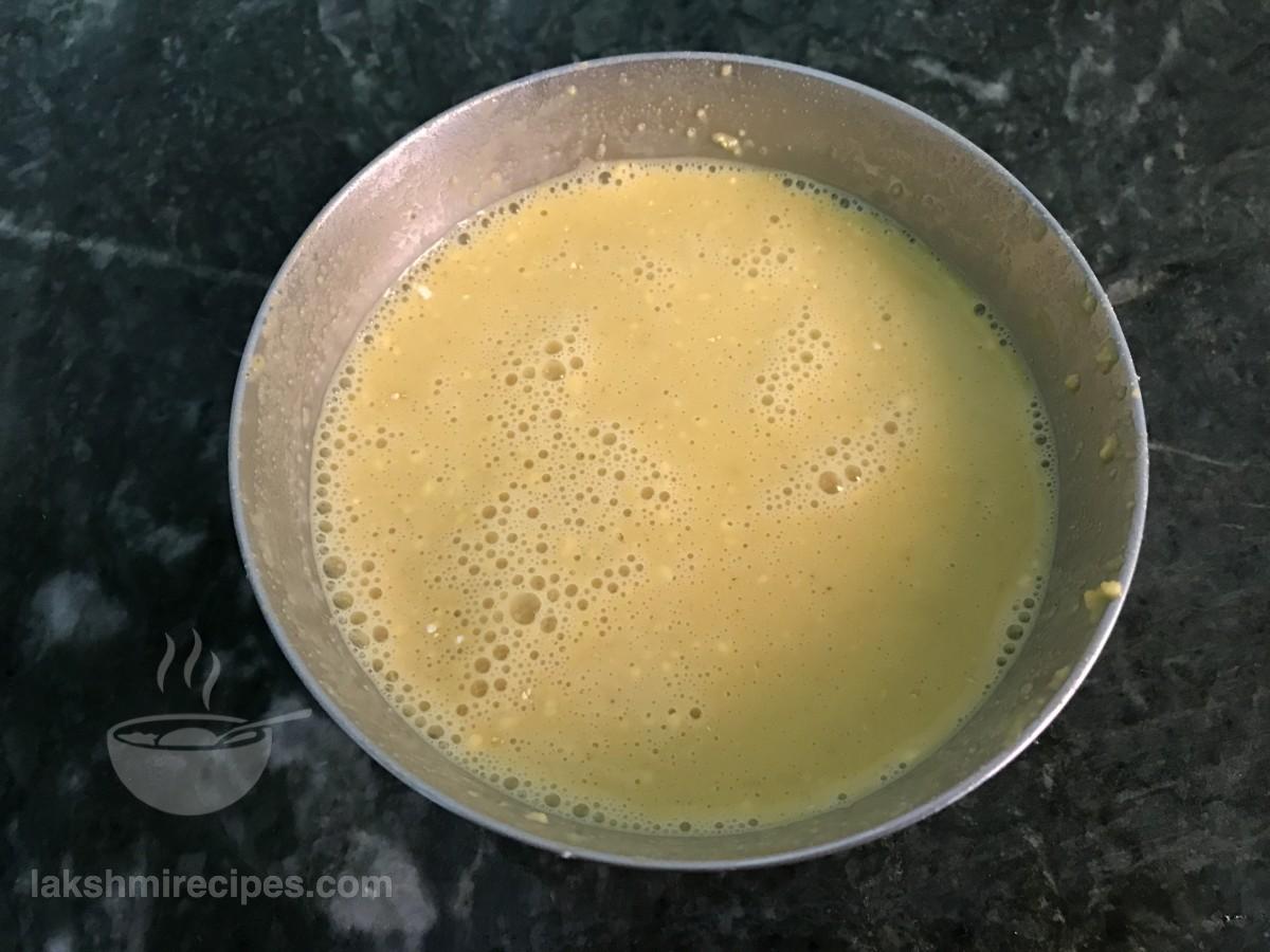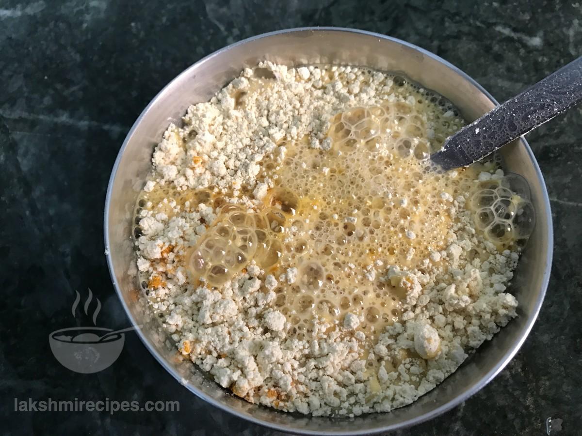 - अब इस सूखे मिश्रण में धीरे-धीरे पानी डालें और सूखे मिश्रण को पानी में घोलकर मोटी स्थिरता का बैटर तैयार करें। फिर इस बैटर में धीरे-धीरे और पानी डालकर मिलाएं, जिस्से कि एक मध्यम पतली स्थिरता का बैटर बनकर तैयार होजाए। बैटर की स्थिरता बेसन का चीला बनाने के बैटर के समान होना चाहिए।
