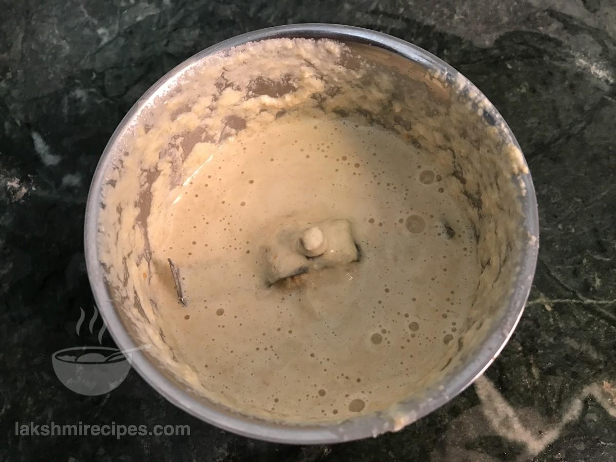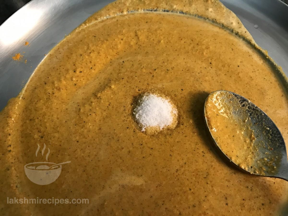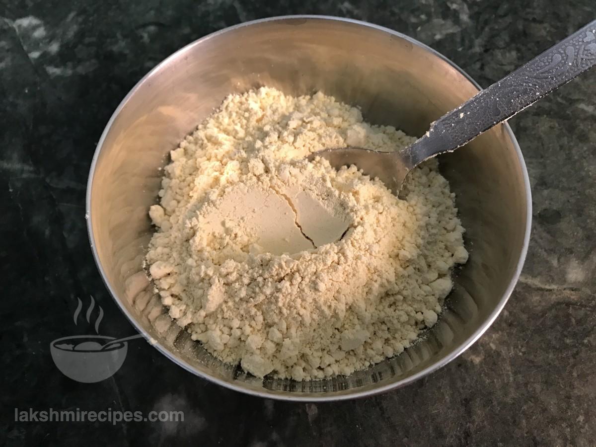 - अब इस सूखे मिश्रण में धीरे-धीरे पानी डालें और सूखे मिश्रण को पानी में घोलकर मोटी स्थिरता का बैटर तैयार करें। फिर इस बैटर में धीरे-धीरे और पानी डालकर मिलाएं, जिस्से कि एक मध्यम पतली स्थिरता का बैटर बनकर तैयार होजाए। बैटर की स्थिरता बेसन का चीला बनाने के बैटर के समान होना चाहिए।