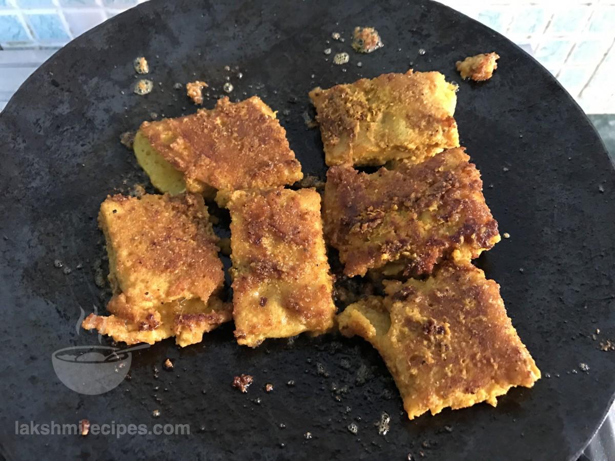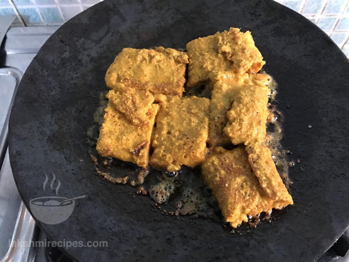 - Place this coated piece over the hot tawa. Coat and place the remaining pieces on the hot tawa or non-stick pan in the same way. Lower the flame to low level. Shallow fry the coated pieces over low flame till they turn crispy red on one side.