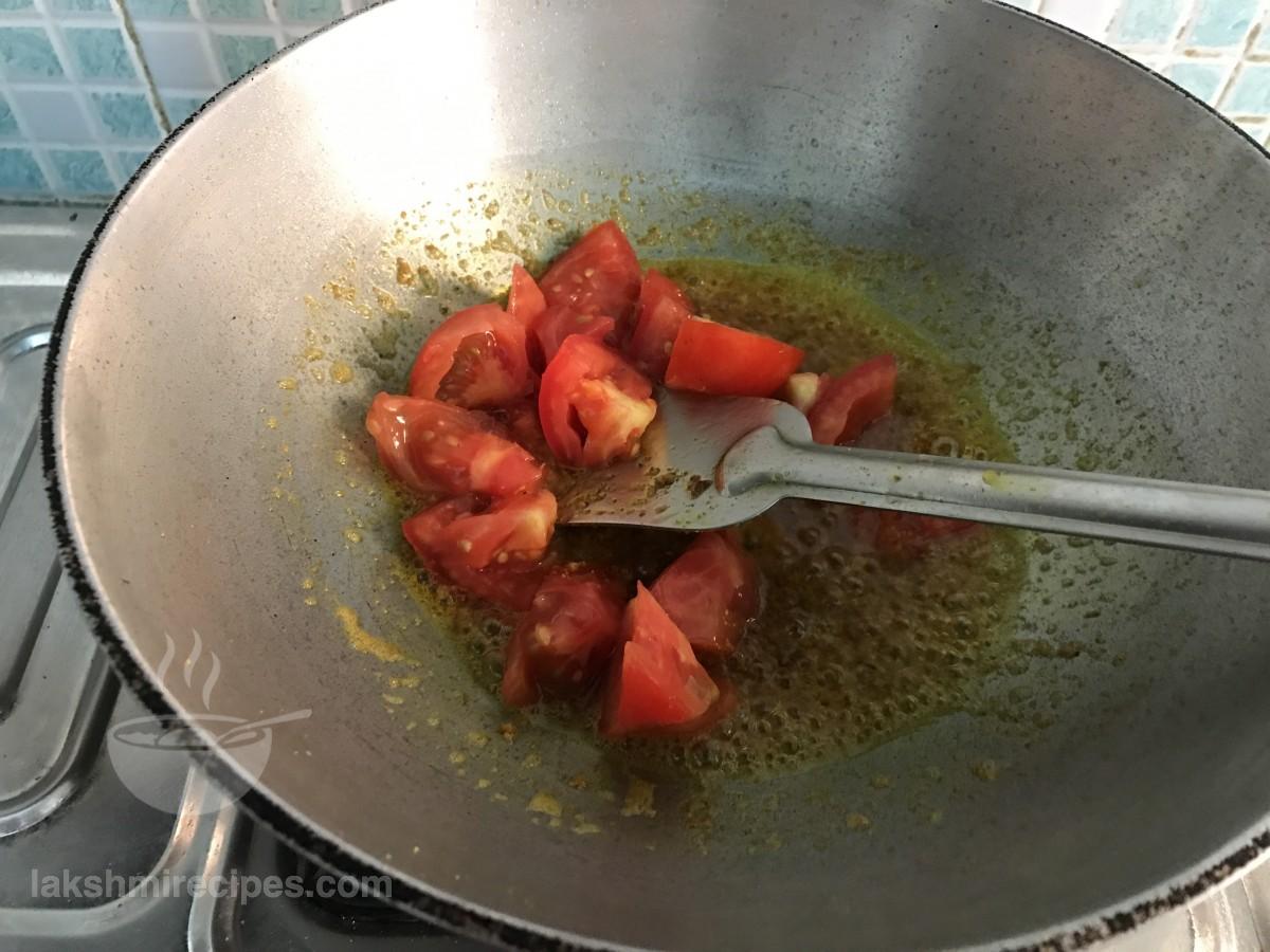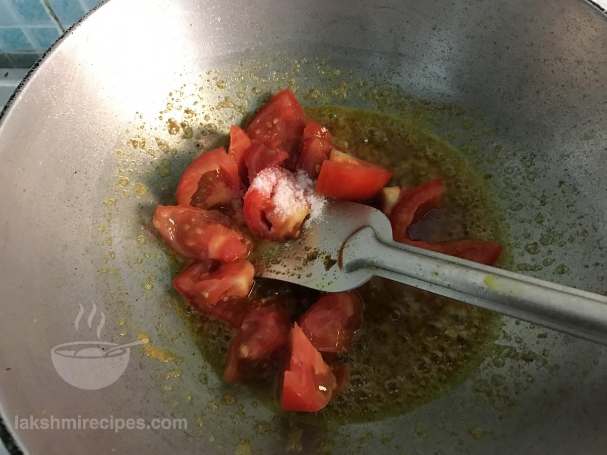 - फिर इसमें कटा हुआ टमाटर और थोड़ा नमक डालें। इस स्तर पर थोड़ा नमक डालने से टमाटर के टुकड़ों को आसानी से पकने में मदद मिलेगी और बेसना की मछली की ग्रेवी में नमक की मात्रा भी संतुलित हो जाएगी। टमाटर के टुकड़ों को मैश करते हुए और मसालों के साथ पकाएं जब तक मसाले से तेल अलग न होने लगे।