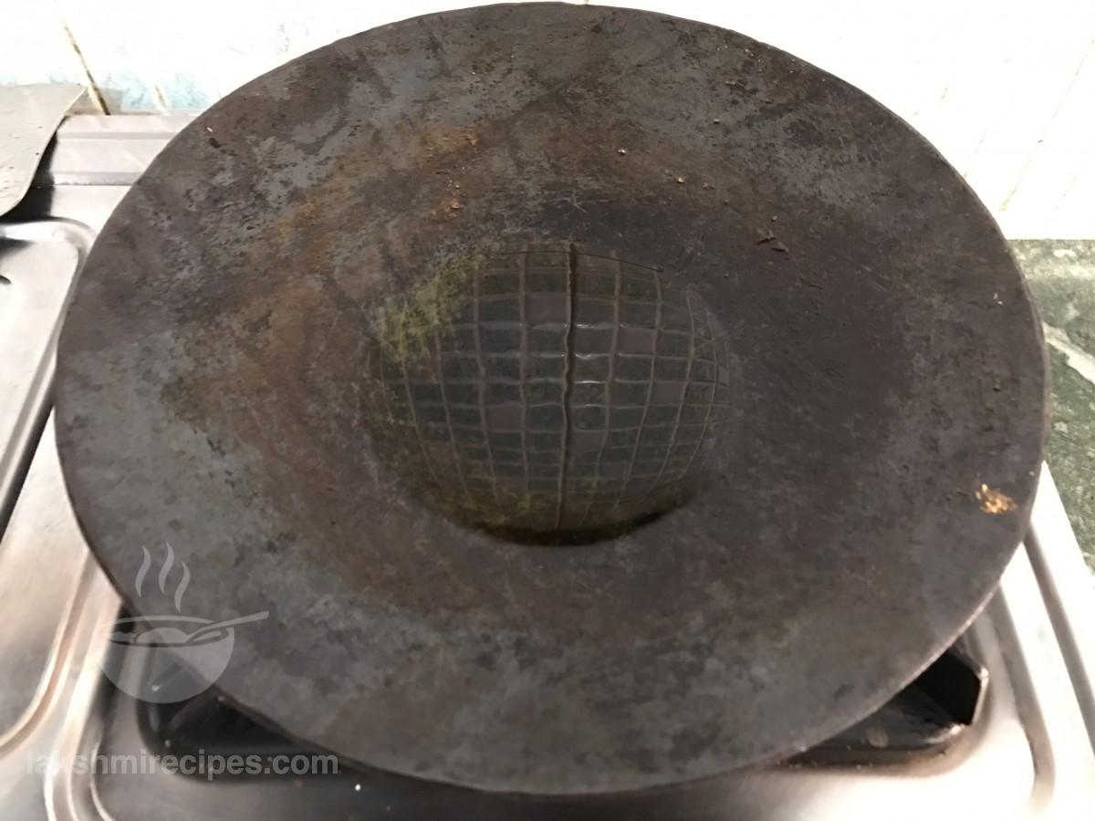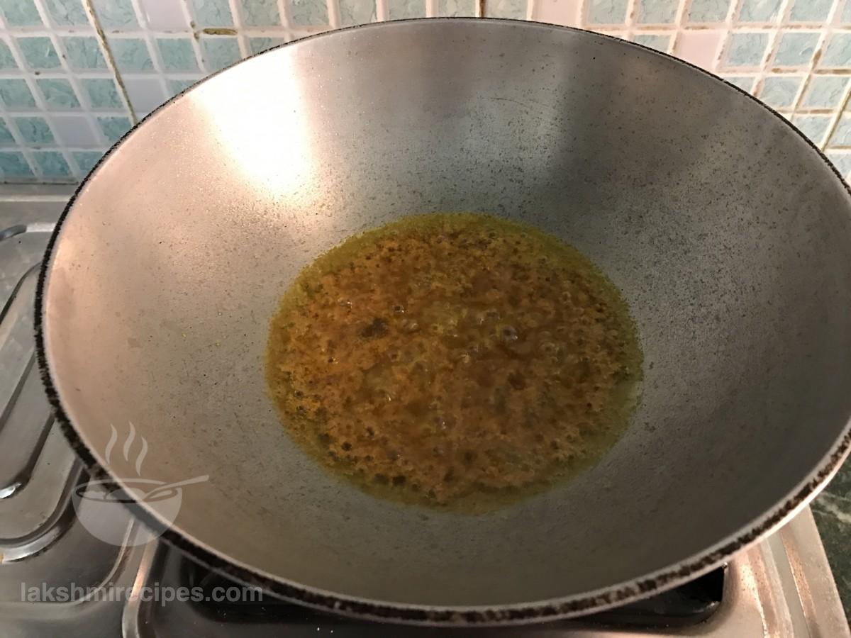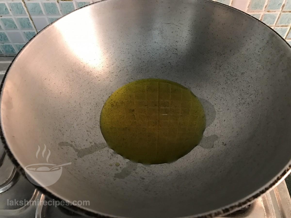 - Heat a kadhai and pour some mustard oil in it. Allow the oil to become hot enough for cooking.