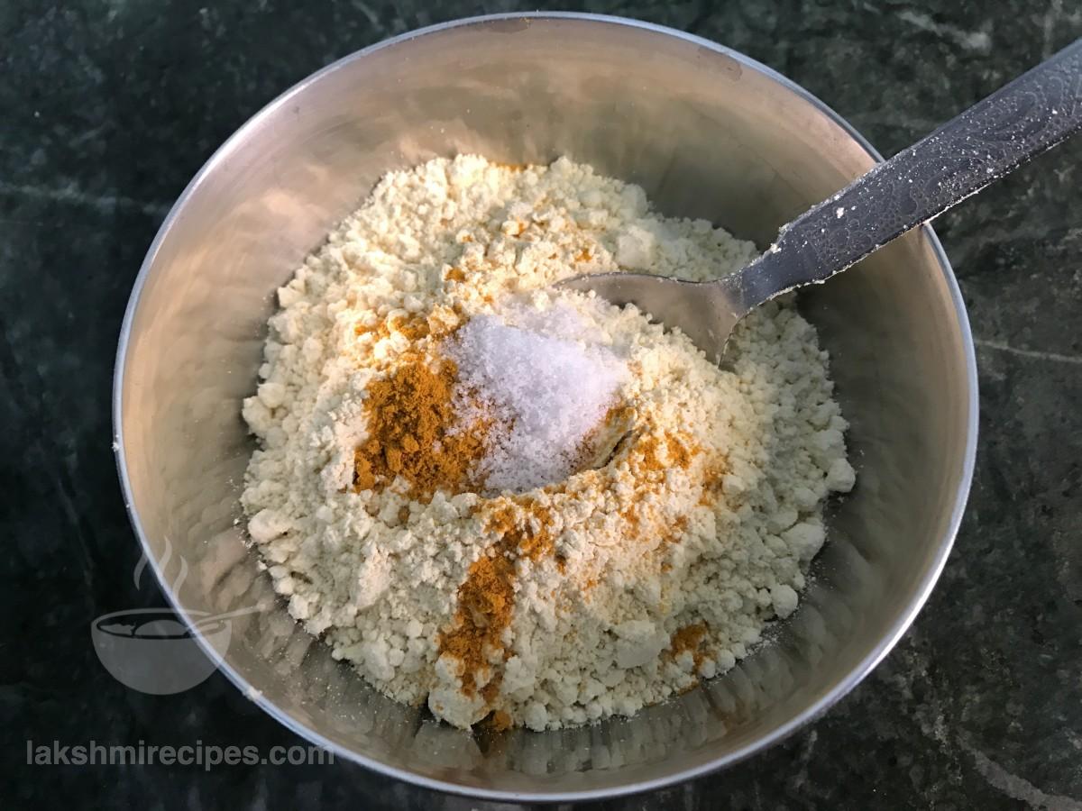 - Take a deep mixing bowl or vessel and add gram flour, 1/2 tea spoon turmeric powder and a little salt to it. (Add little salt only at this moment, because we will add salt as per taste in the gravy for Besan Ki Machhli. Therefore to avoid the curry from being extra salty, add only a little salt at this time.) Mix the dry ingredients together.