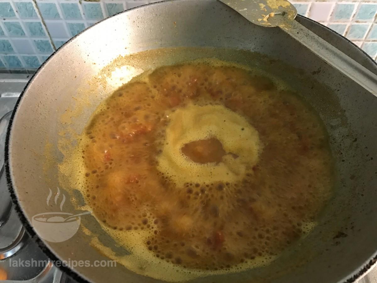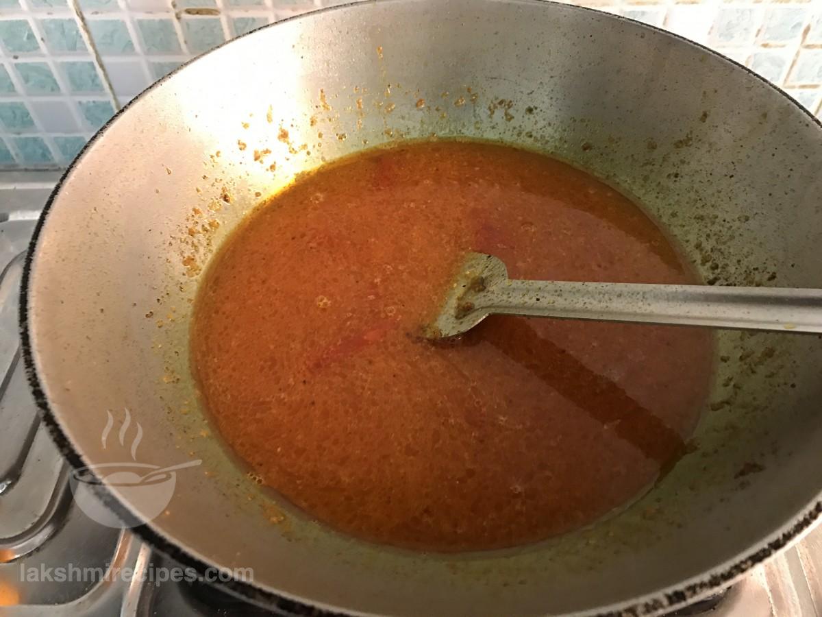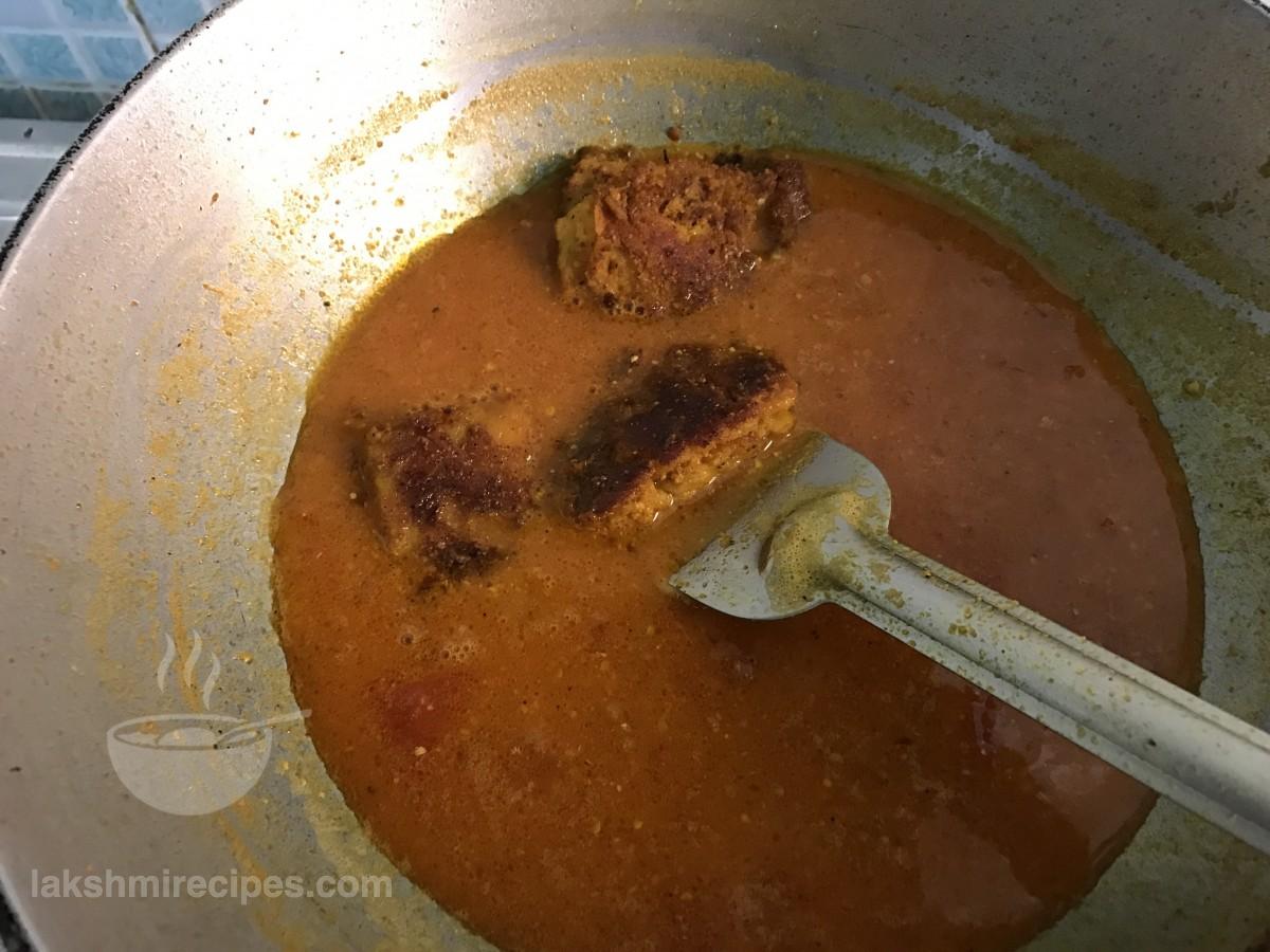 - ग्रेवी में उबाल आने दें, और फिर आंच को कम कर दें। 2 मिनट के लिए बेसना की मछली की ग्रेवी को कम आंच पर पकाएं और फिर गैस बंद कर दें। बेसन की मछली के लिए ग्रेवी तैयार है।