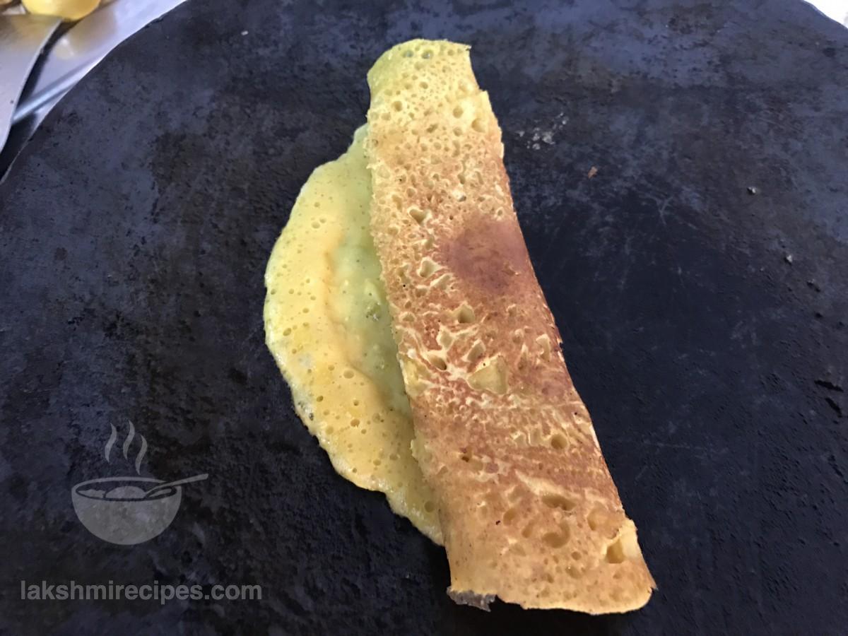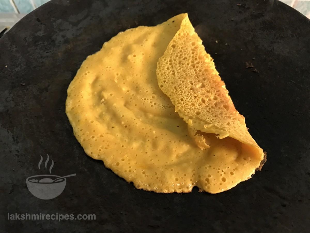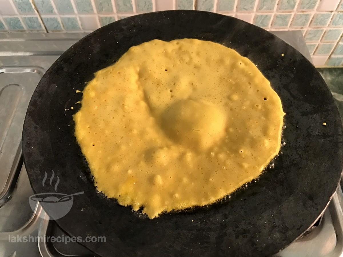 - फिर एक गोल कलछुल से चरण 2 में तैयार किए गये बैटर को तावा पर डालें और एक गोल डिस्क या चीले के रूप में इसे कलछुल के पिछे वाली तरफ से फैला दें। आंच को मध्यम स्तर तक कम कर दें।