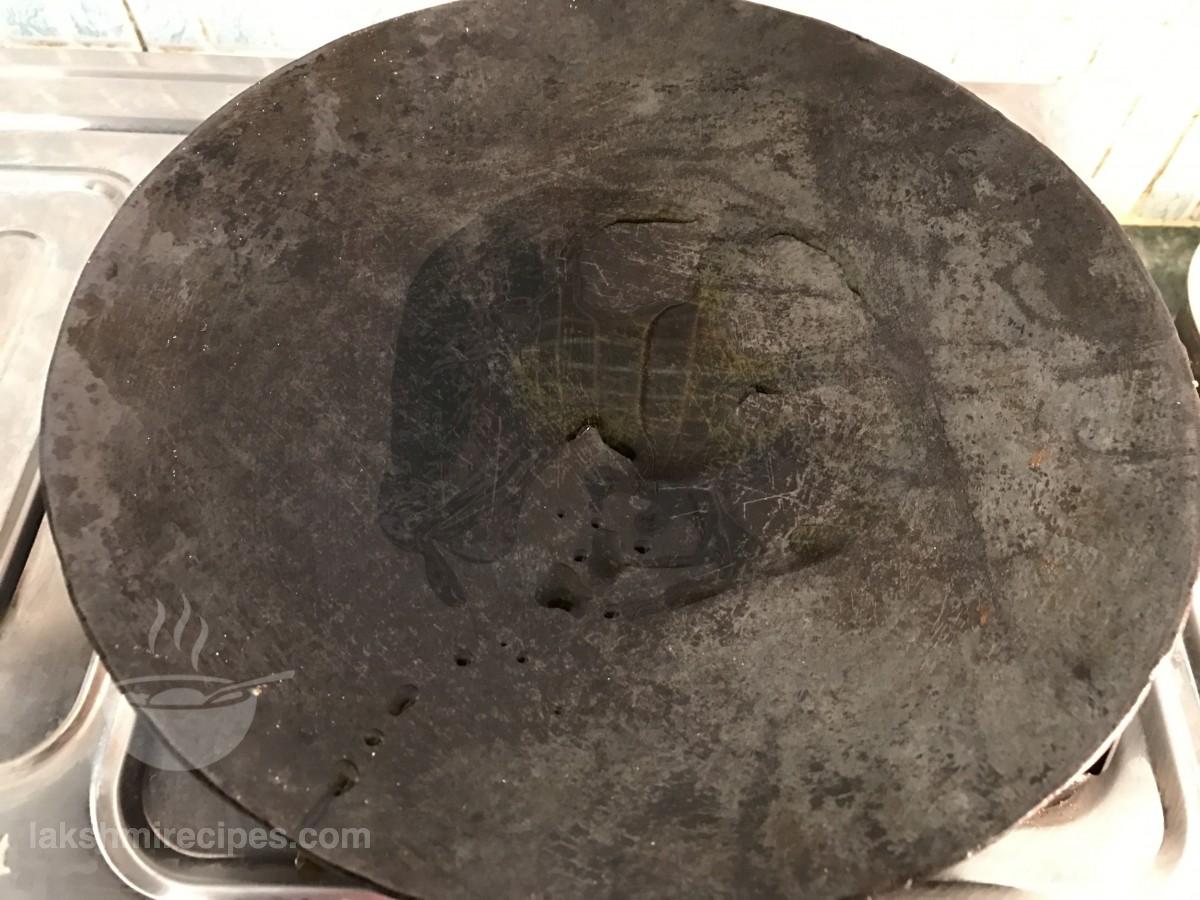 - Now heat a tawa or non-stick pan and pour 1 table spoon mustard oil over it. Spread the oil nicely all over the tawa or non-stick pan.