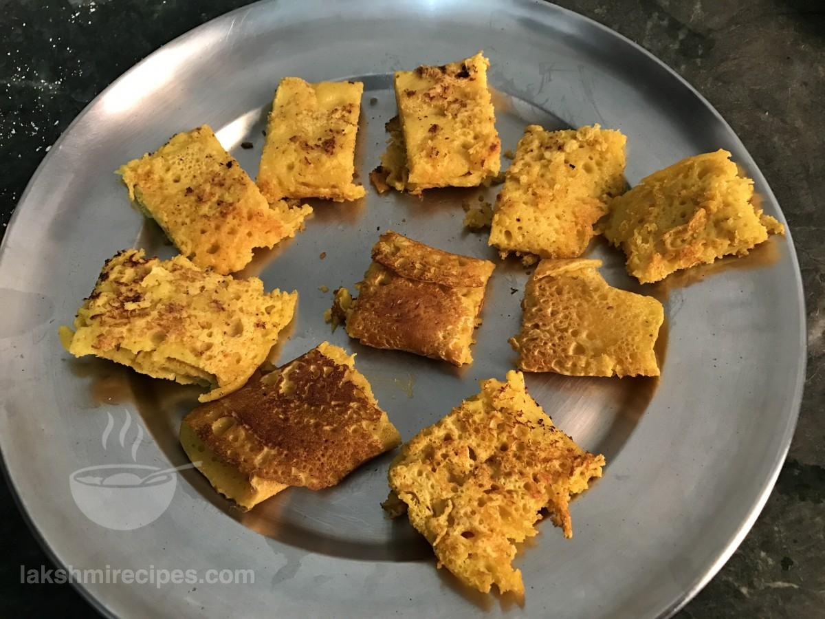 - Then lift and fold it, starting from one end (as shown in the images below). Remove the prepared besan roll to a plate. Prepare similar rolls of the remaining batter in the same way and keep them in a plate.