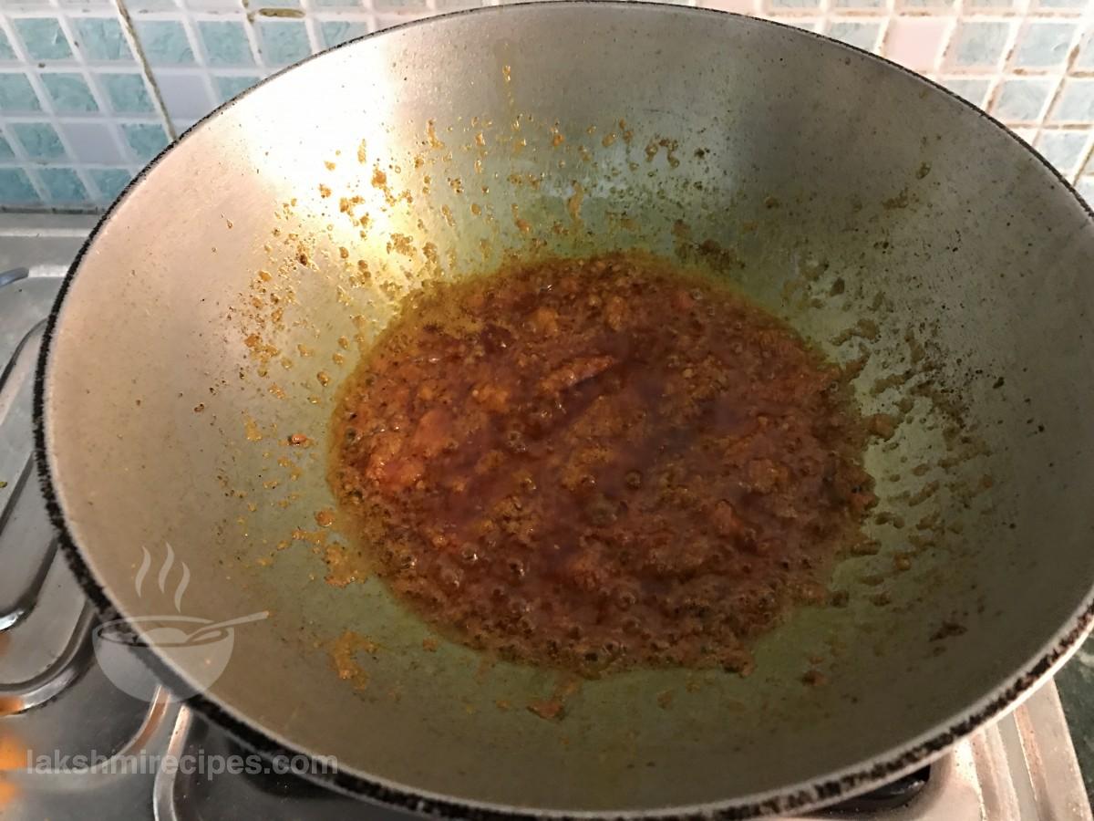 - फिर कढ़ाई में शेष मसाले का मिश्रण डालें। लगातार चलाते हुए मसाले के मिश्रण को पकाएं।