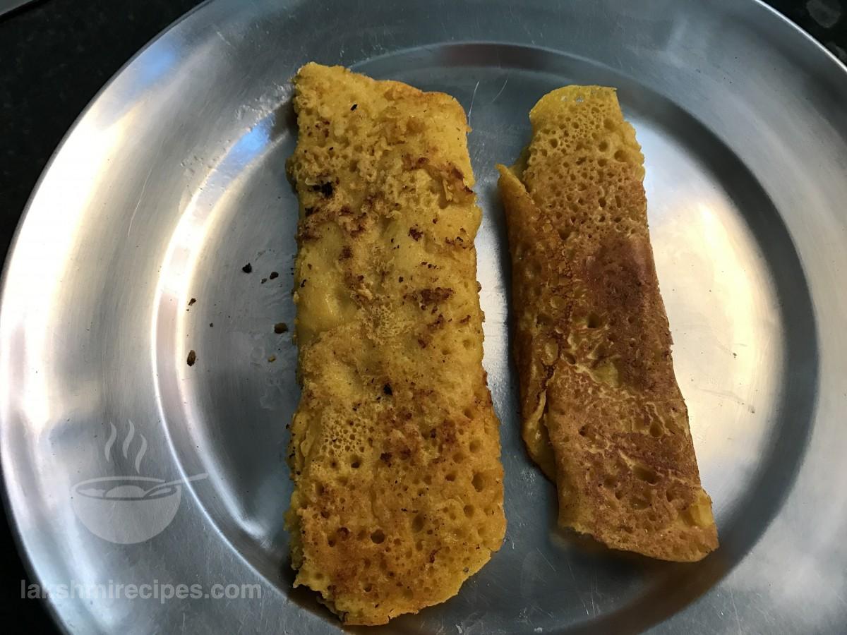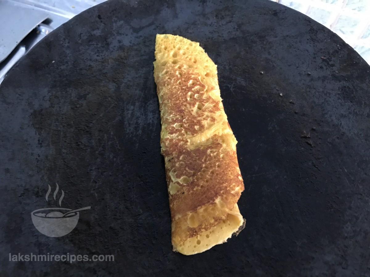 - उसके बाद एक तरफ से मोड़ना शुरू करें (जैसा कि नीचे दी गई छवियों में दिखाया गया है)। प्लेट के तैयार बेसन रोल को निकालें उसी तरह शेष बैटर के समान रोल तैयार करें और उन्हें प्लेट में रखें।