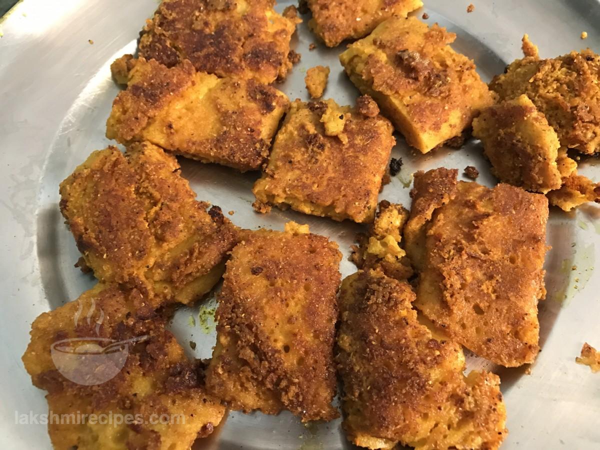 - Flip each of them carefully to shallow fry the other side in the same way. Add more oil if needed. When both the sides of all pieces turns crispy red then transfer these shallow fried pieces (or pieces of besan ki machhli) to a plate.