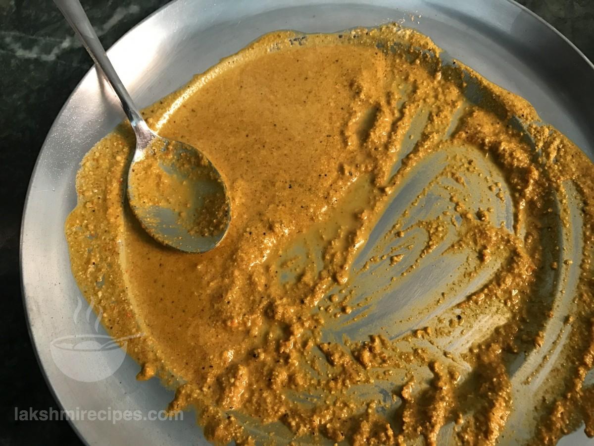 - Add the fine paste of yellow mustard seeds and garlic petals and salt as per taste to this plate. Mix the spices and all the ingredients together nicely. Then keep this mixture aside to be used later for making Besan Ki Machhli.