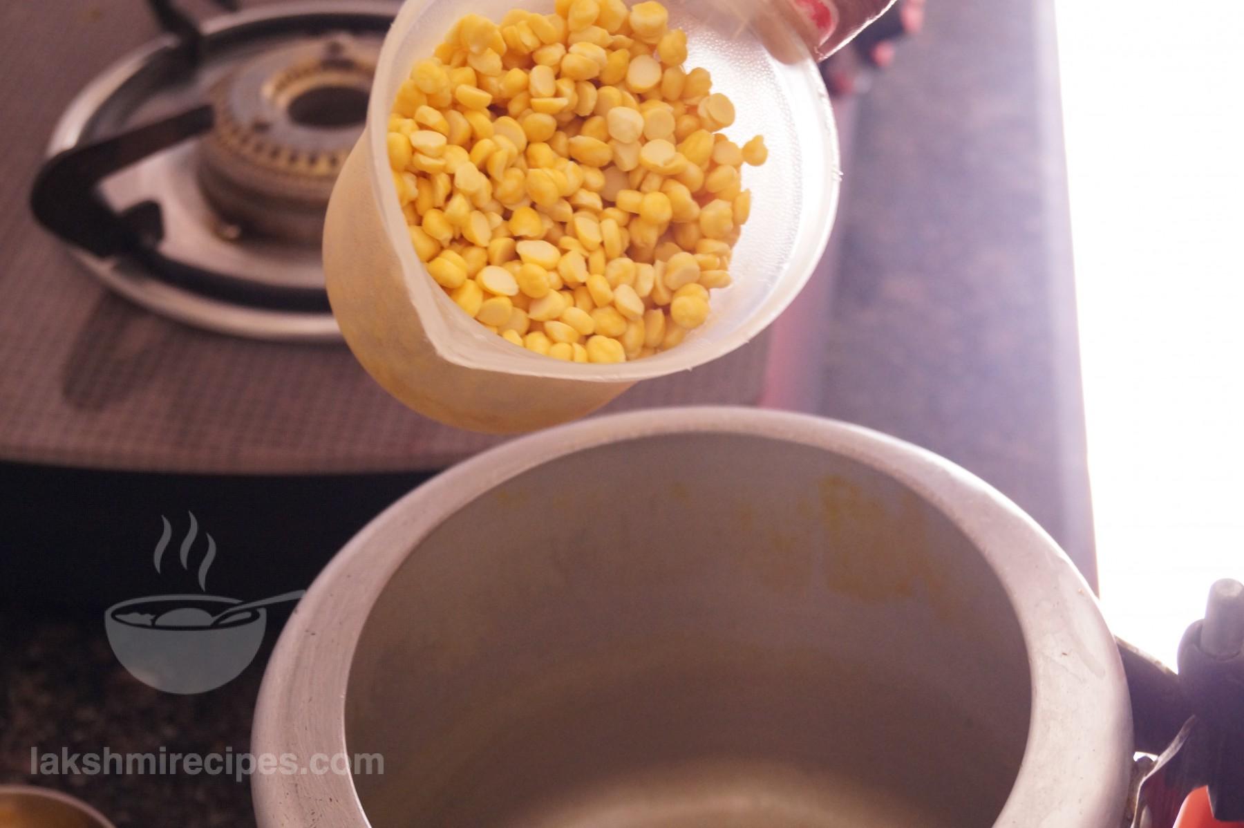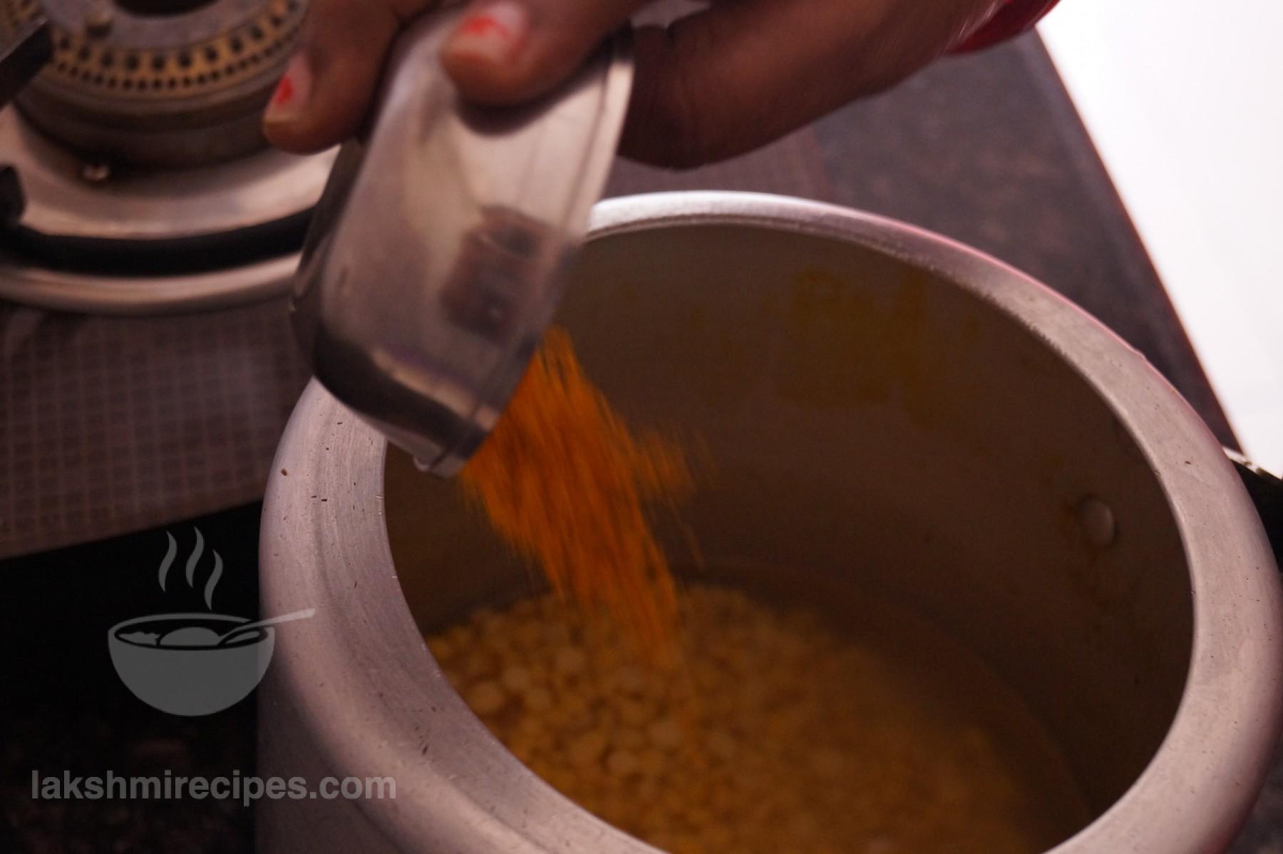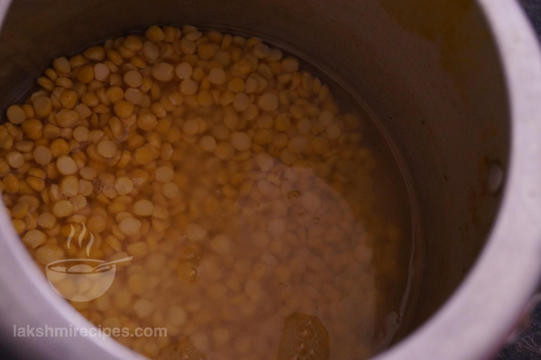 - In a pressure cooker put the bengal gram (chana dal) and 1 cup water. To it add the turmeric powder (haldi powder) and salt to taste. Pressure cook the dal for 1 whistle on high flame. Lower the flame and cook it for further 7 minutes. Then turn off the flame and allow it to cool.